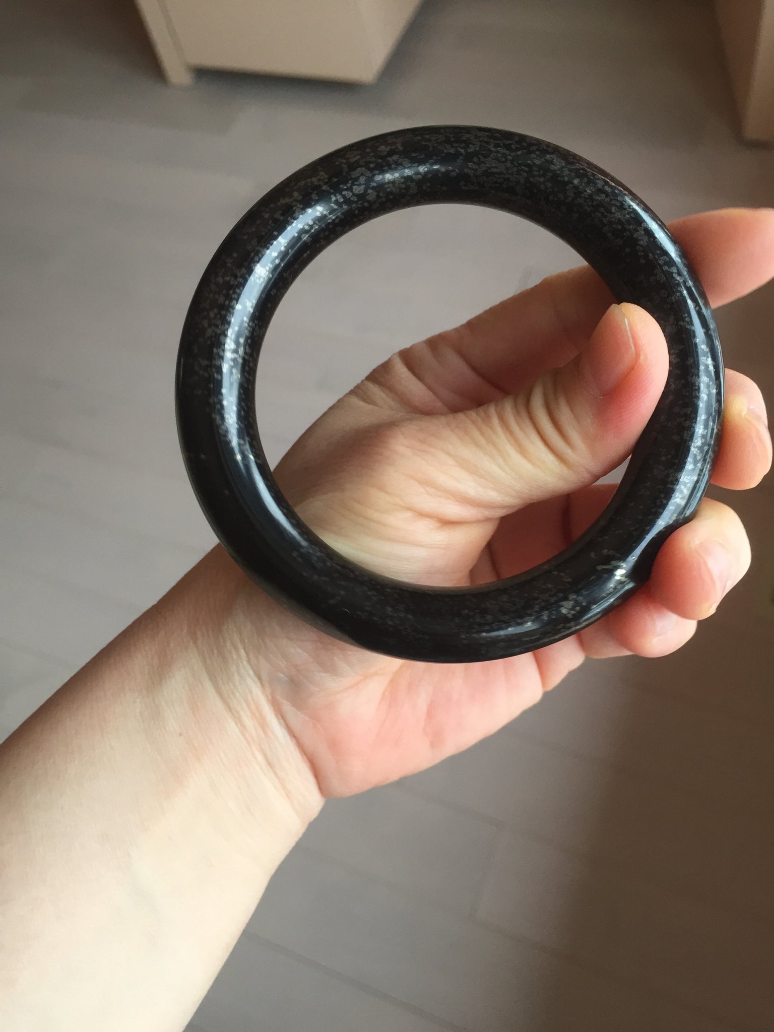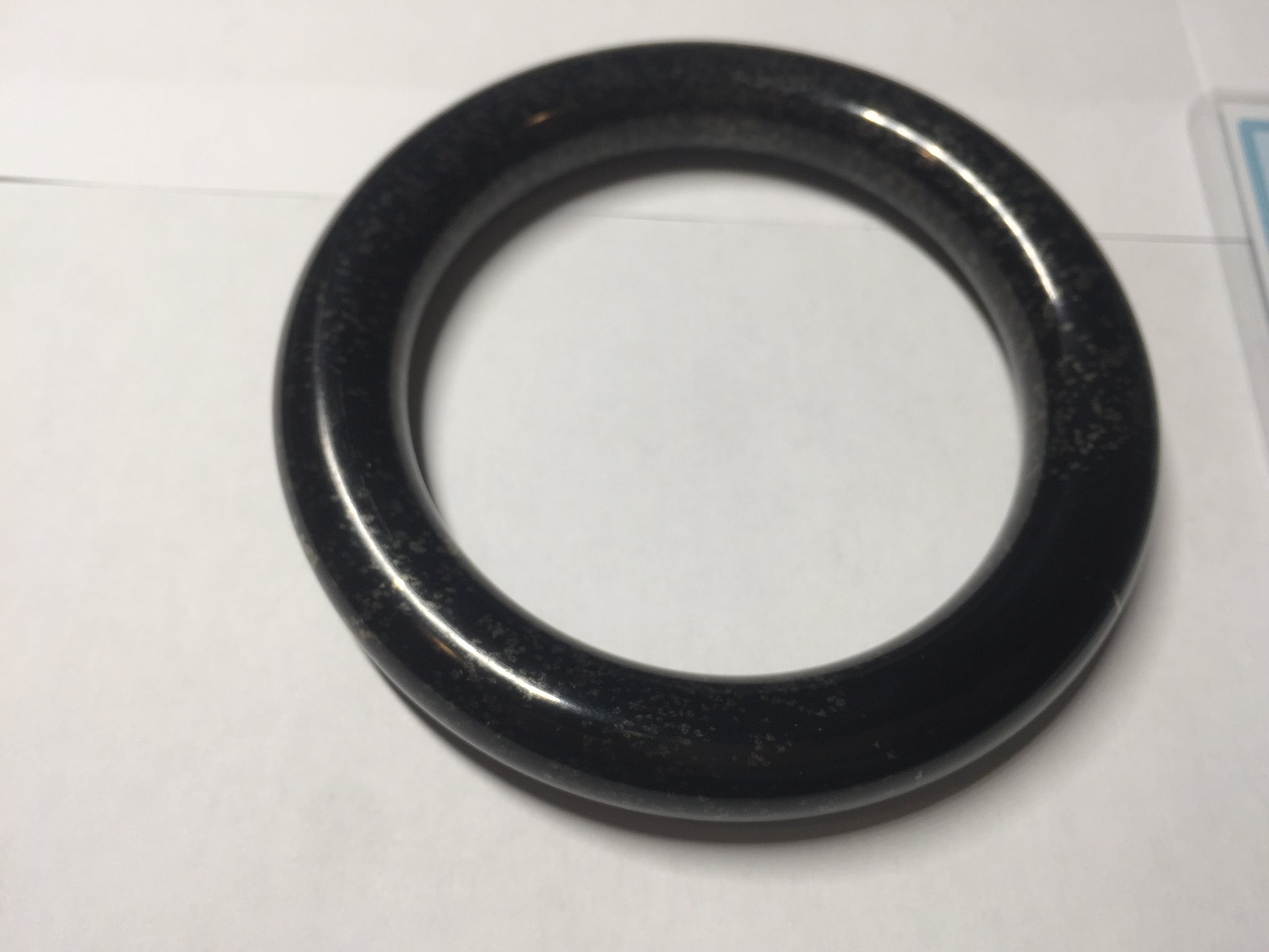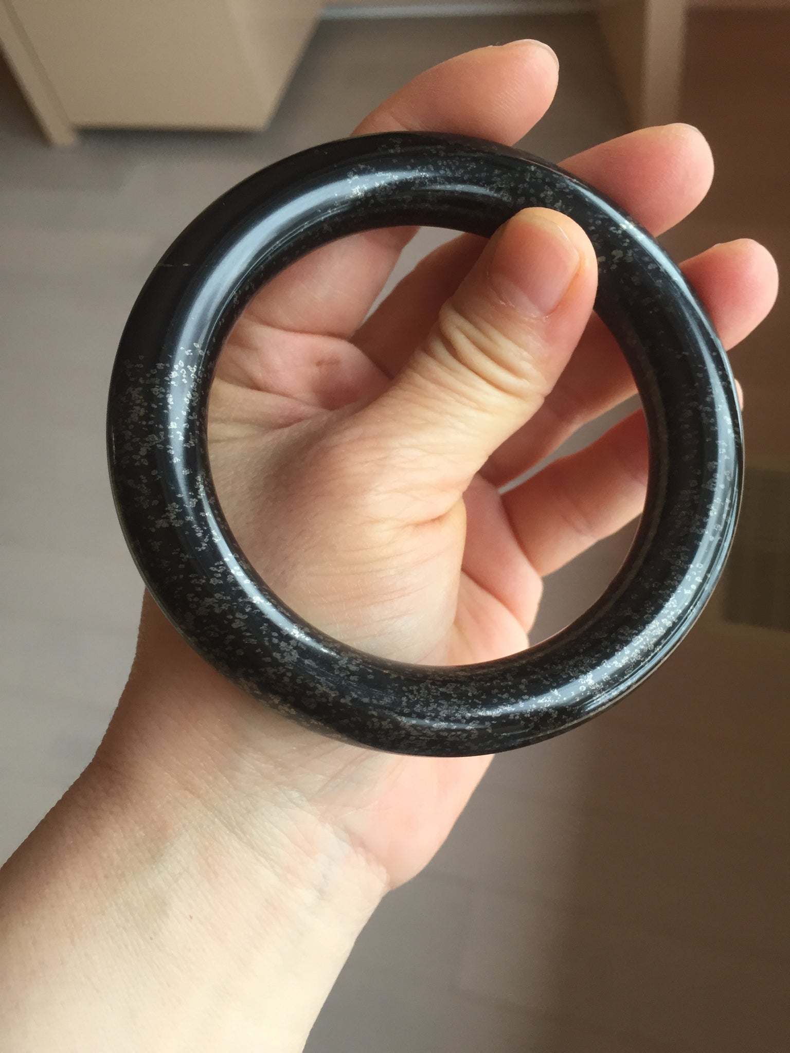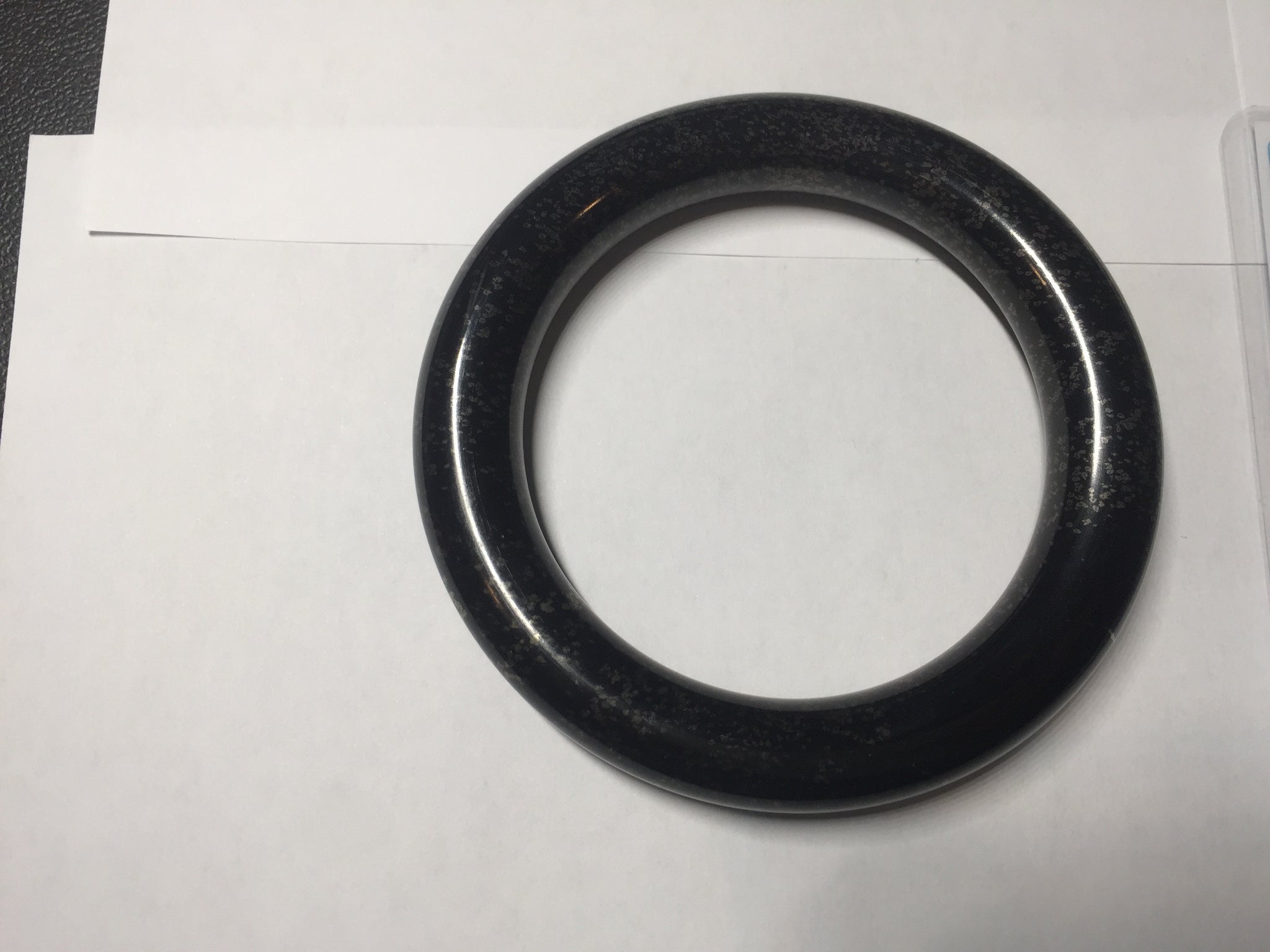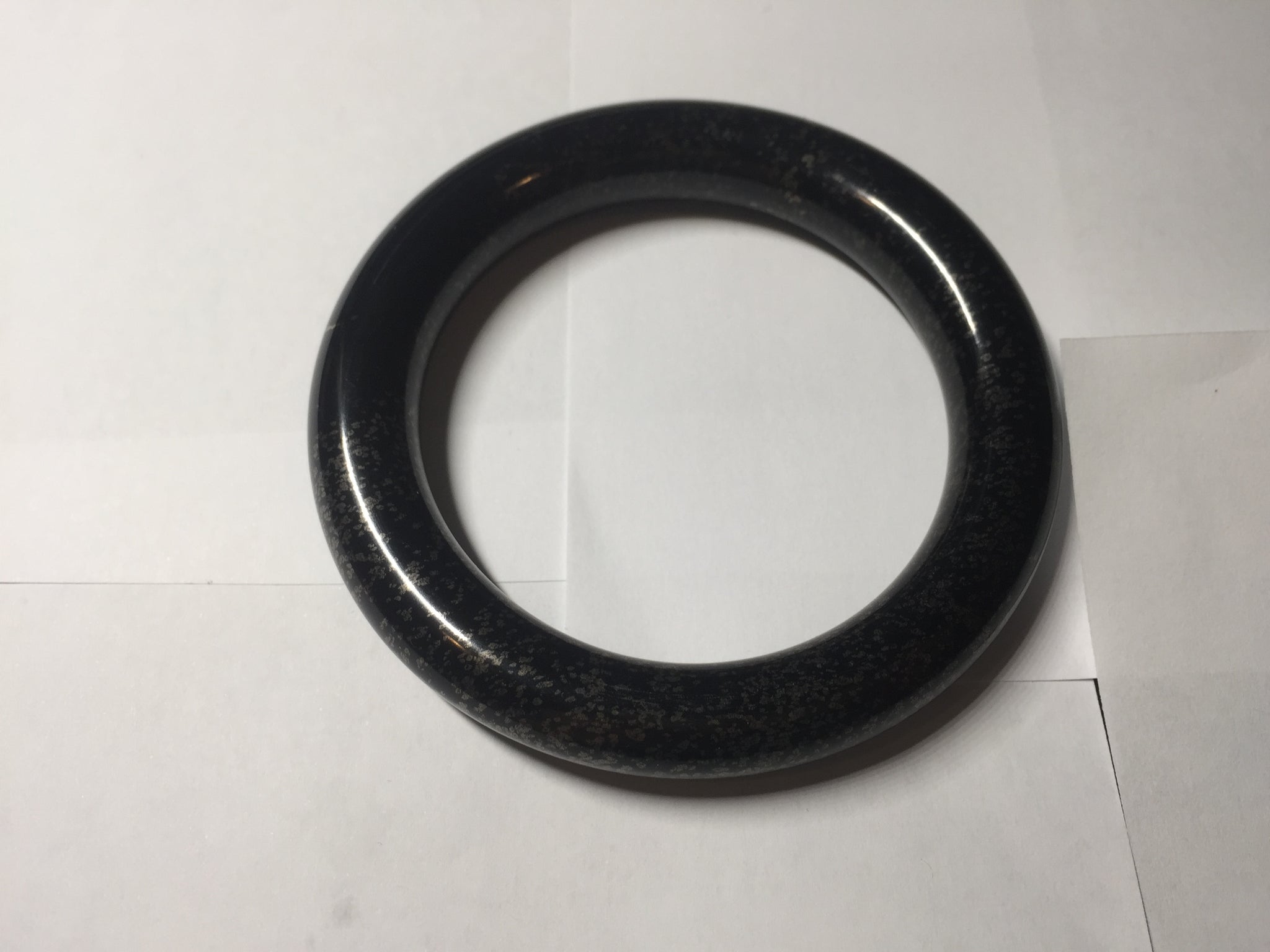 62.5/12.7/12.5mm chubby round cut. Weight: 92.30g. With black color and some scattered dim brown/golden metal specks.