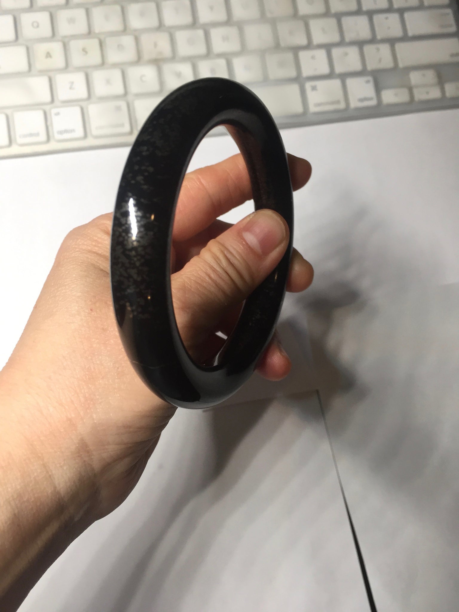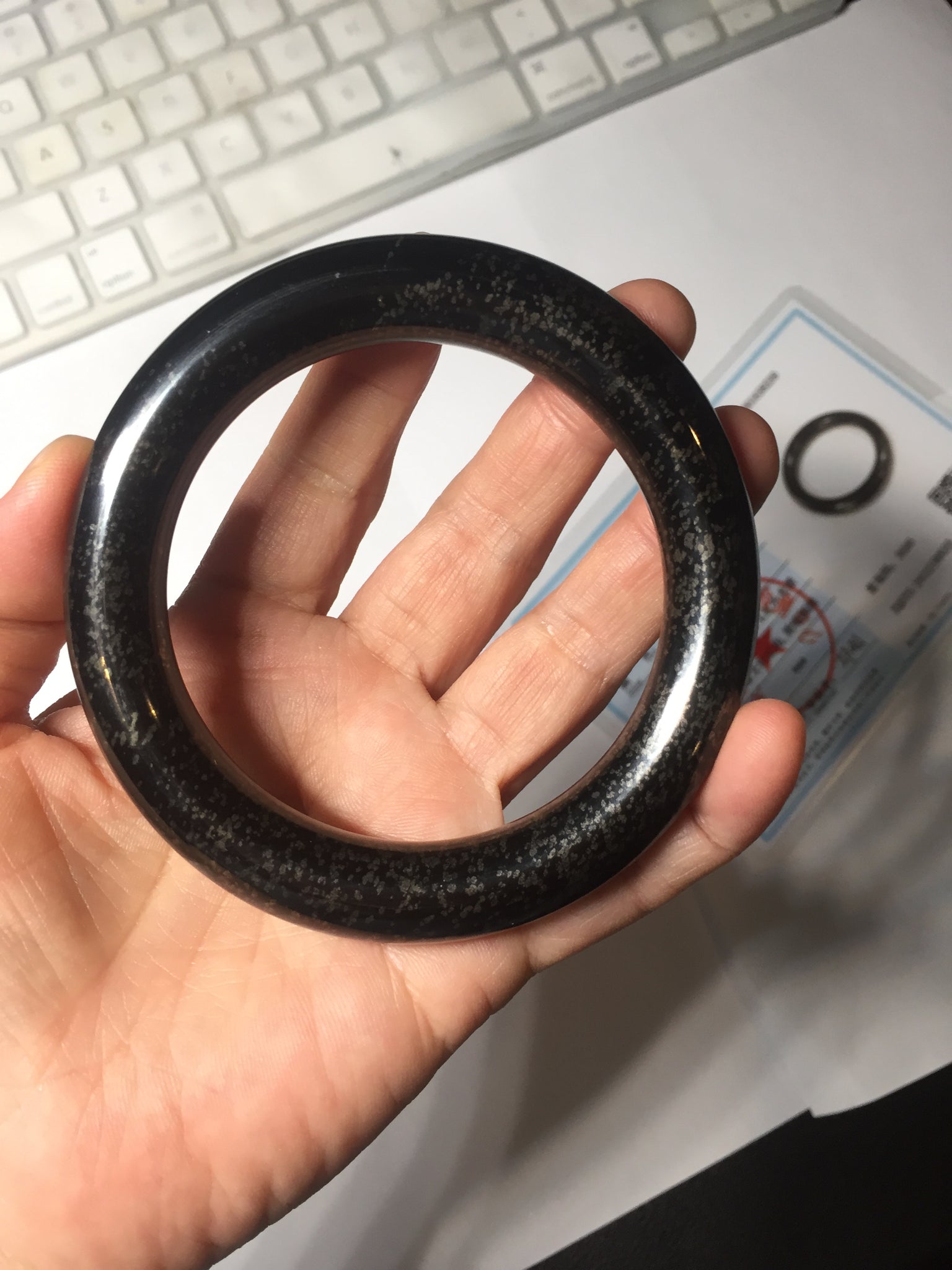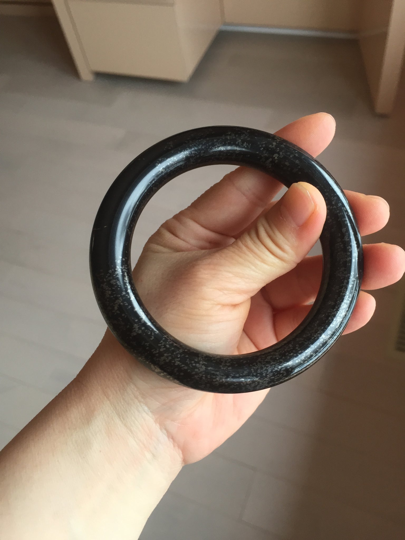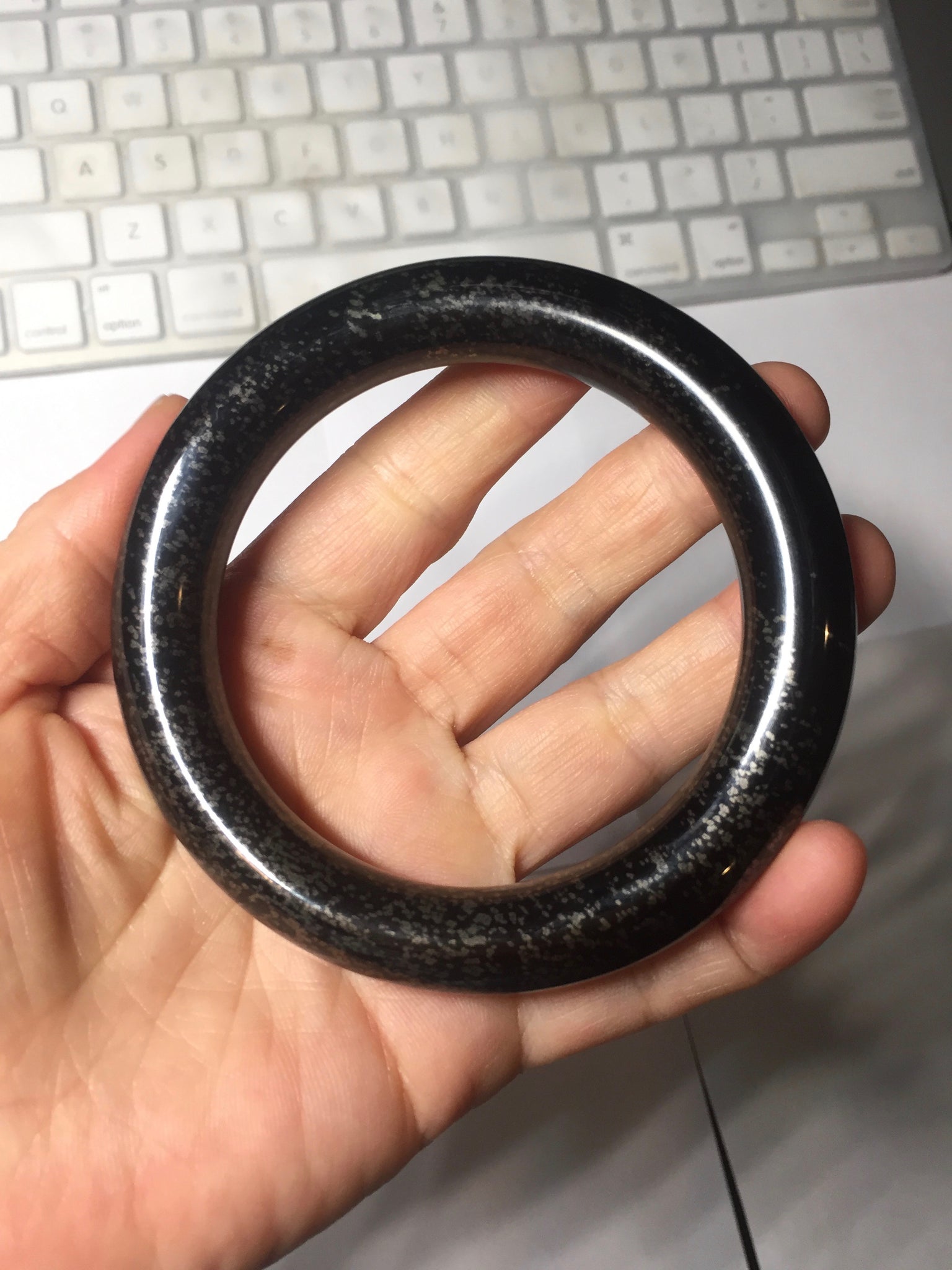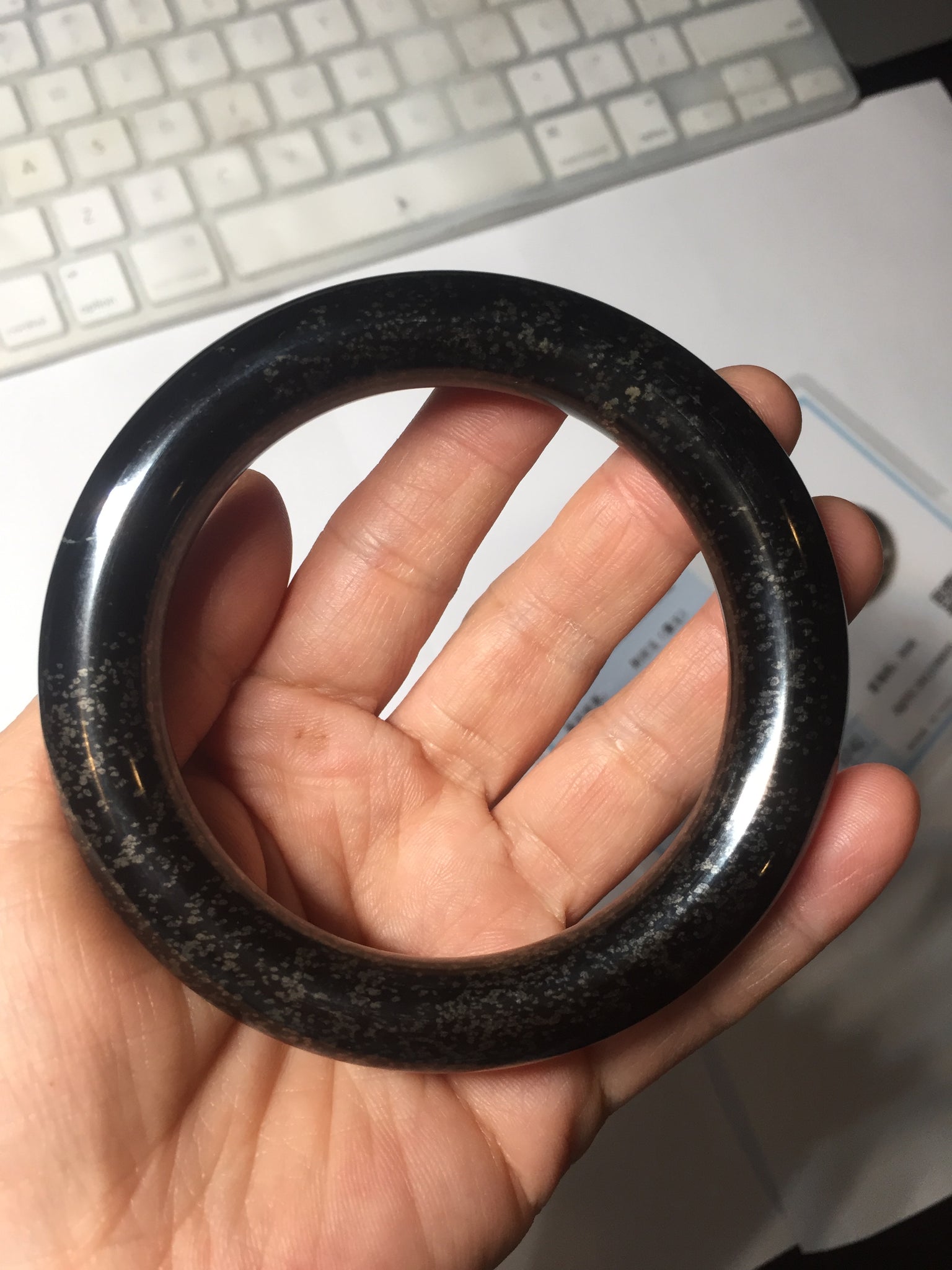 62.5/12.7/12.5mm chubby round cut. Weight: 92.30g. With black color and some scattered dim brown/golden metal specks.