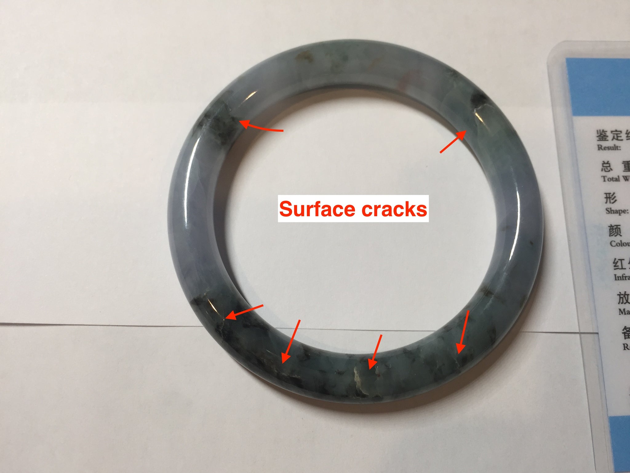 Some cracks. The bangle is still solid(Guaranteed). Quite a lot of hairlines(Photos can't show all). Some rough surfaces with surface fissures or chips. Some cotton spots, cotton lines, and cotton areas. The purple is lighter than in the photos due to the purple color always more camera friendly.