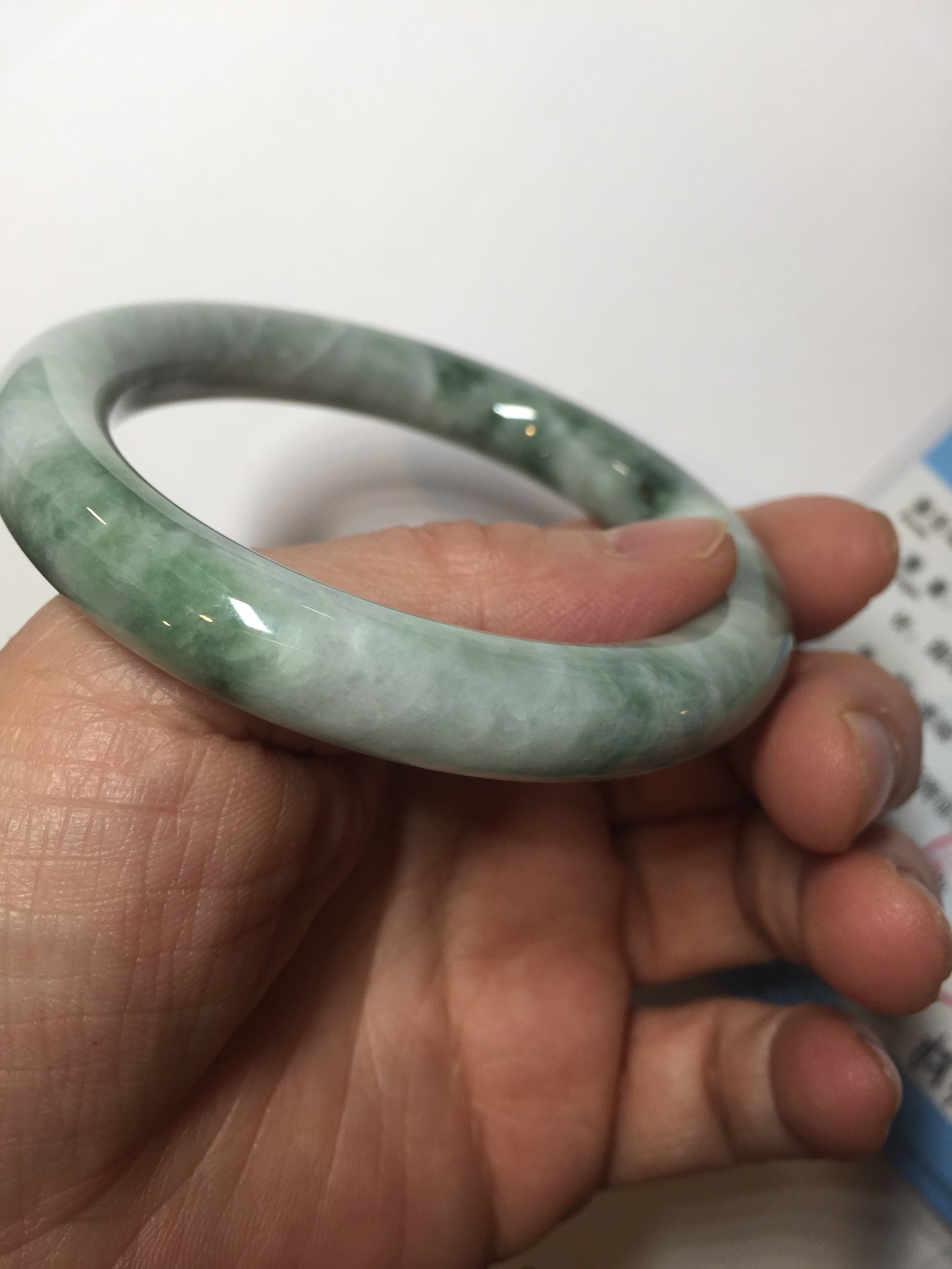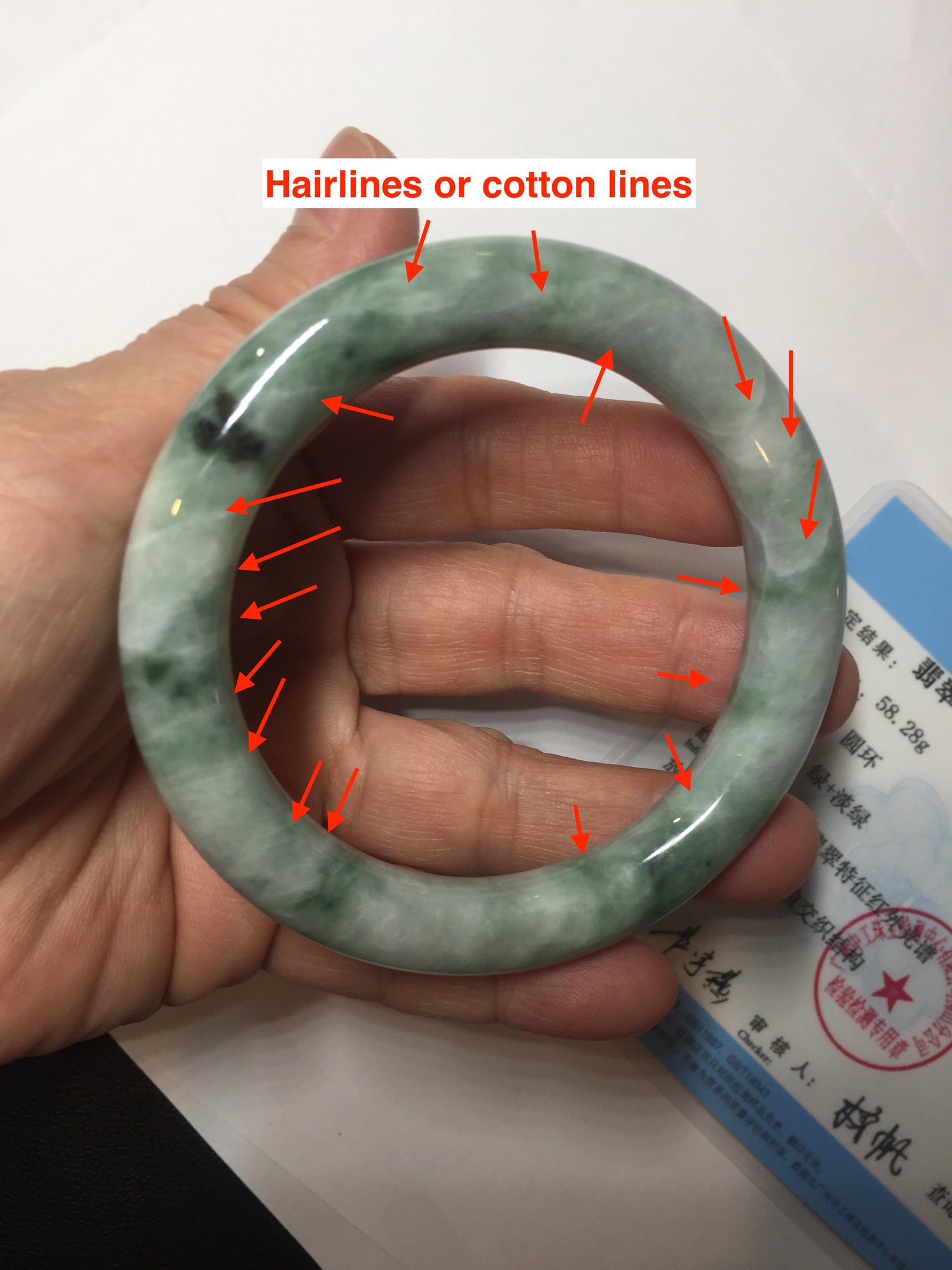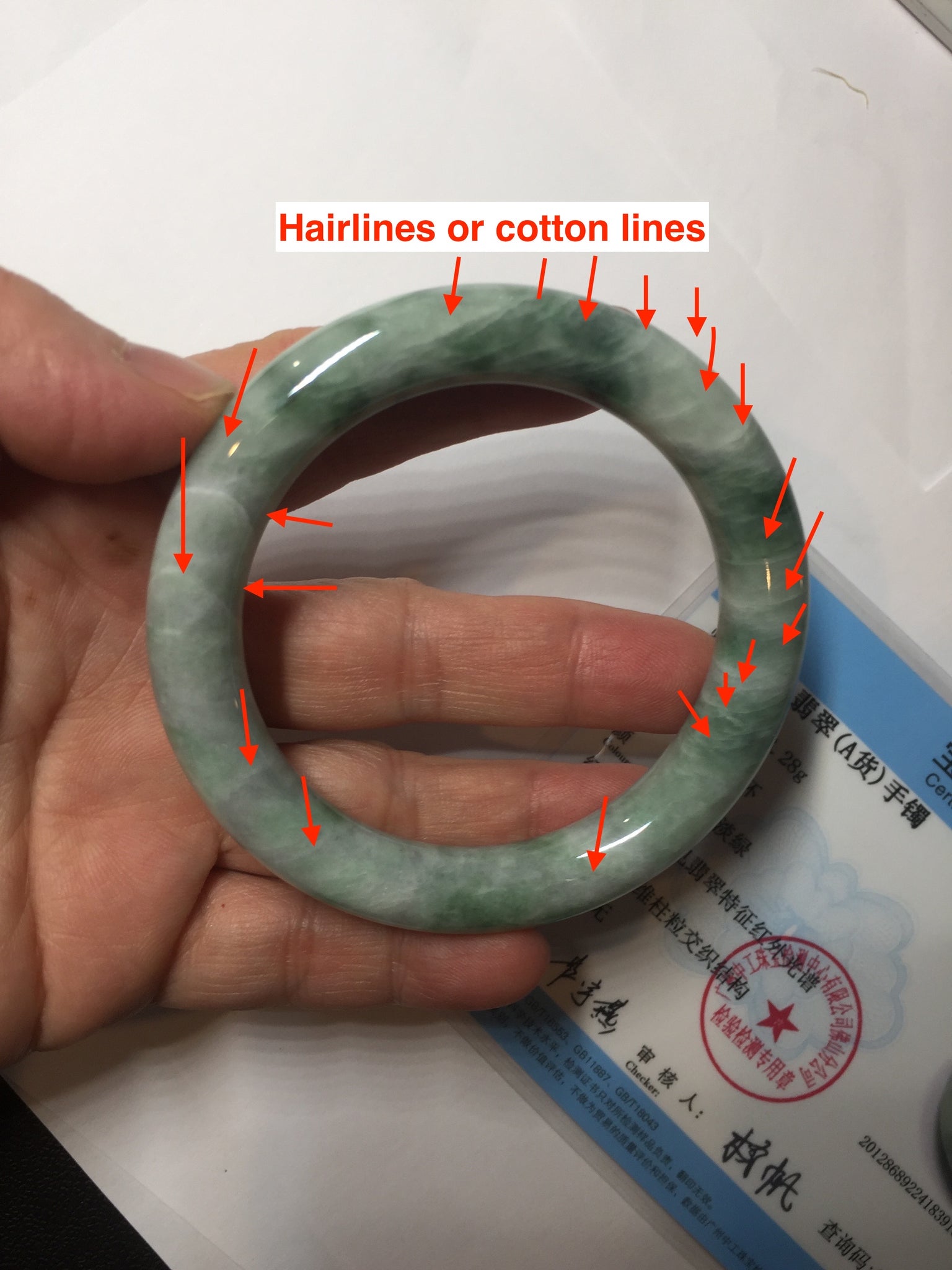 May have surface fissures. Quite a lot of hairlines or cotton lines. The bangle is solid. Some small rough surfaces. Some small rough surfaces may come across hairlines or cotton lines. They are not cracks. Some cotton areas, and cotton spots. Not transparent.