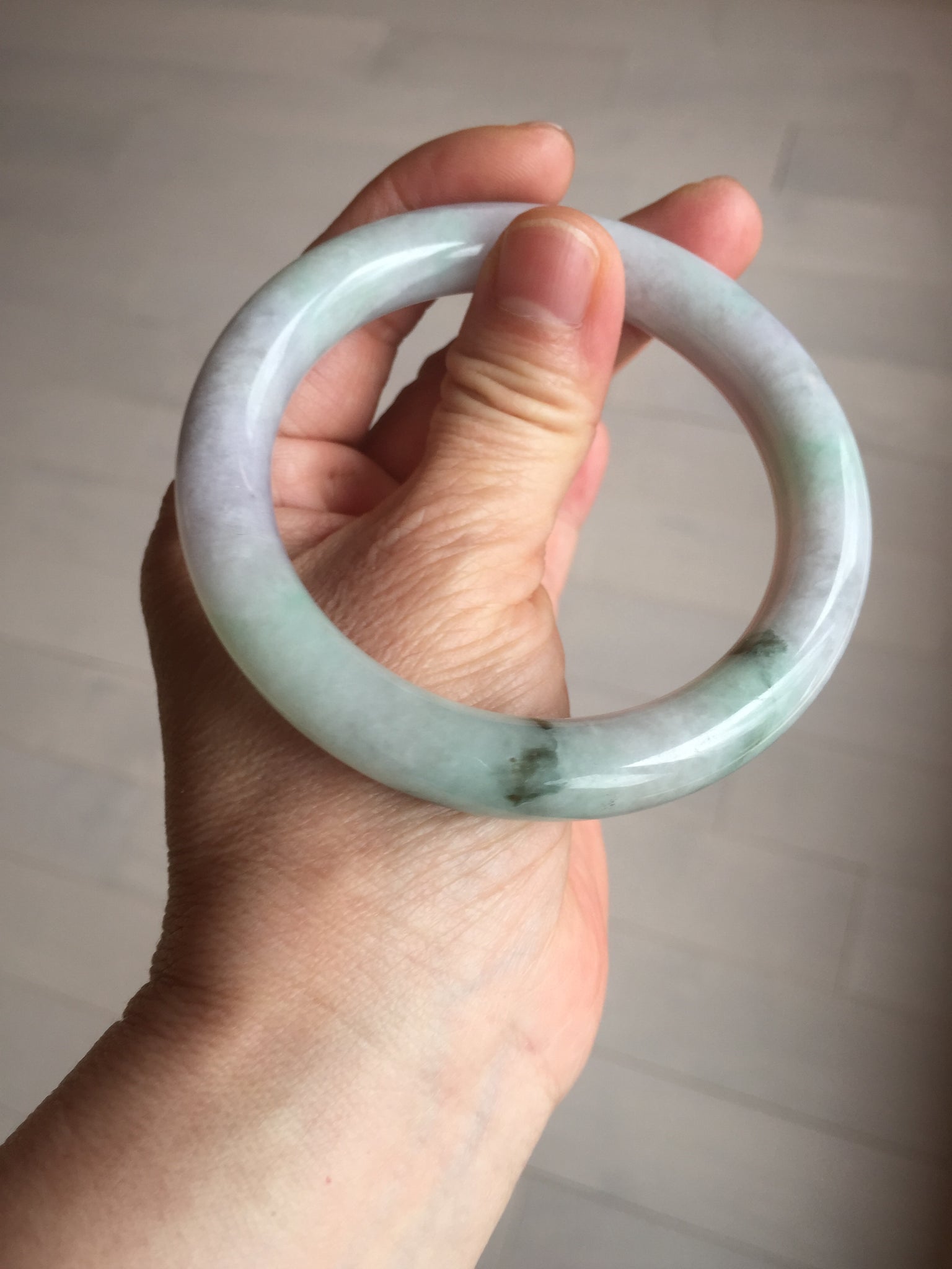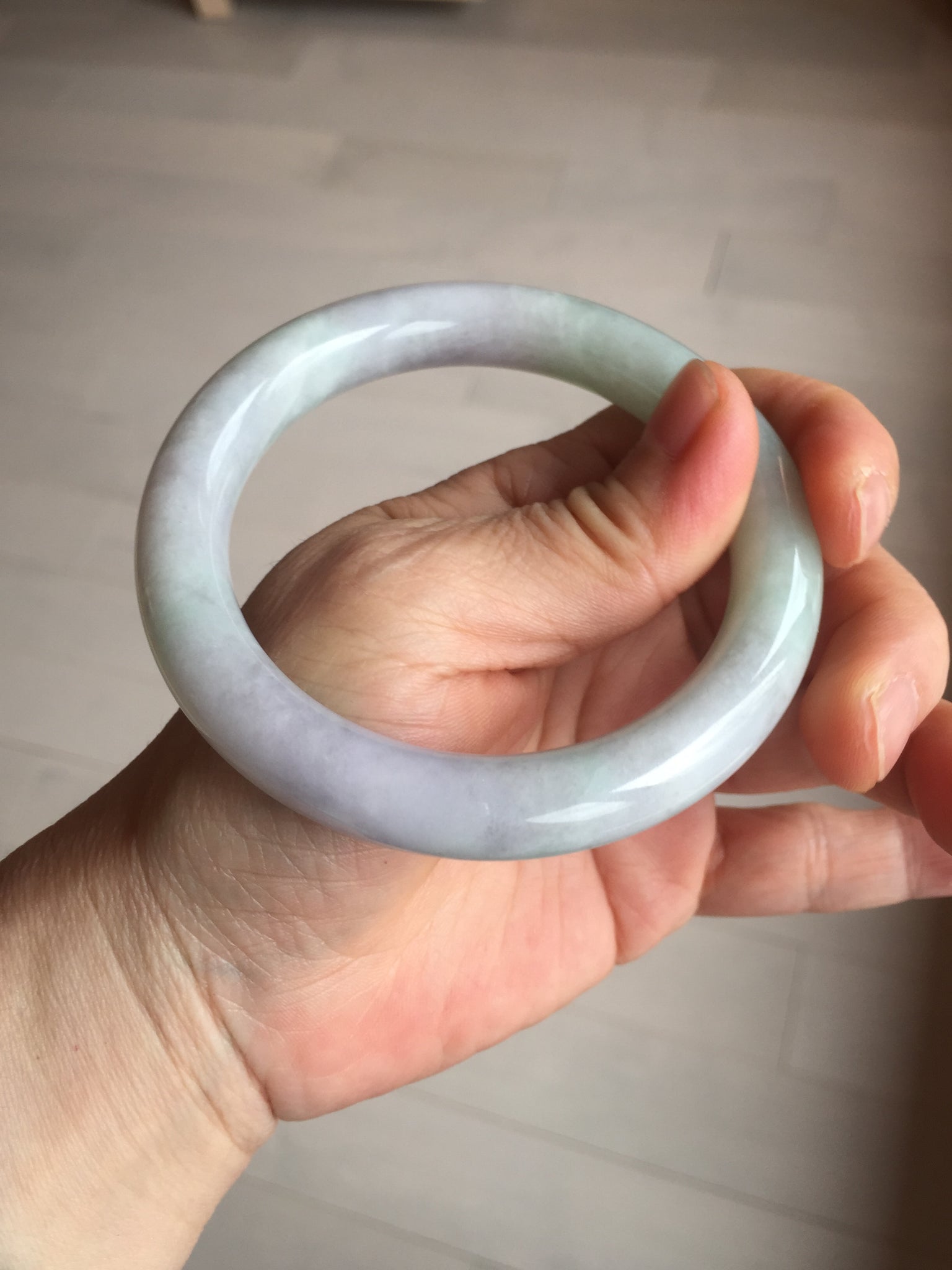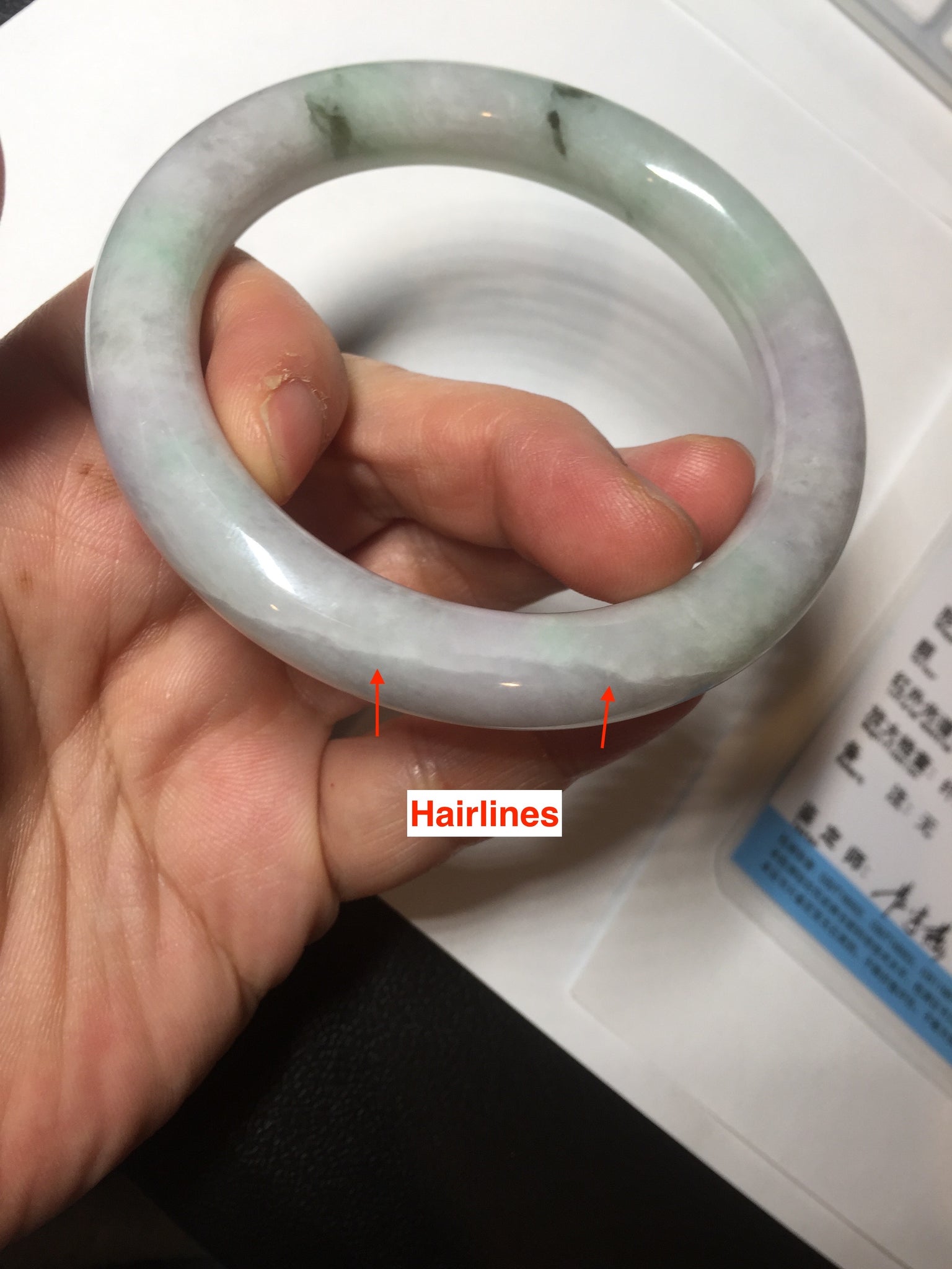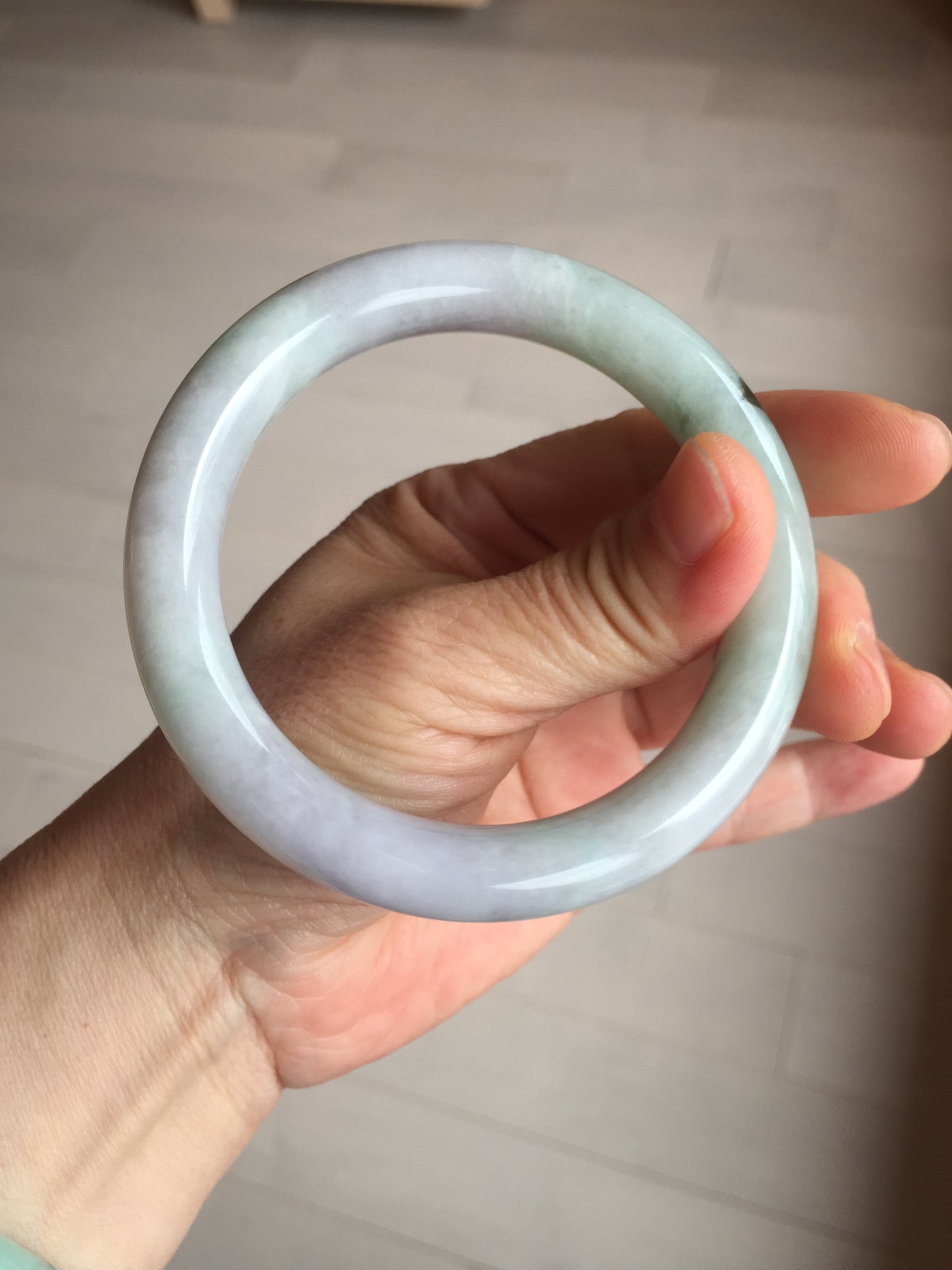 Some small cracks. The bangle is solid. Some hairlines. Some cotton lines, spots, and areas. Not transparent. Not watery. The purple is lighter than in the photos due to the purple color always being more camera-friendly.