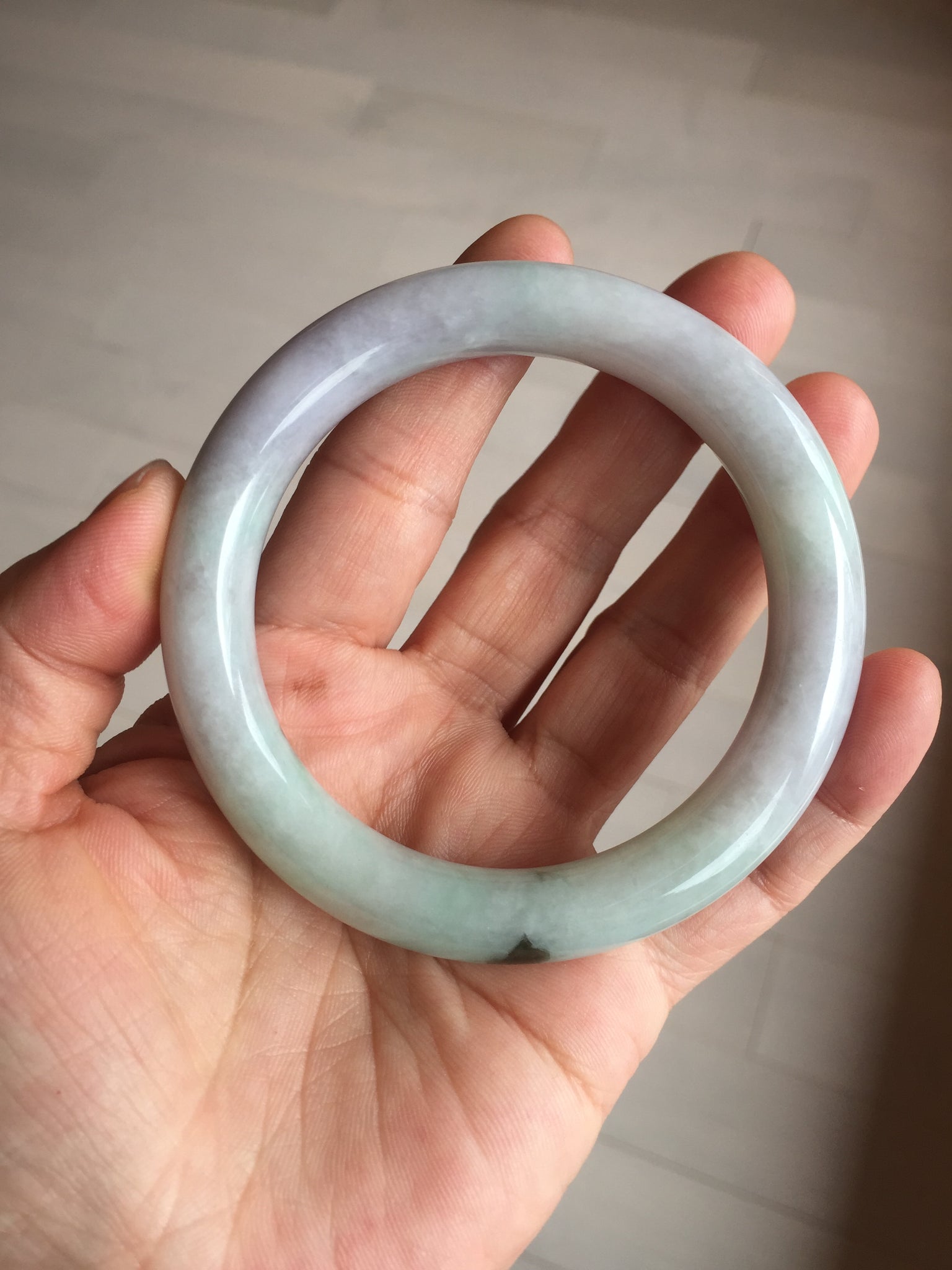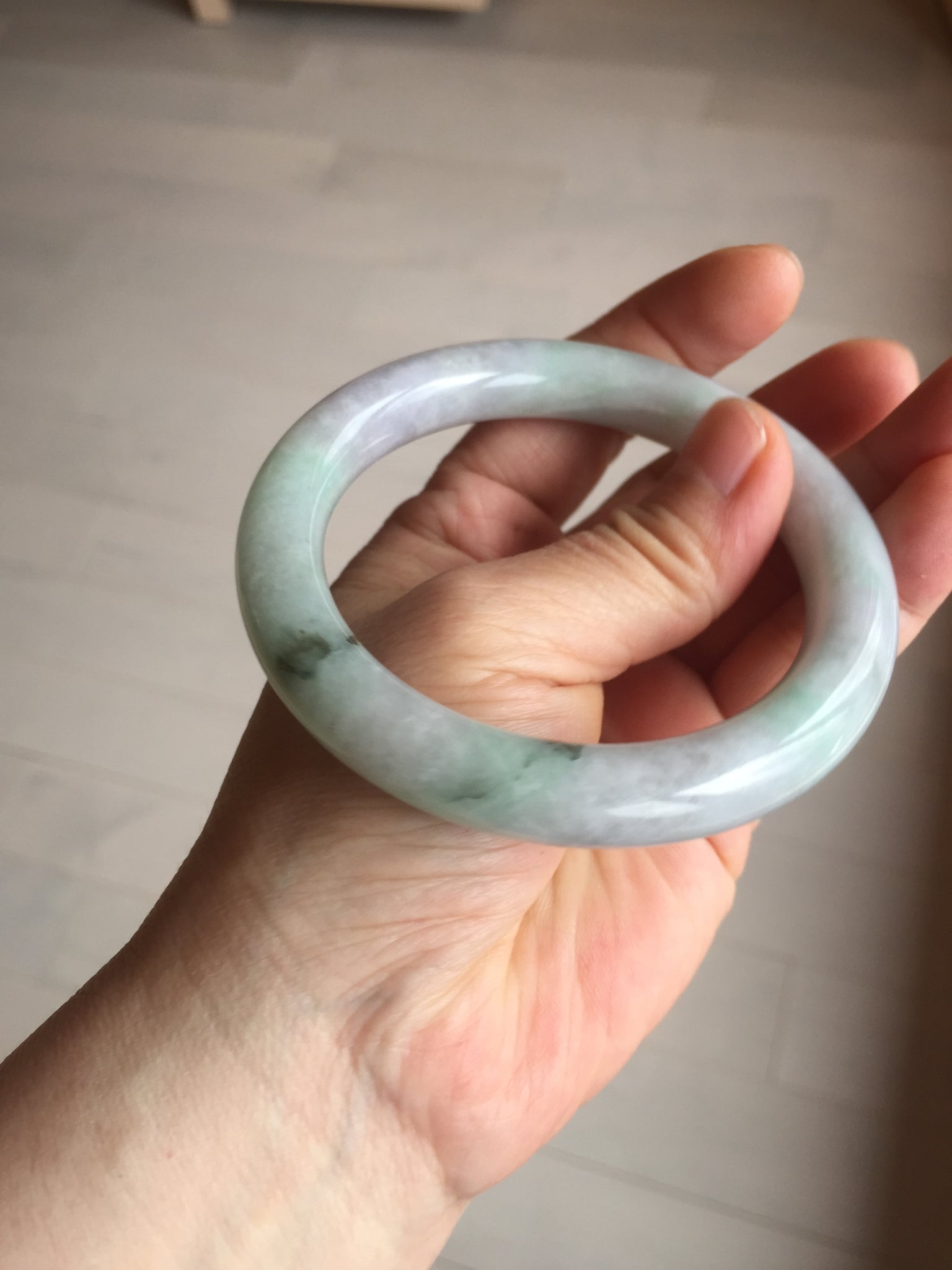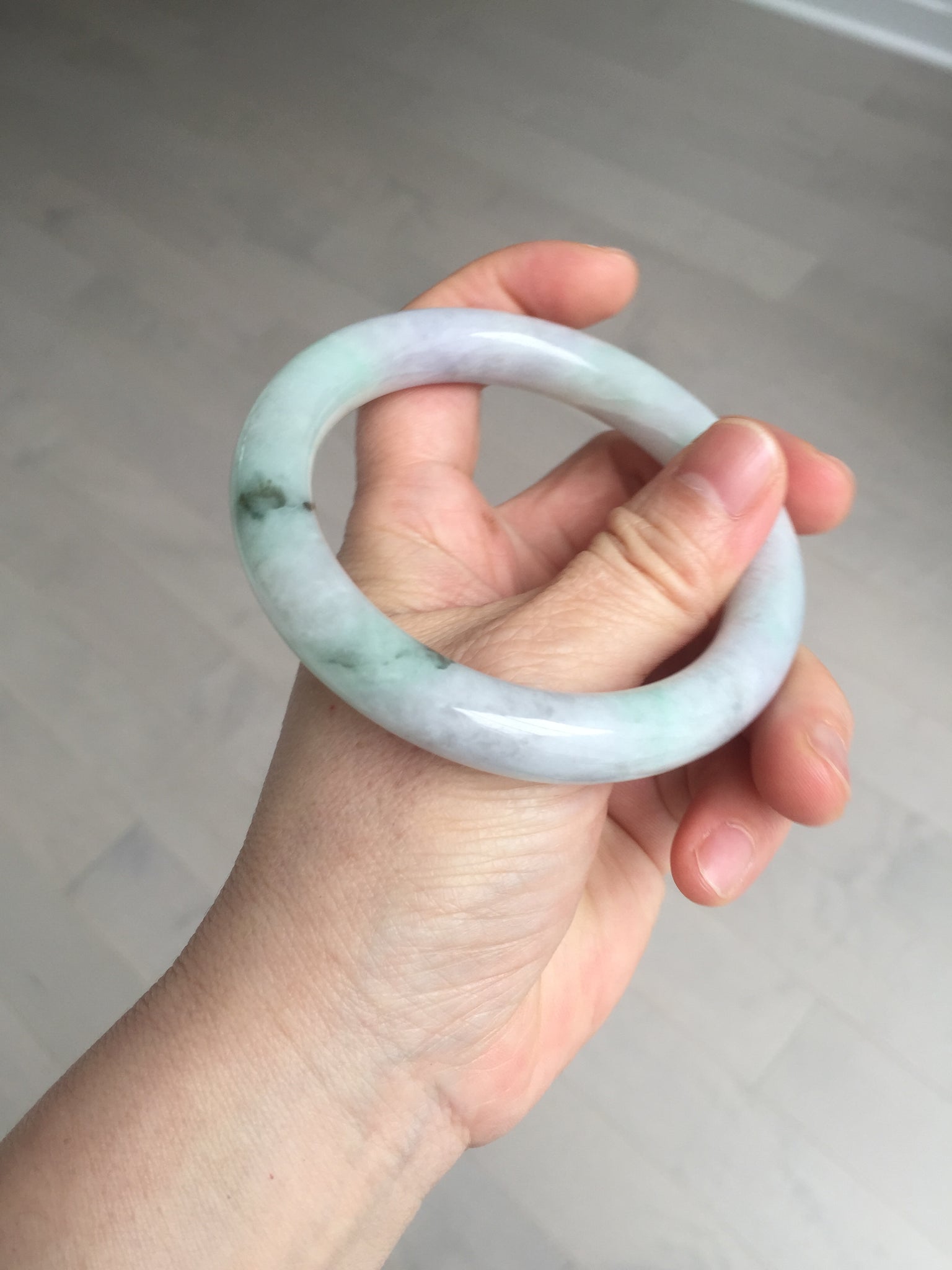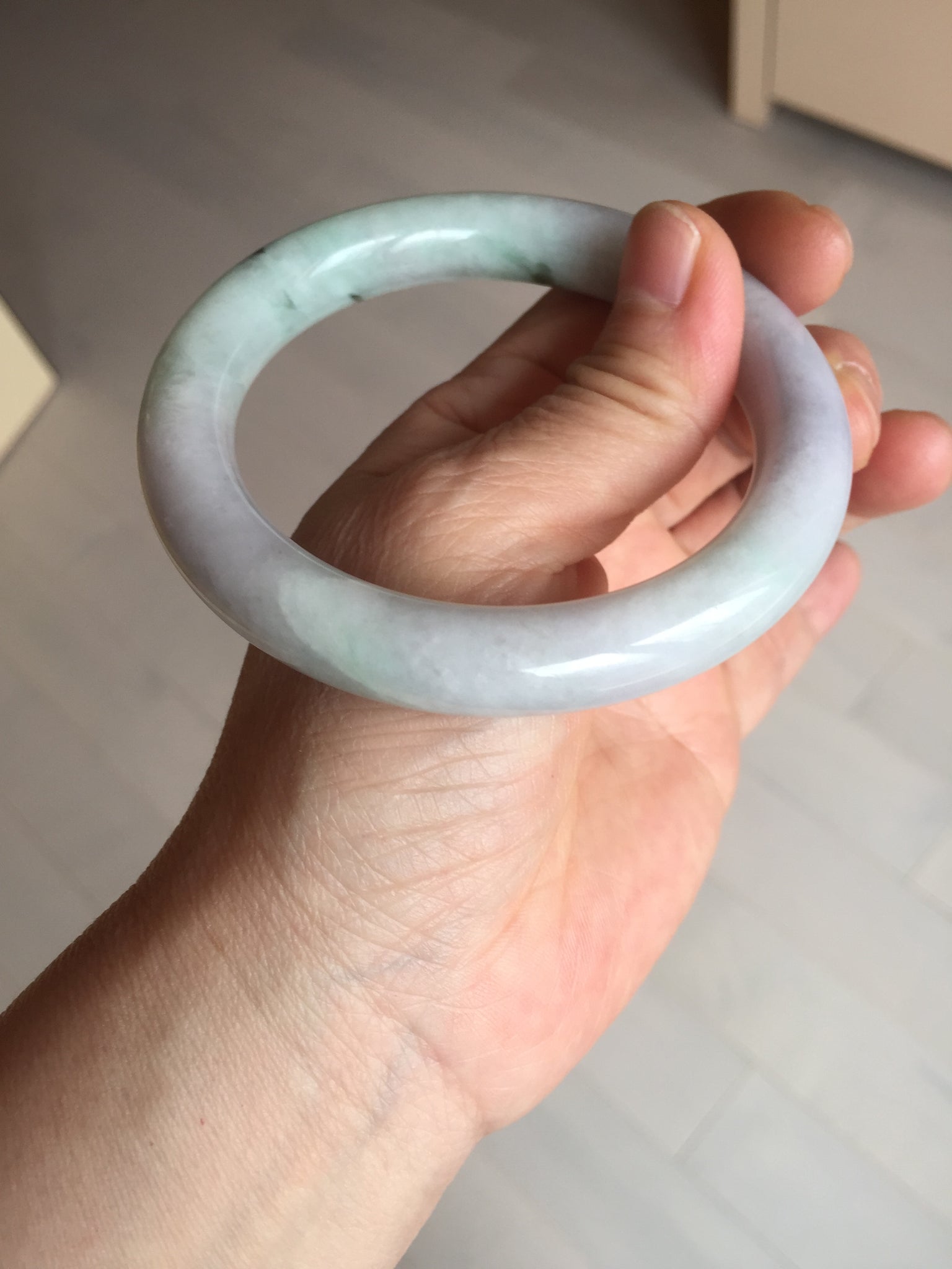 Some small cracks. The bangle is solid. Some hairlines. Some cotton lines, spots, and areas. Not transparent. Not watery. The purple is lighter than in the photos due to the purple color always being more camera-friendly.