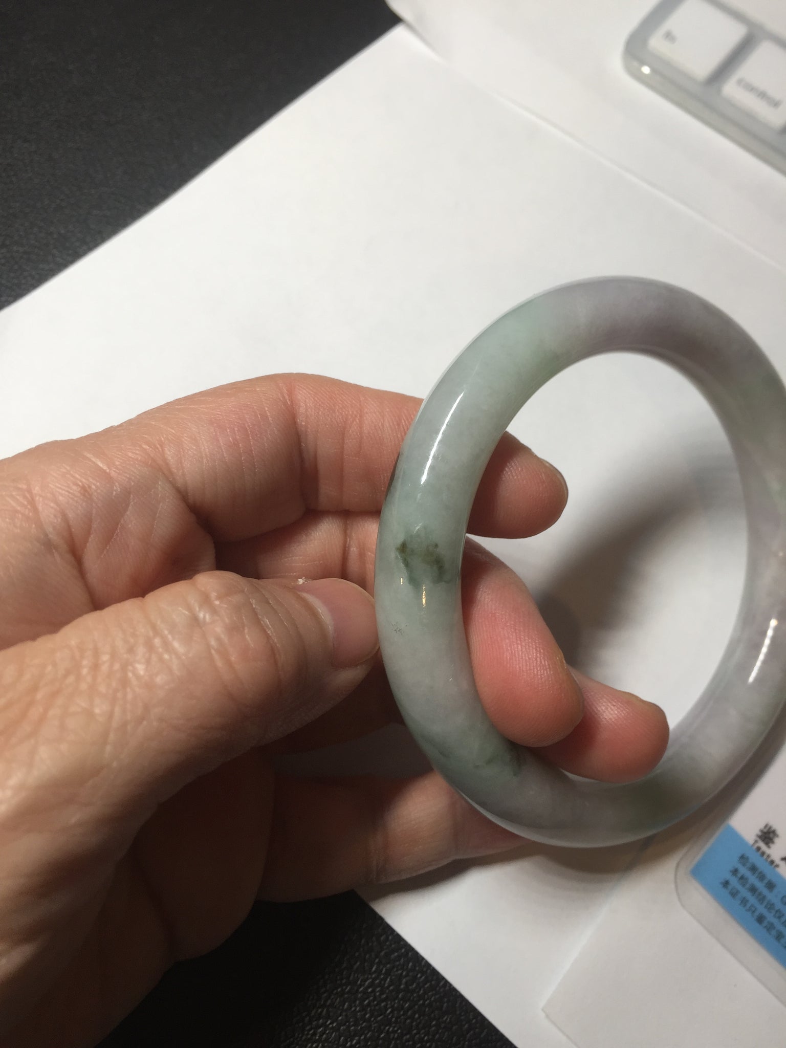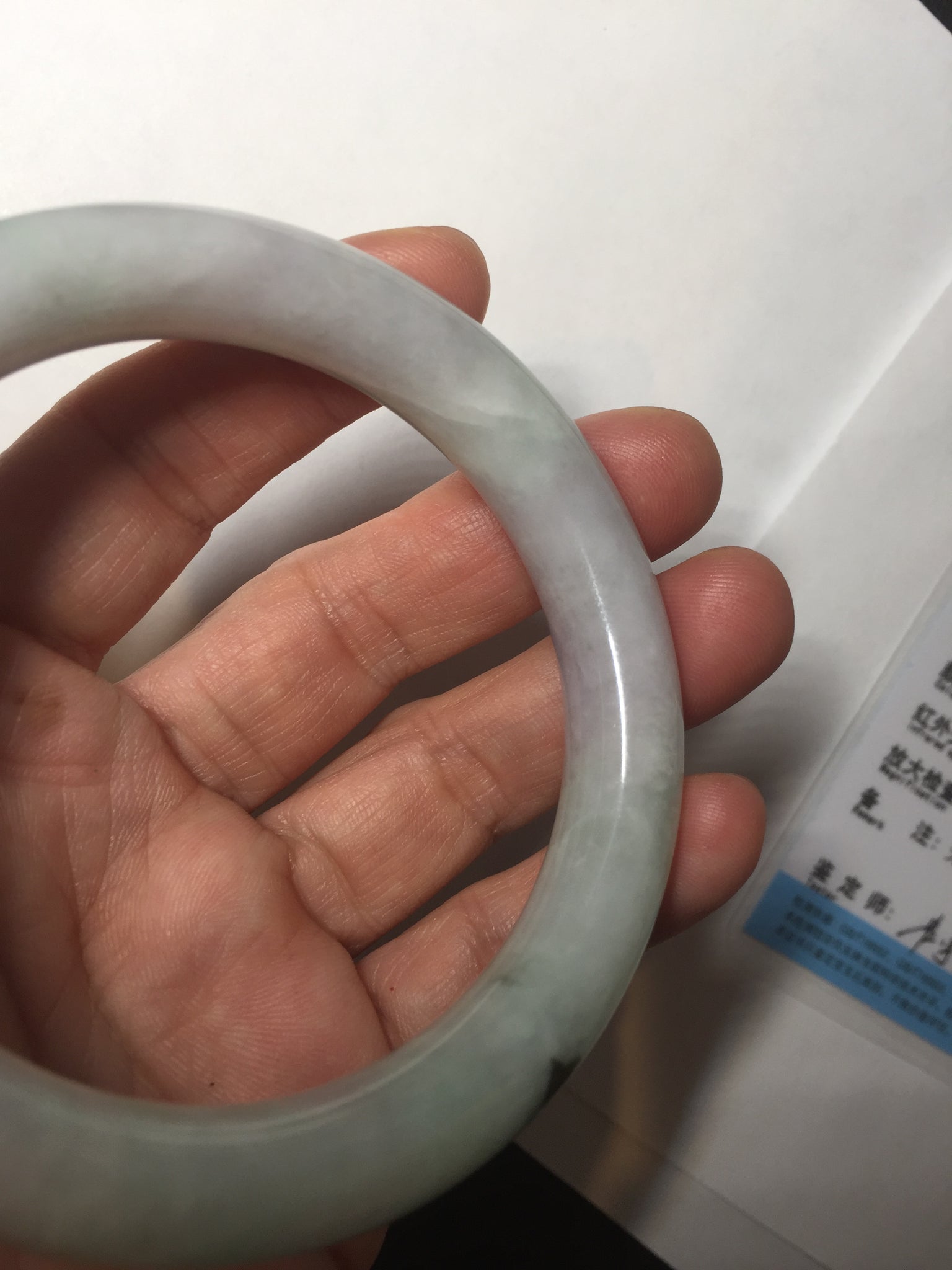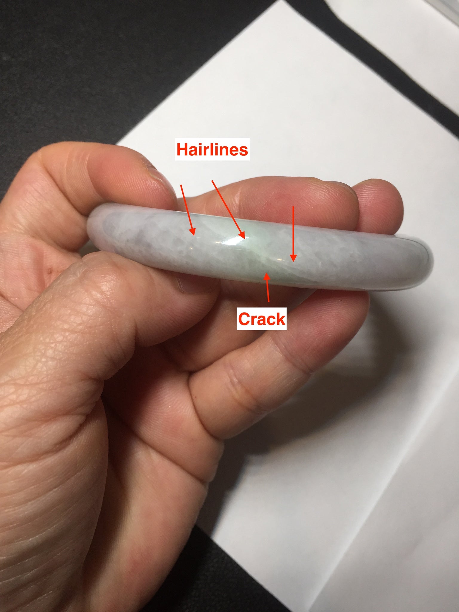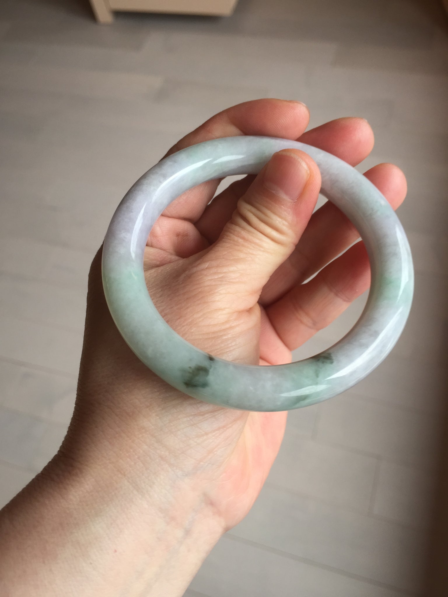Some small cracks. The bangle is solid. Some hairlines. Some cotton lines, spots, and areas. Not transparent. Not watery. The purple is lighter than in the photos due to the purple color always being more camera-friendly.