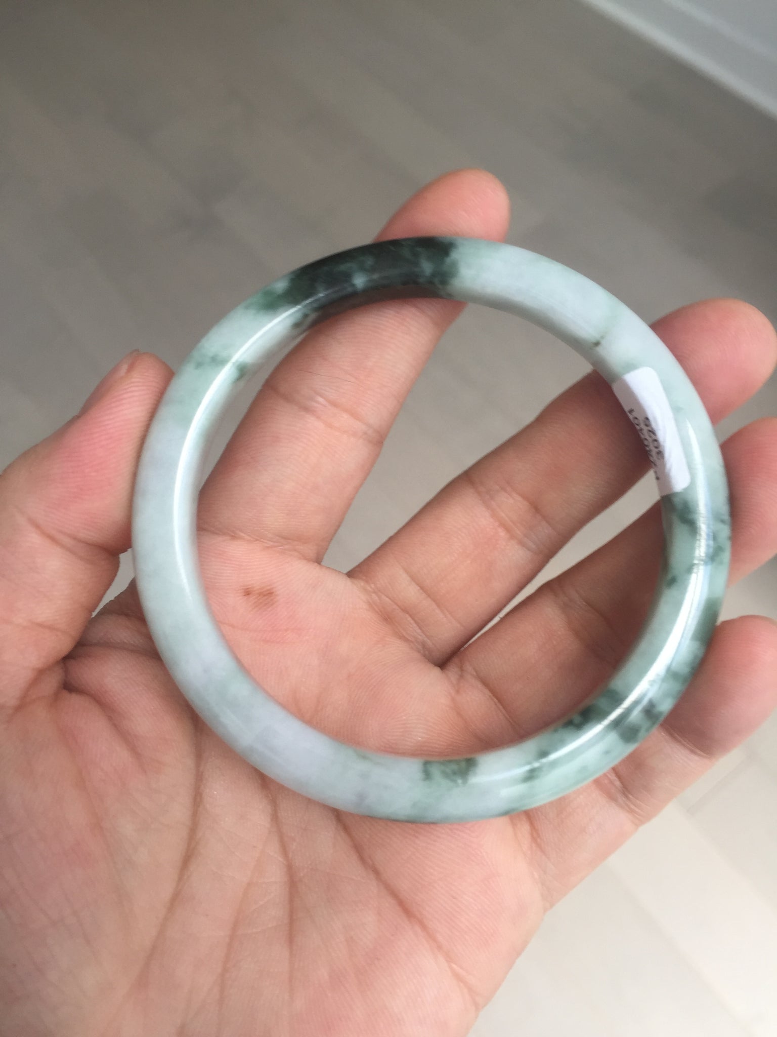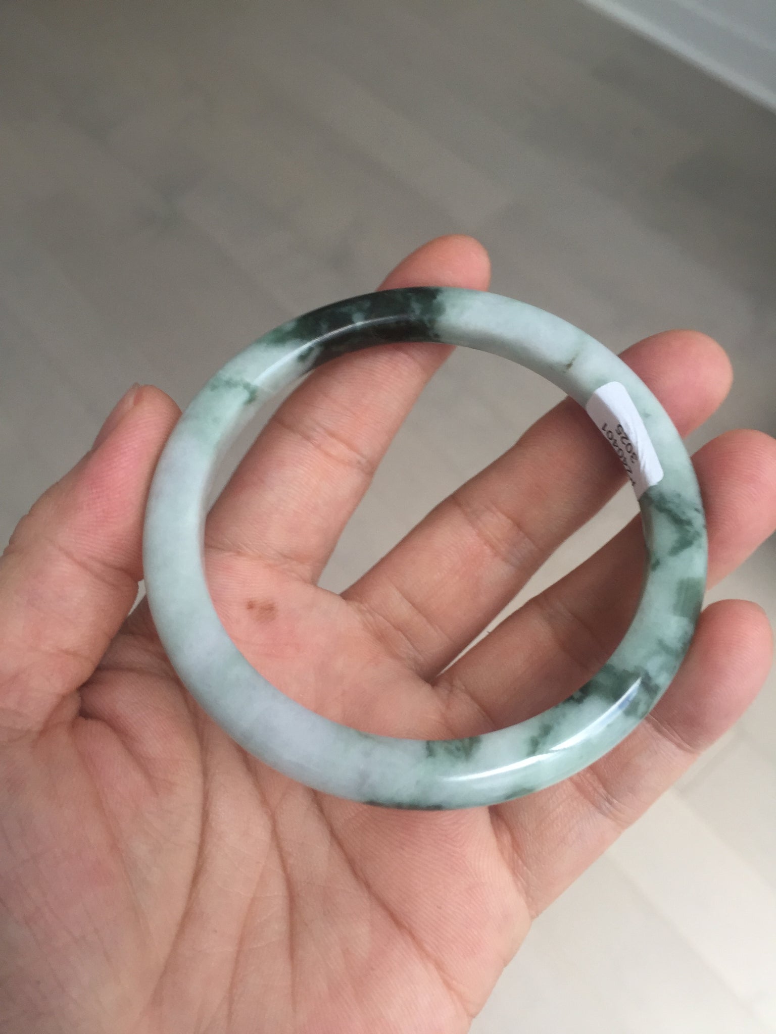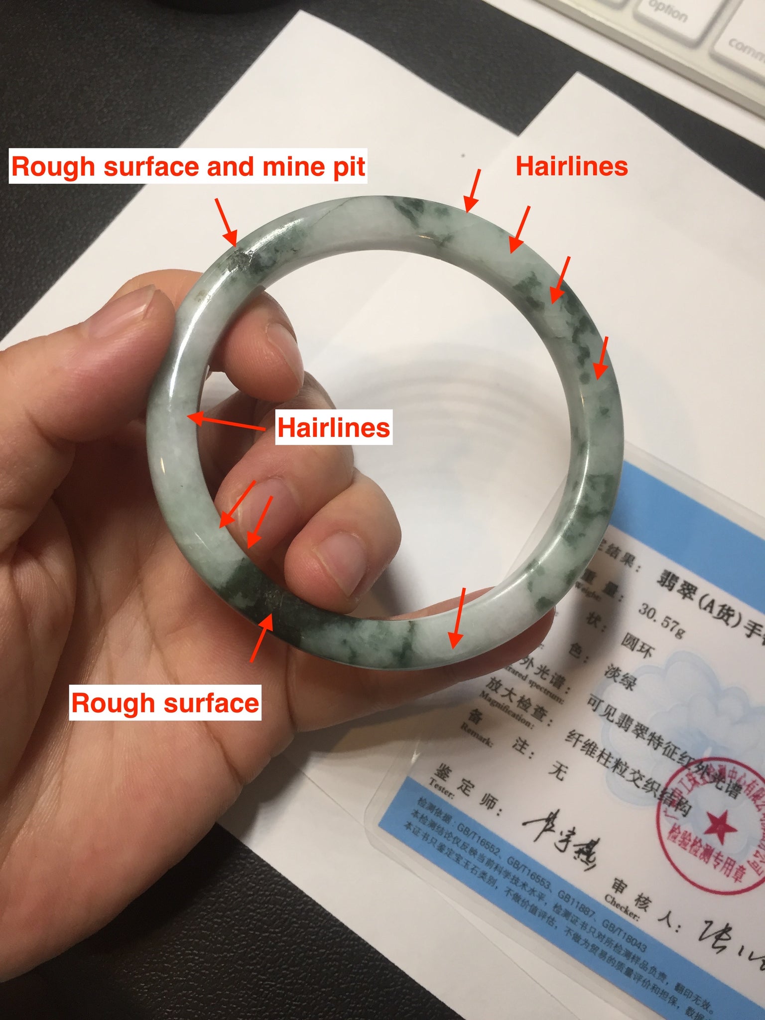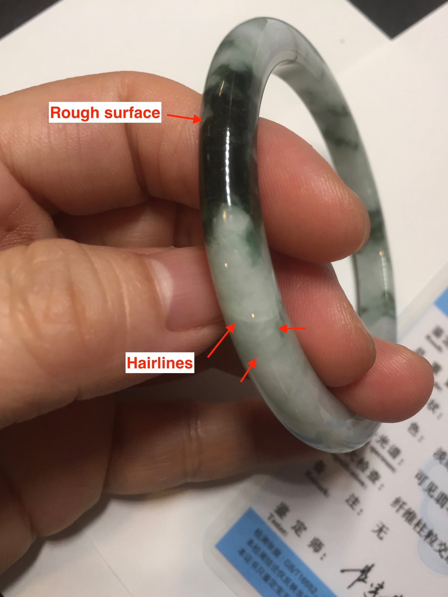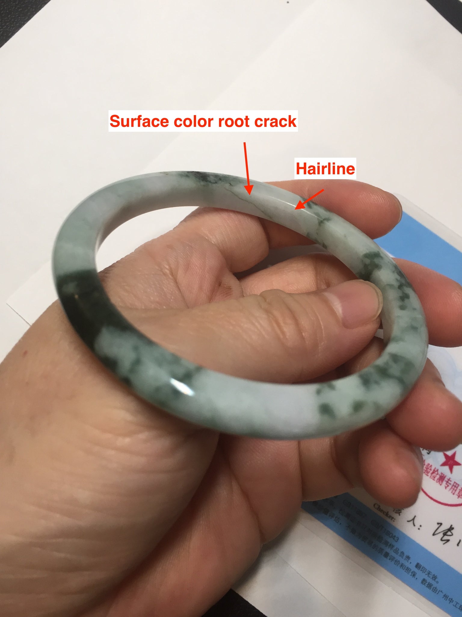 Two color root cracks. Some hairlines or cotton lines. This kind of jade with green floating flowers always has white mineral lines. Therefore, I count them as hairlines or cotton lines. They are actually natural structure lines and won't influence the firmness. Some cotton areas and cotton spots, rough surfaces, and notches. Not transplant. The dark green area is thinner and narrower than the rest part.