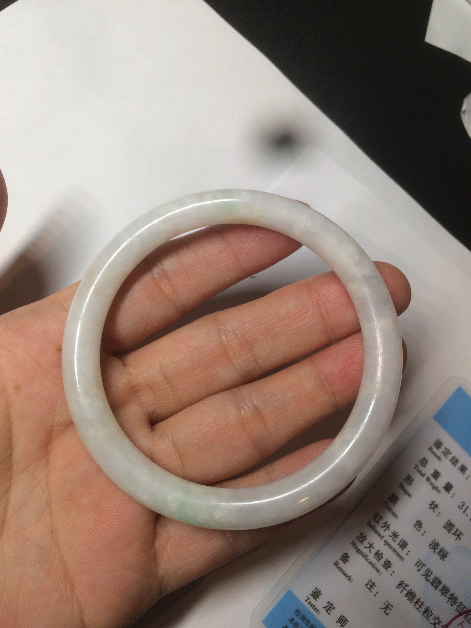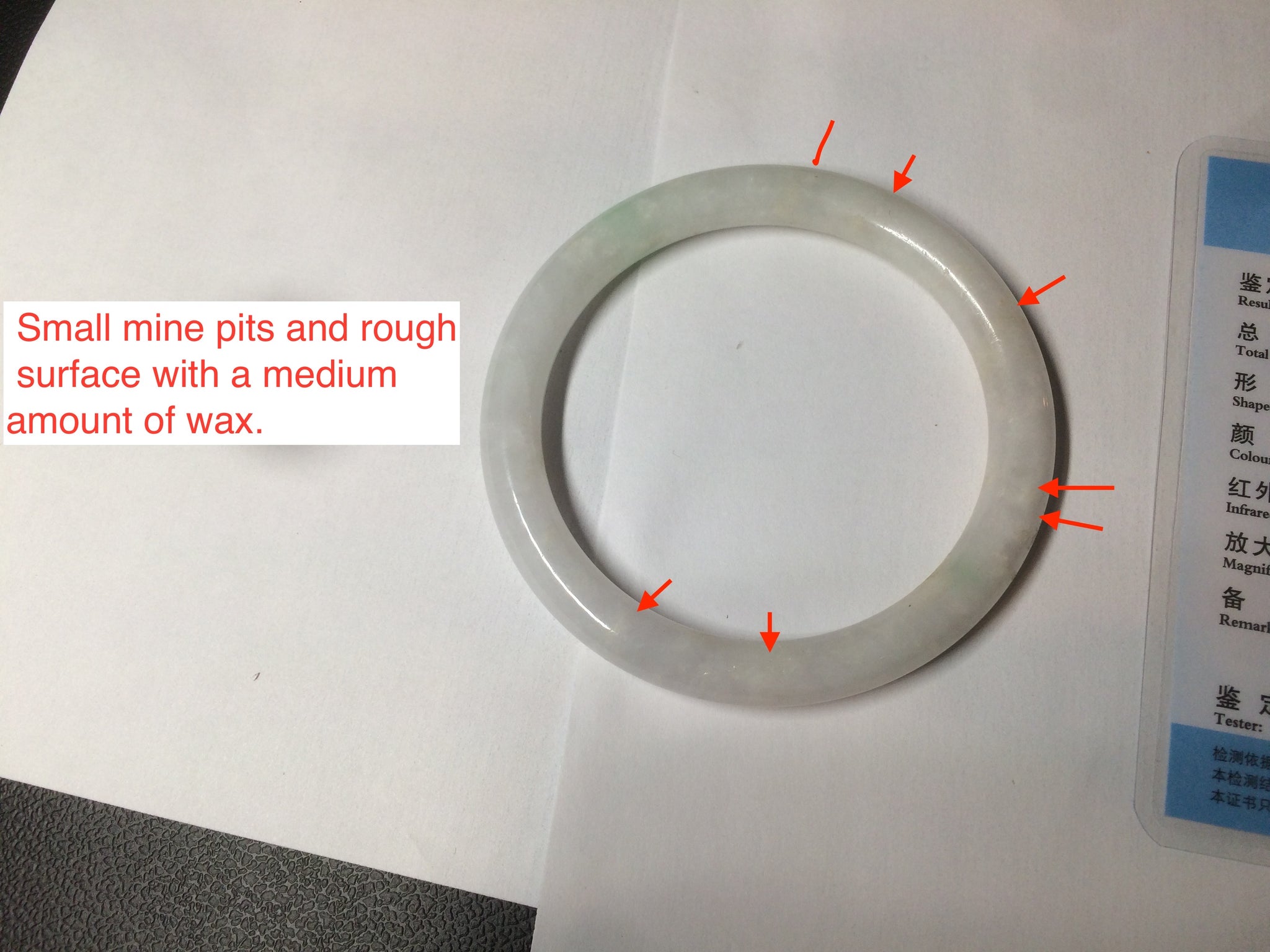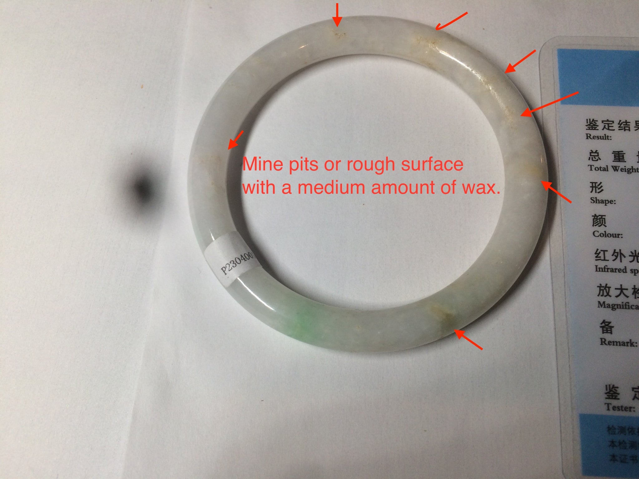 No crack. Quite a lot of small mine pits and rough surfaces with a medium amount of wax. Some cotton spots and cotton lines.