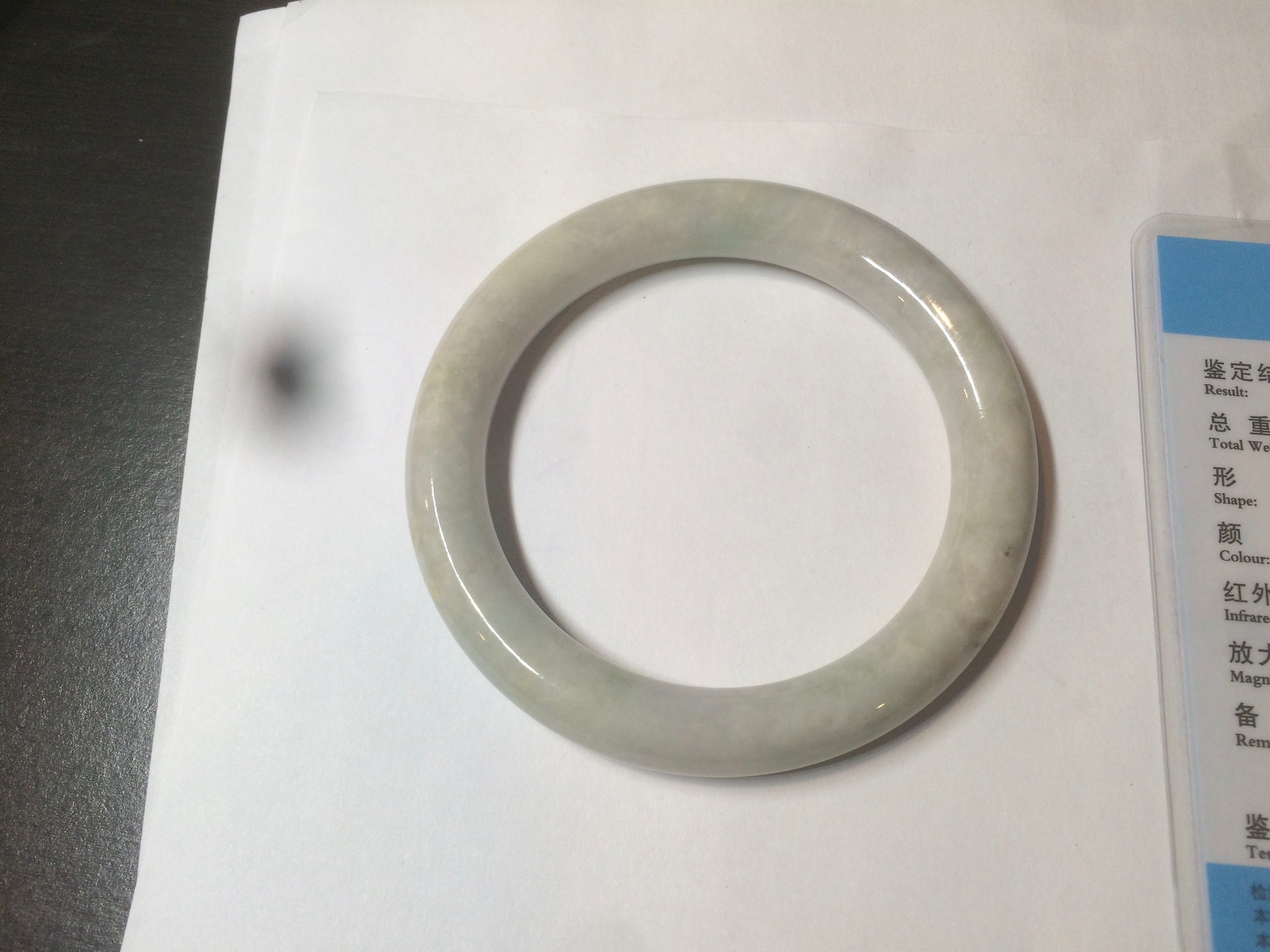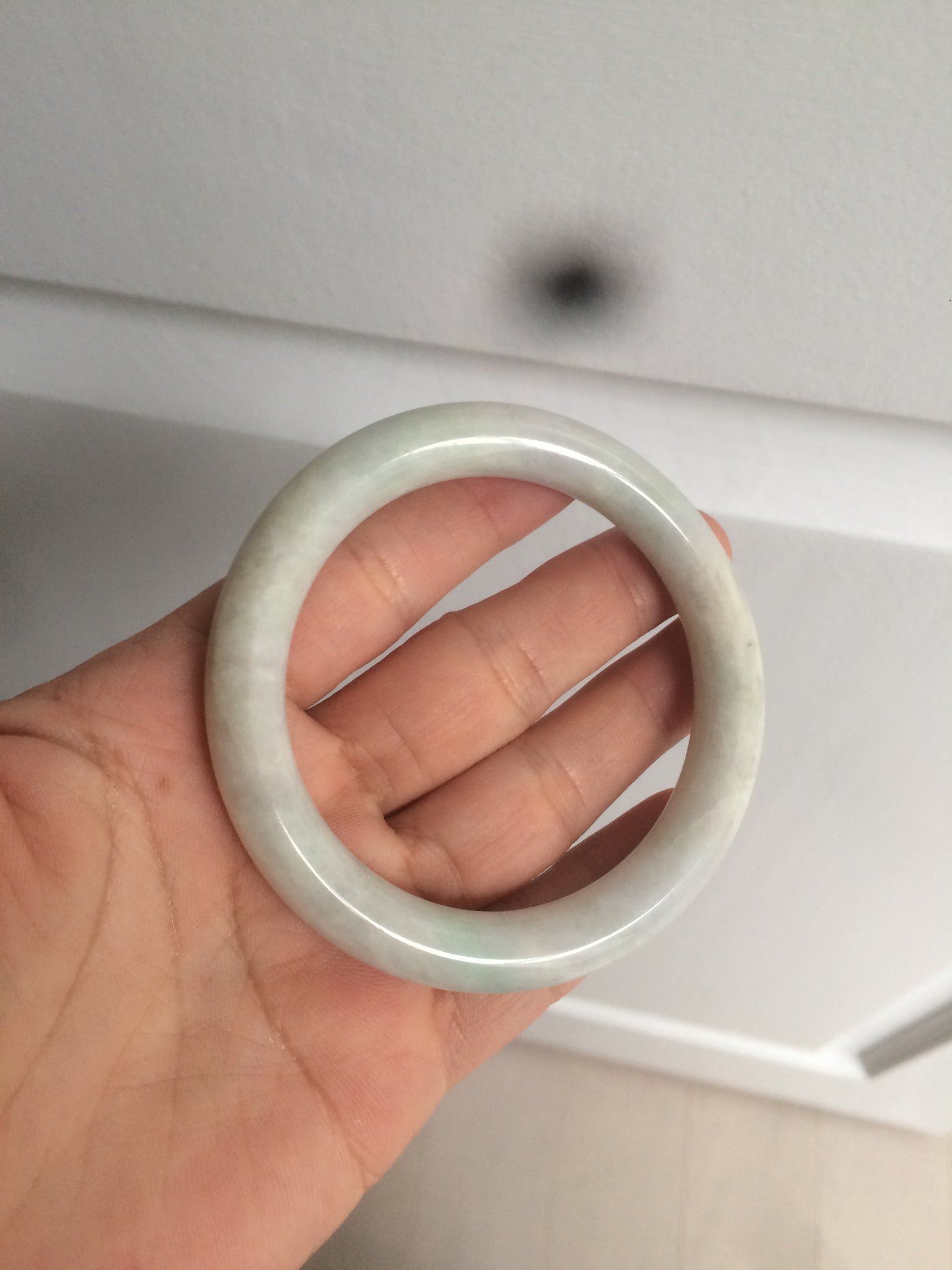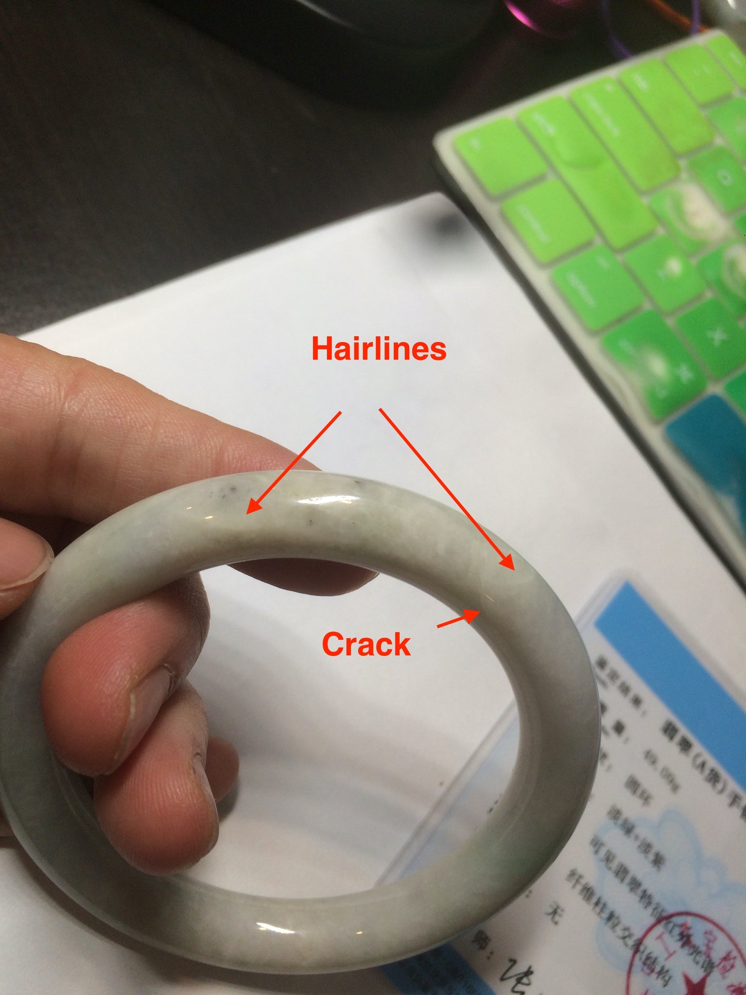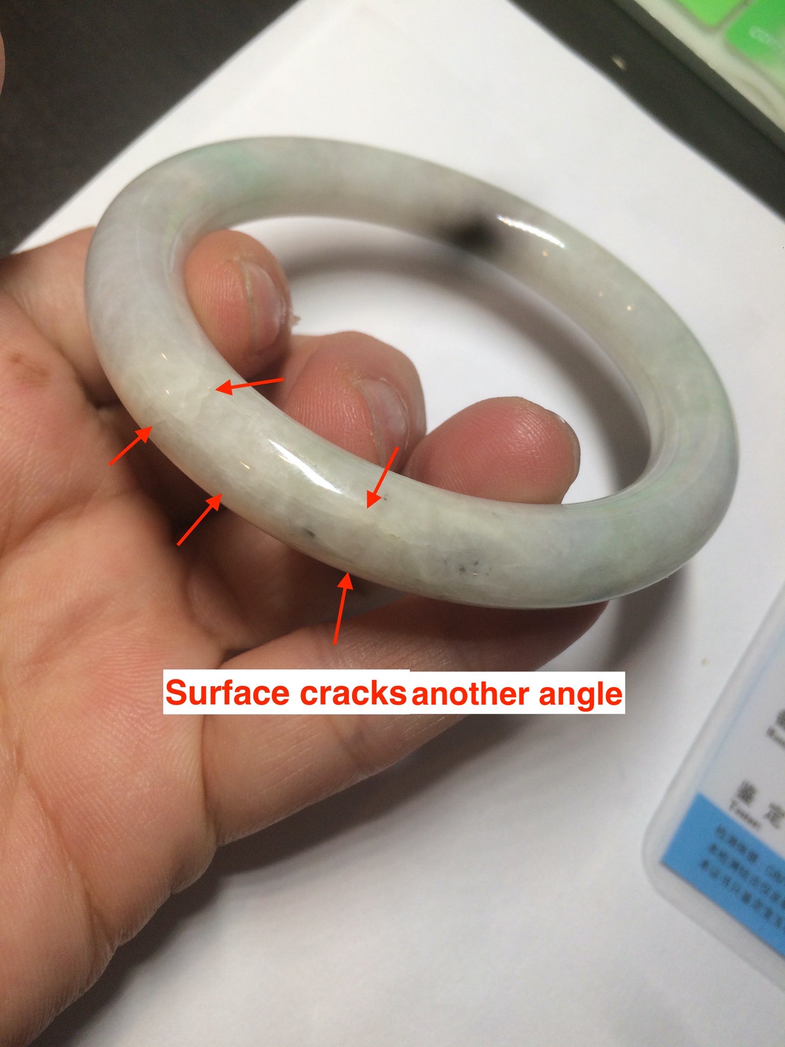 Some cracks. One of them is U shape. Some hairlines. Some small rough surfaces. Cotton area and spots. The bangle is solid. The purple is super light. Lighter than photos.