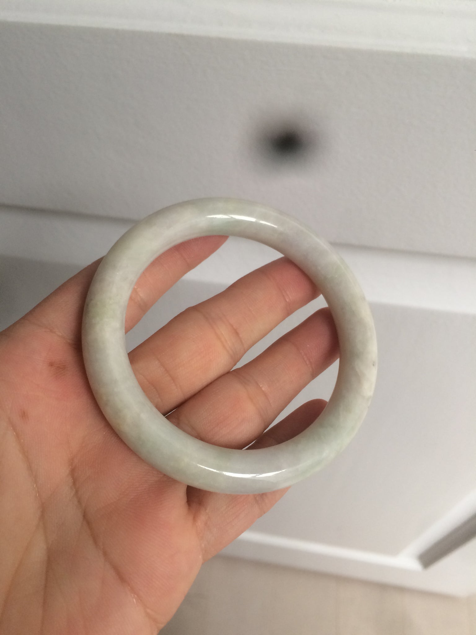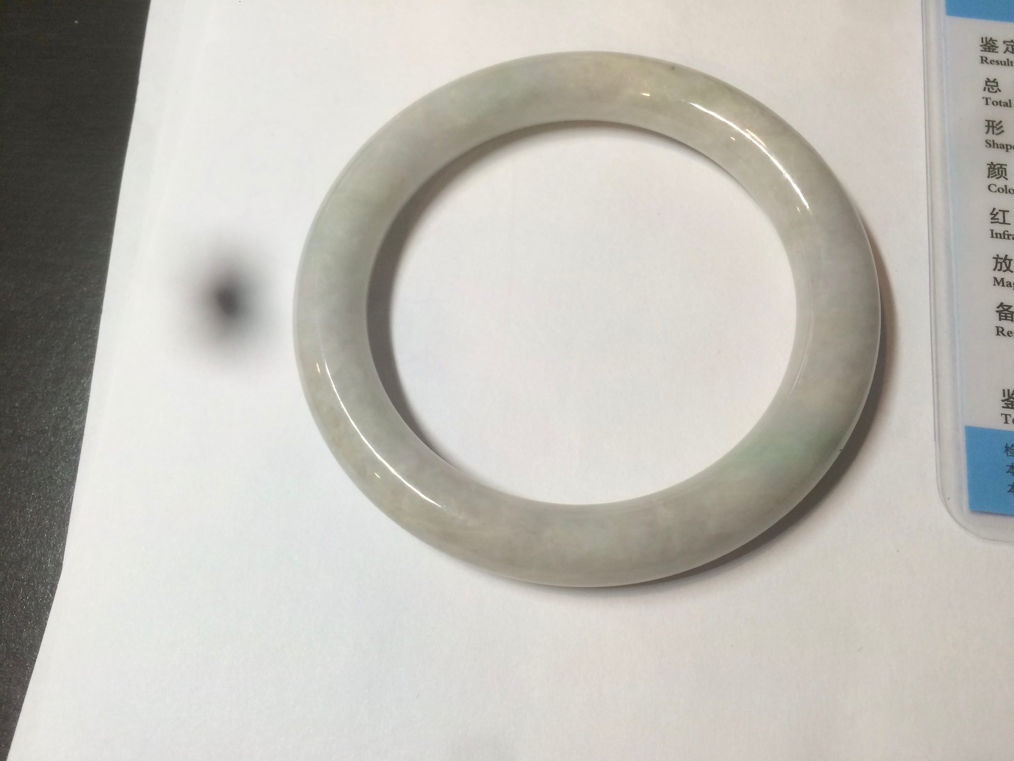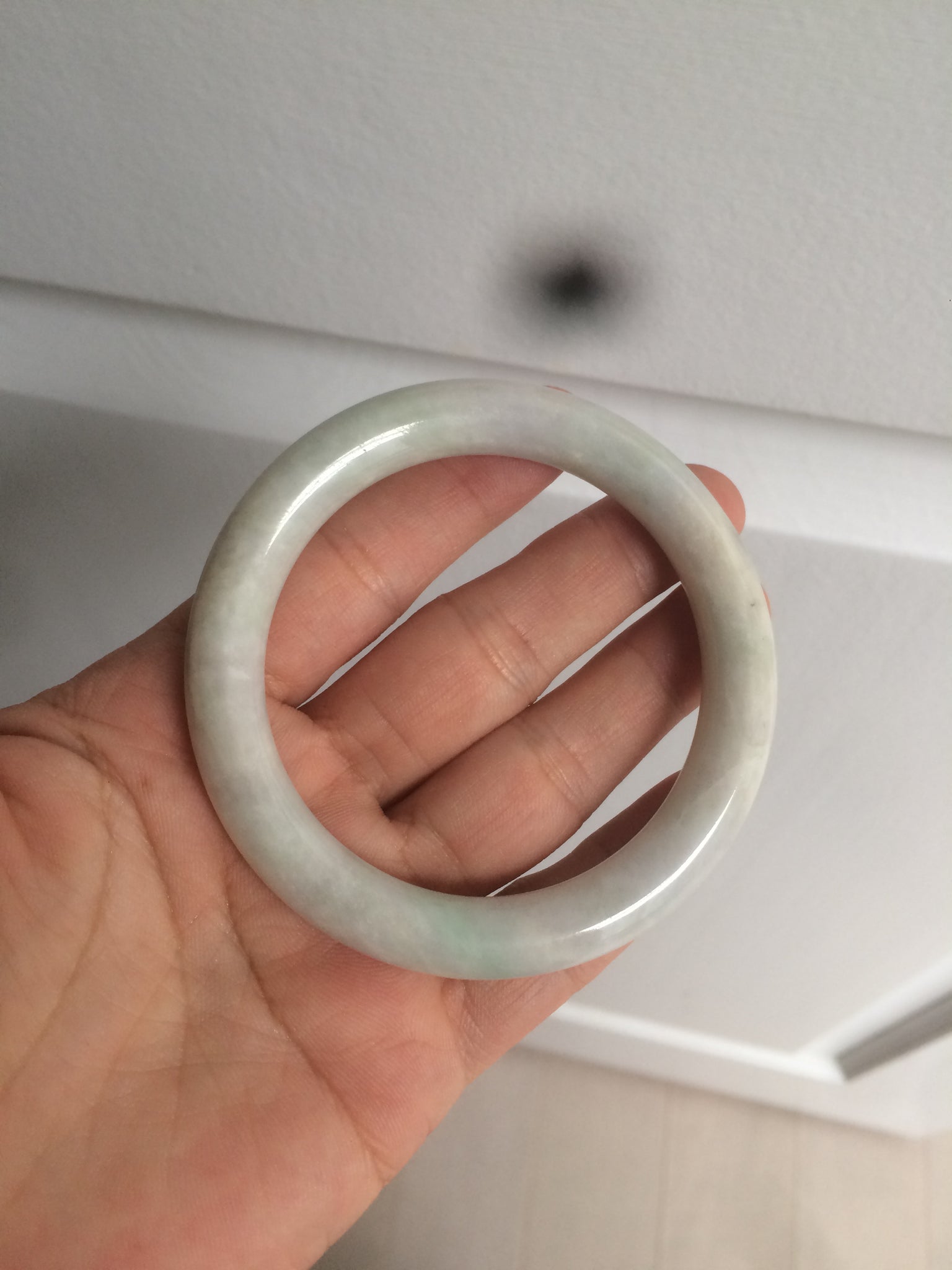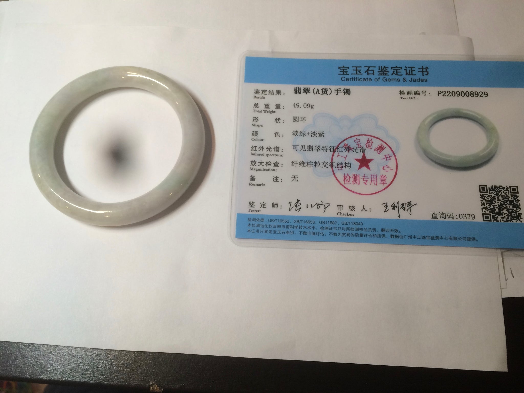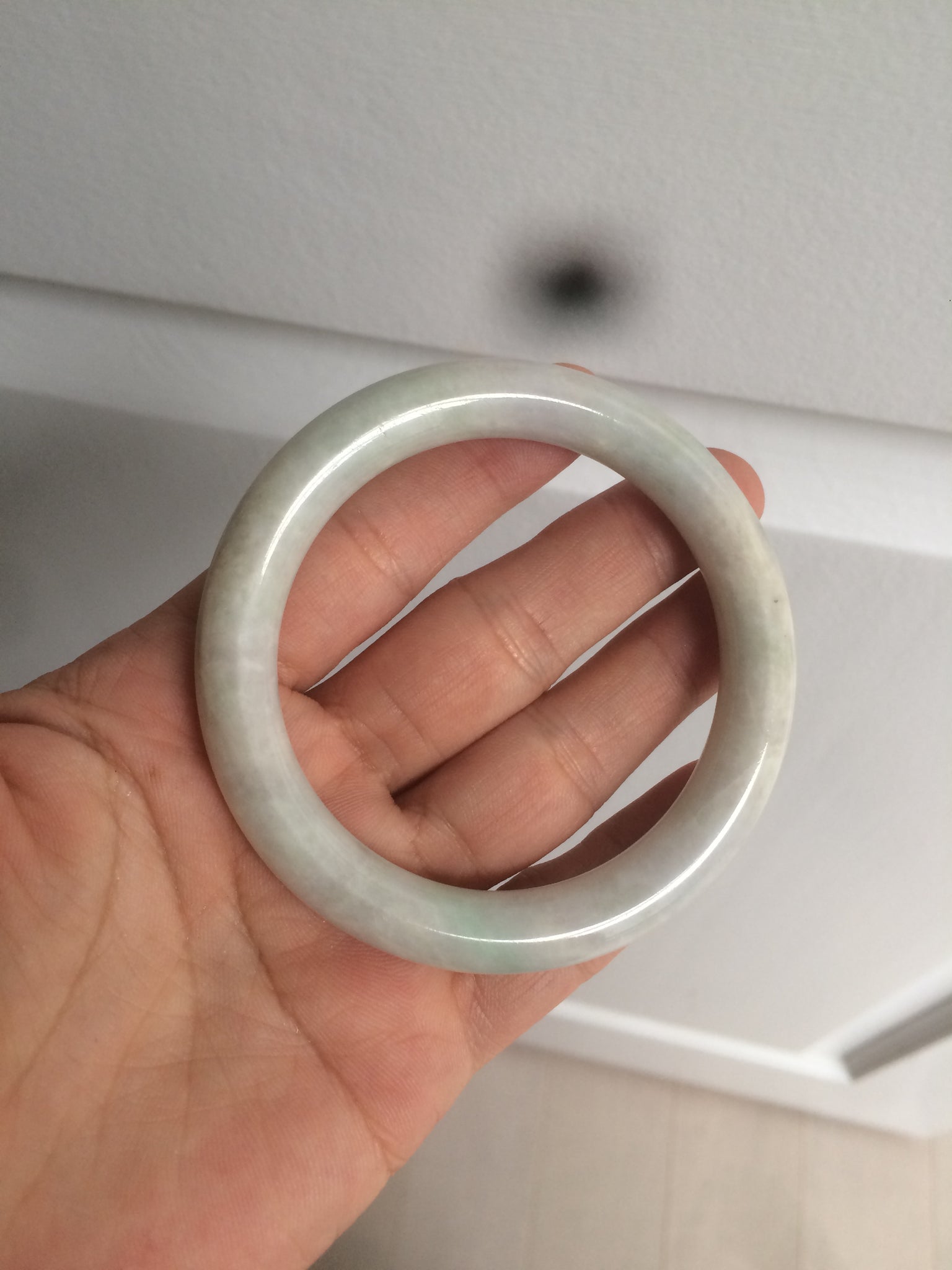 Some cracks. One of them is U shape. Some hairlines. Some small rough surfaces. Cotton area and spots. The bangle is solid. The purple is super light. Lighter than photos.