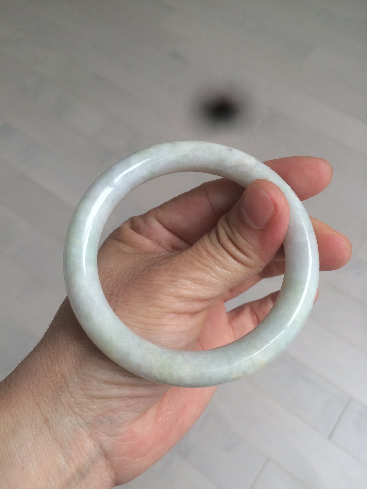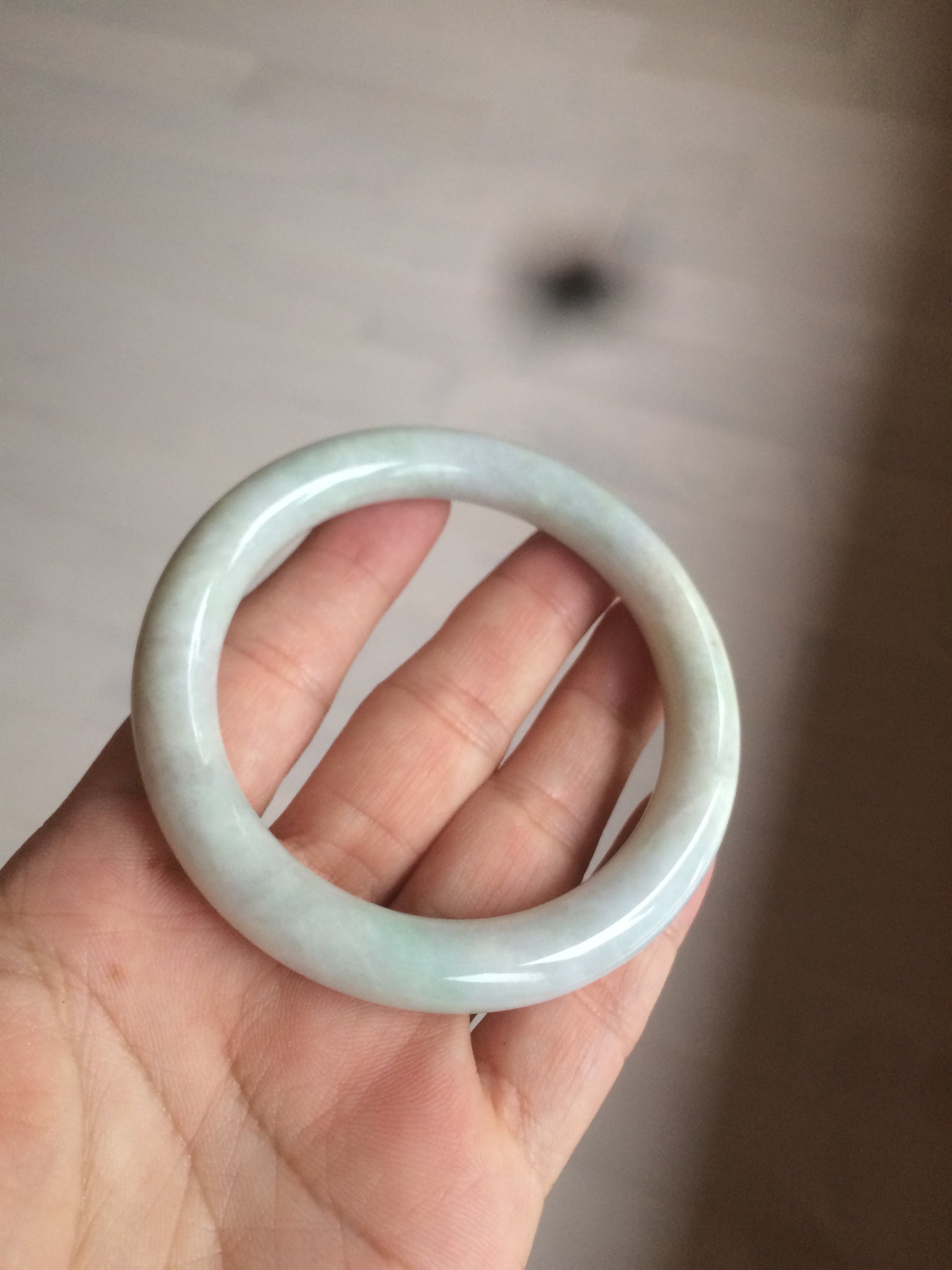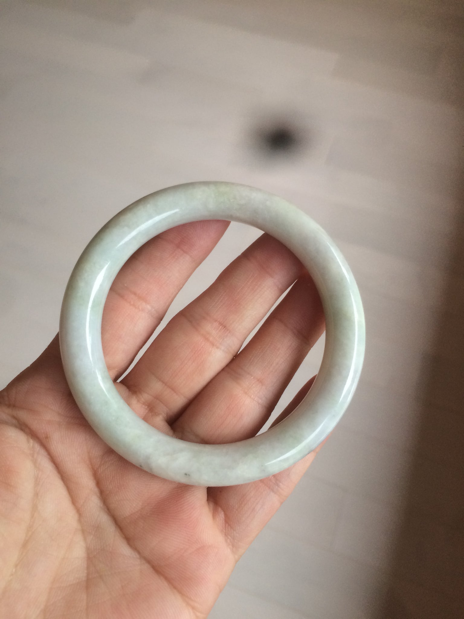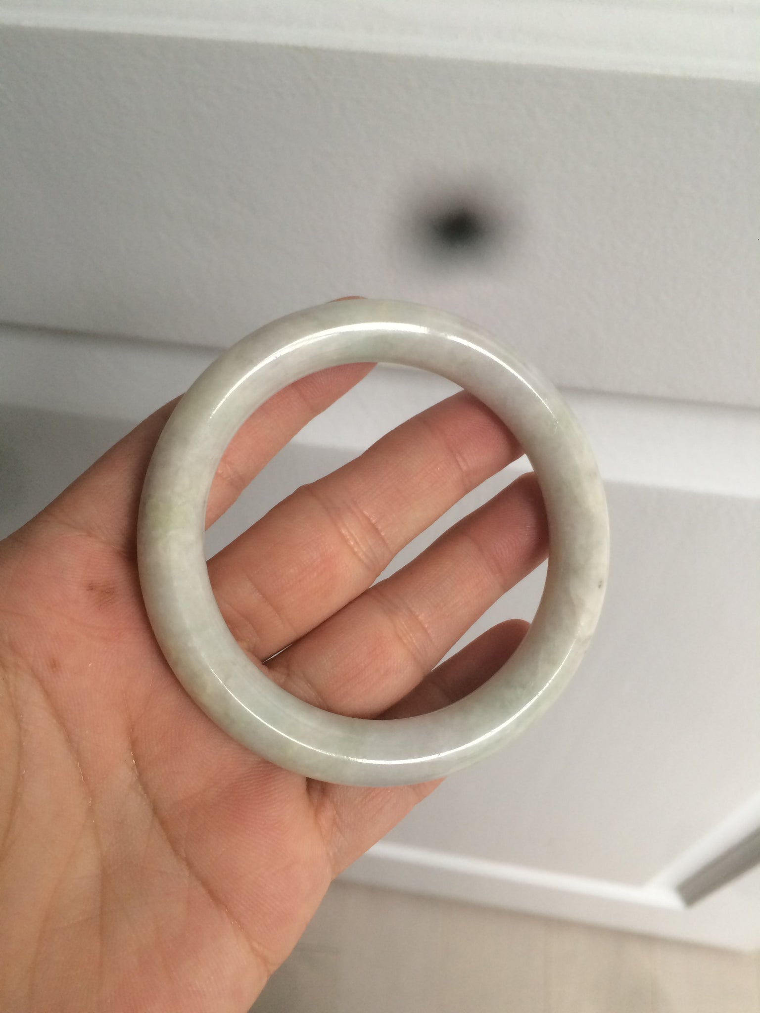 Some cracks. One of them is U shape. Some hairlines. Some small rough surfaces. Cotton area and spots. The bangle is solid. The purple is super light. Lighter than photos.