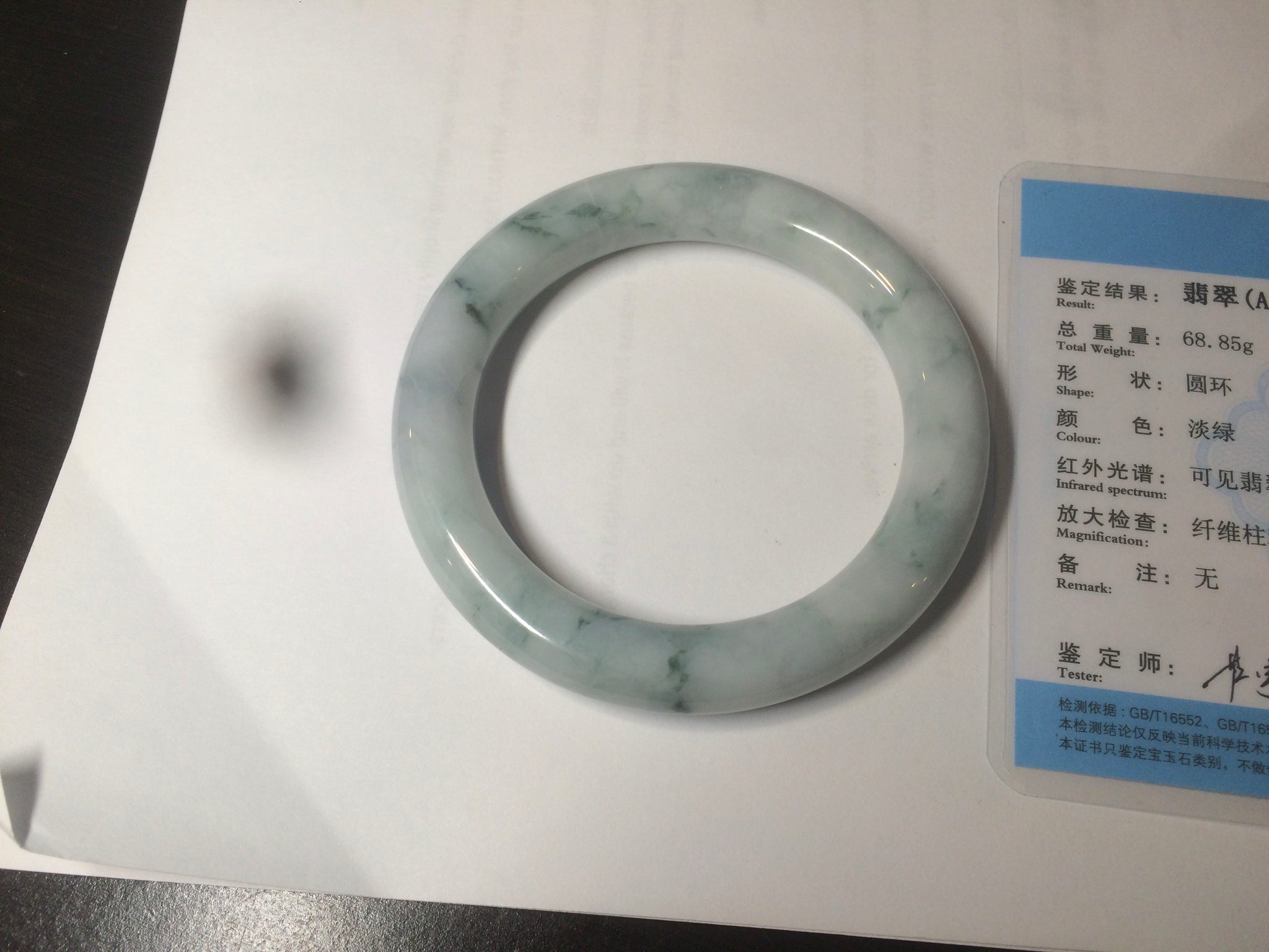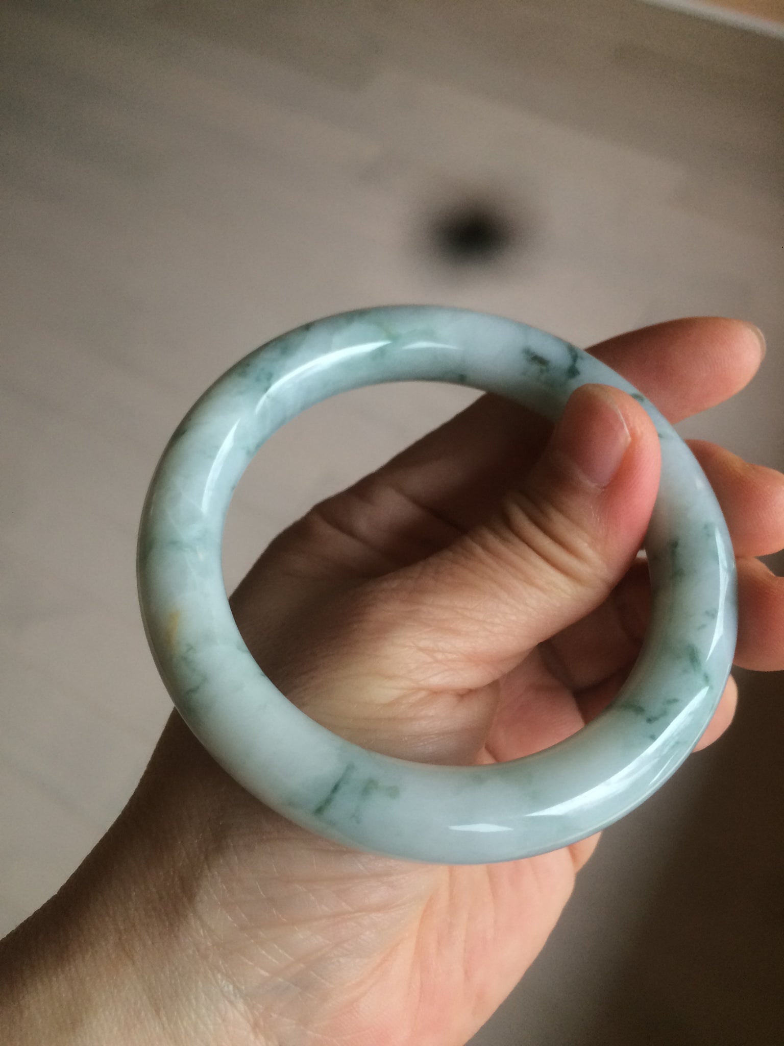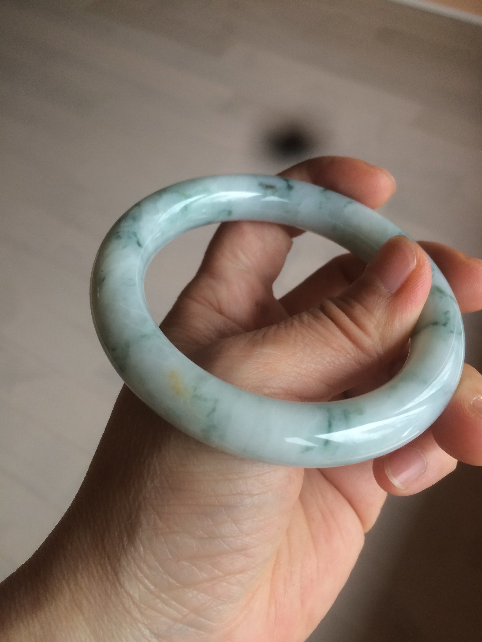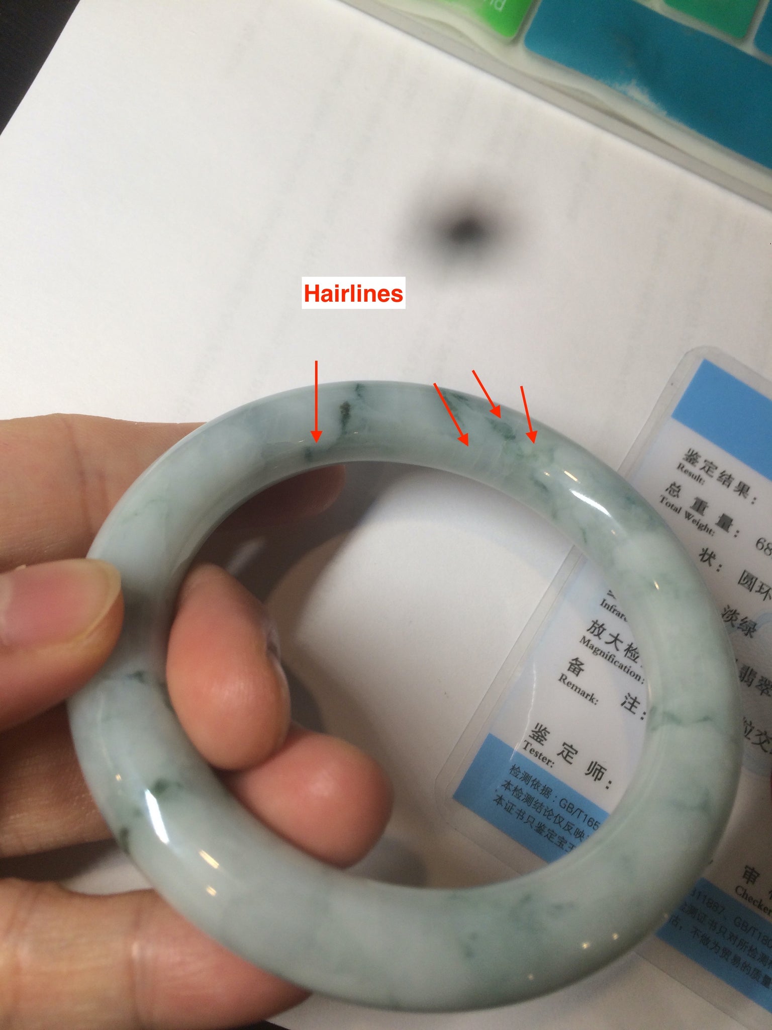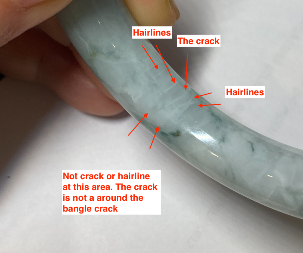 Two cracks. One is small with a little bit of wax. Another one cuts deep, almost around the bangle. But is it not around the bangle crack. The bangle is still firm. Some hairlines or natural structure lines. Not transparent. The yellow jade is just a tiny area. Cotton spots and areas.