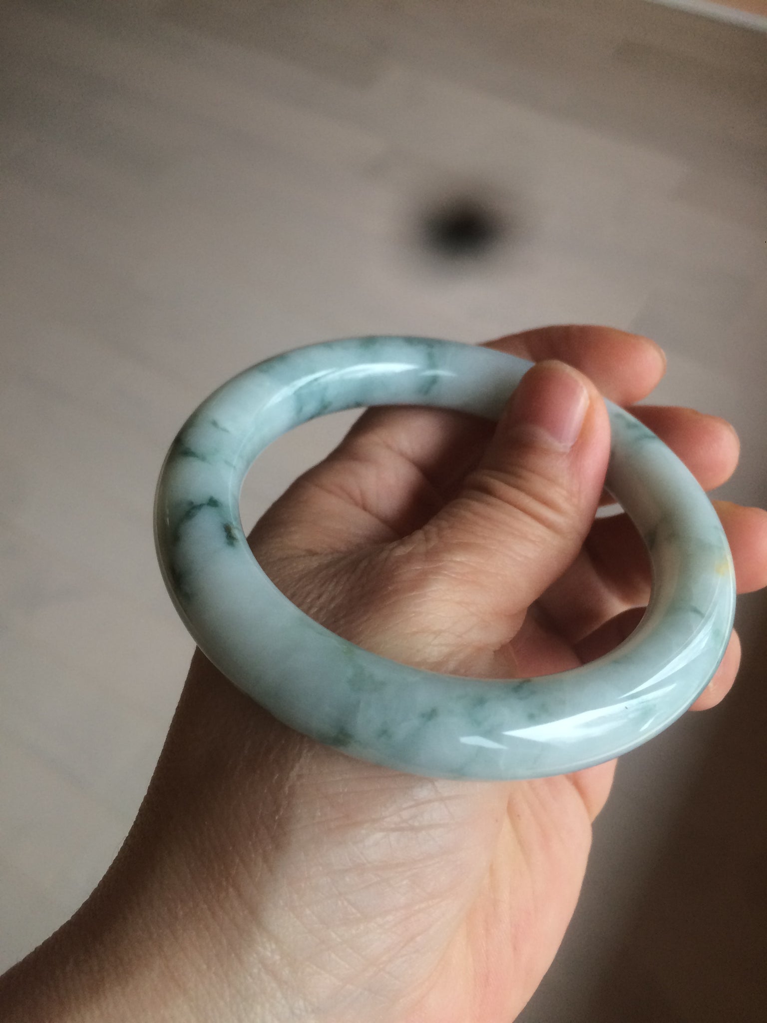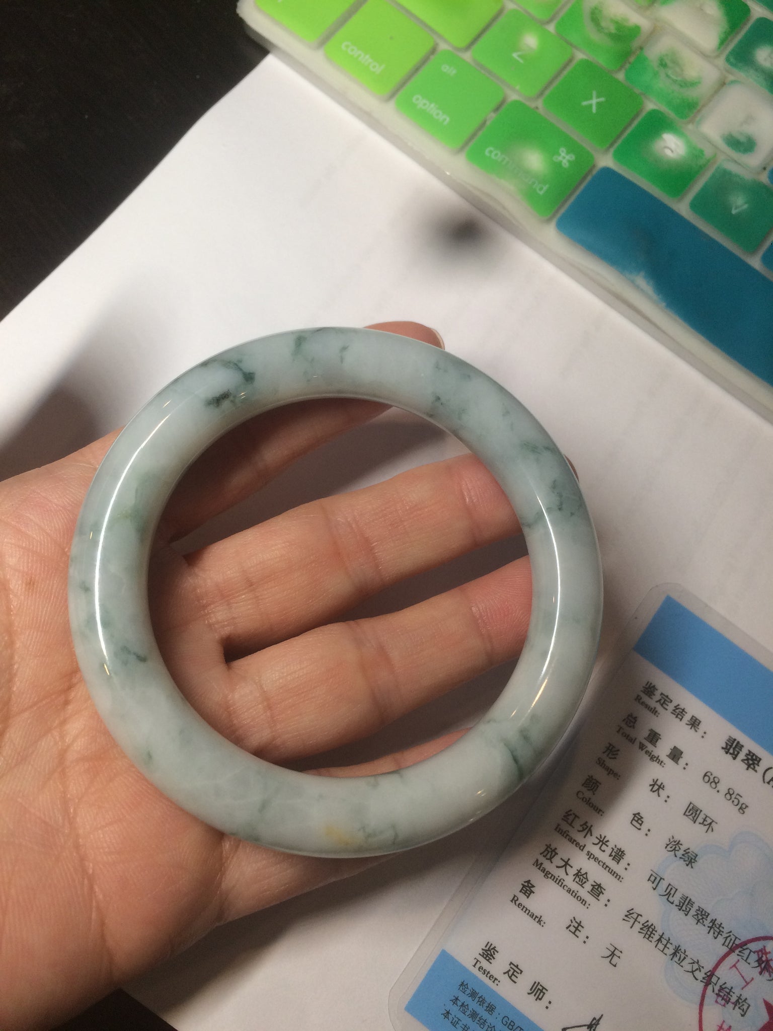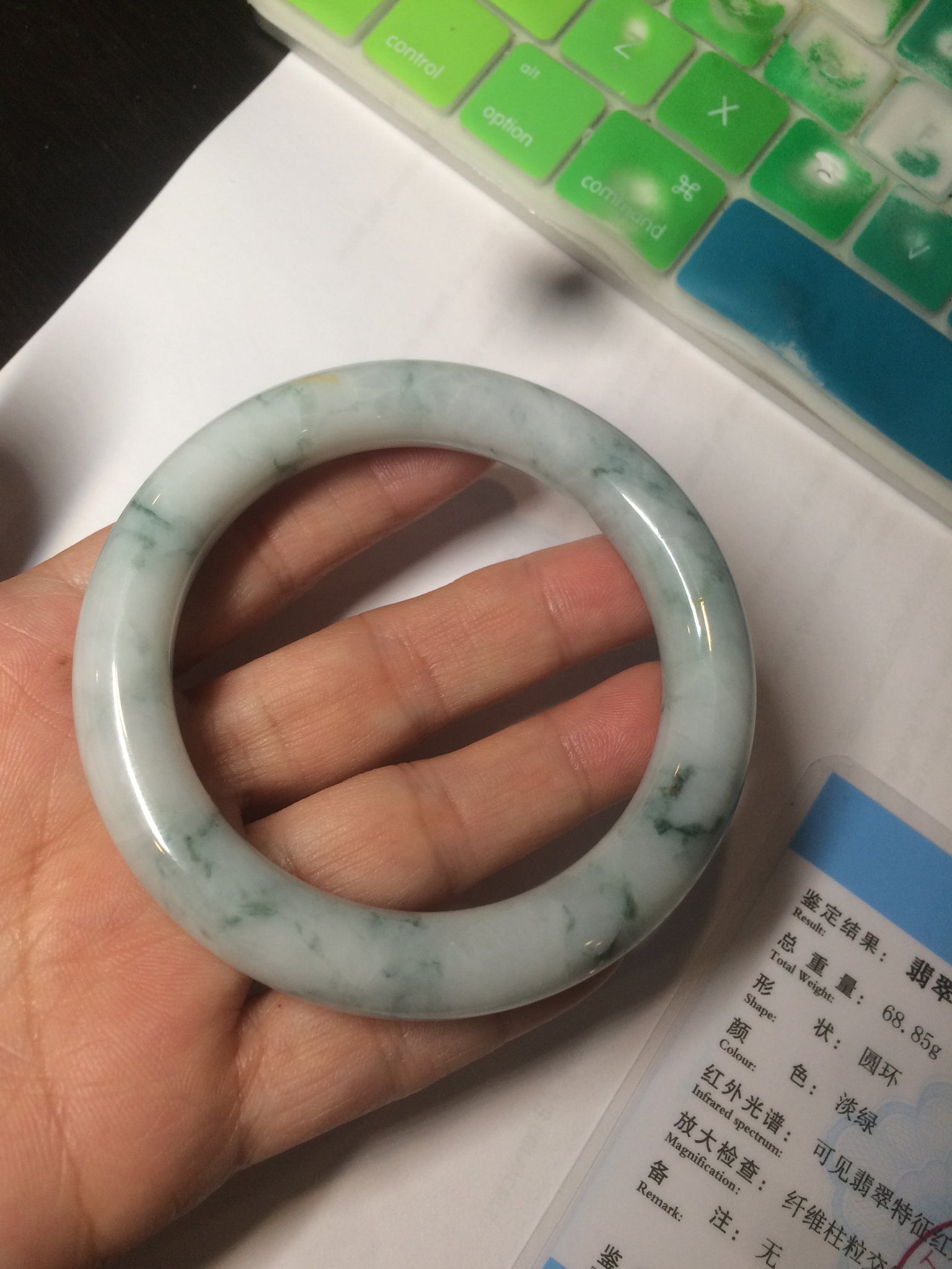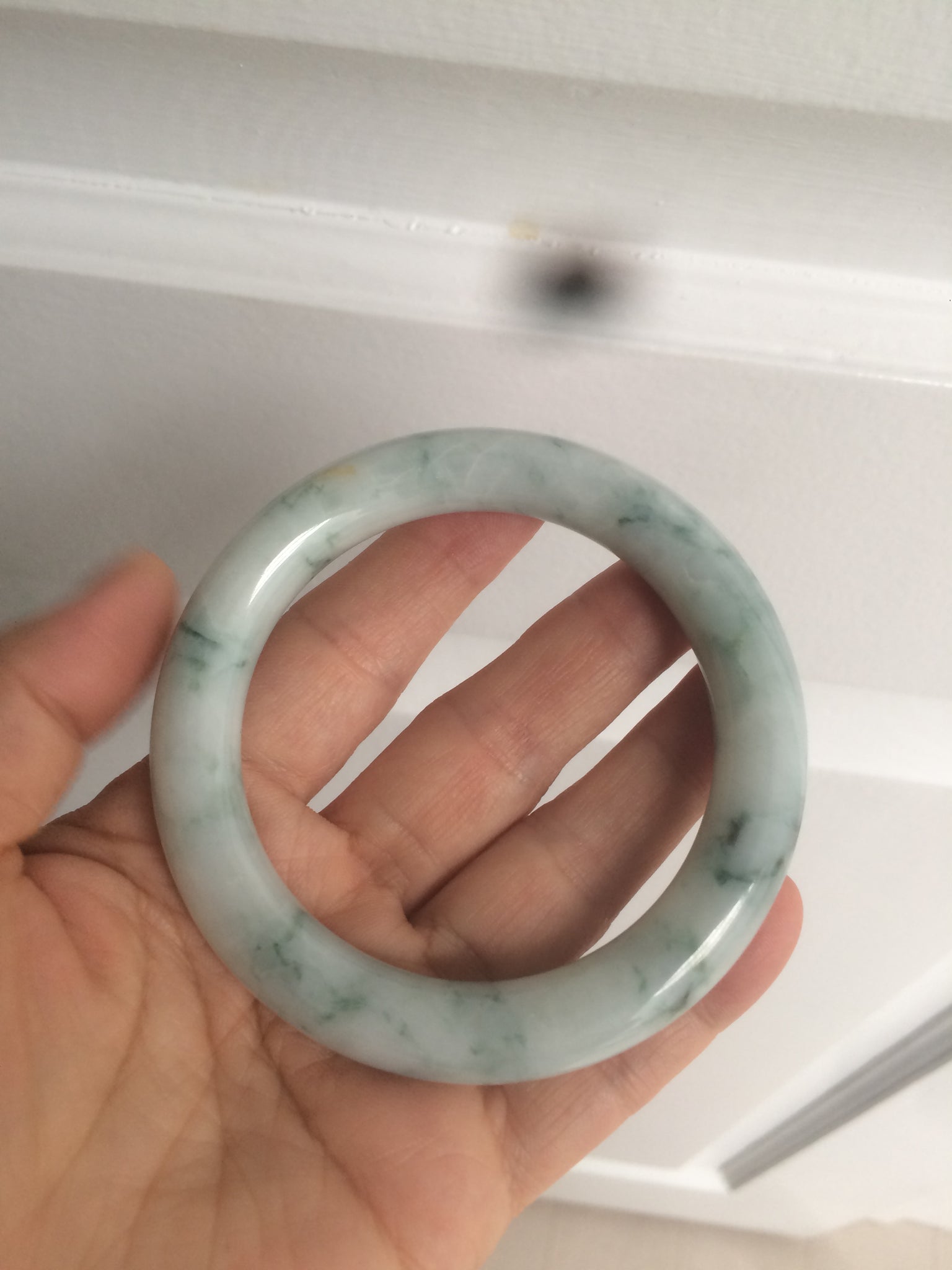 Two cracks. One is small with a little bit of wax. Another one cuts deep, almost around the bangle. But is it not around the bangle crack. The bangle is still firm. Some hairlines or natural structure lines. Not transparent. The yellow jade is just a tiny area. Cotton spots and areas.