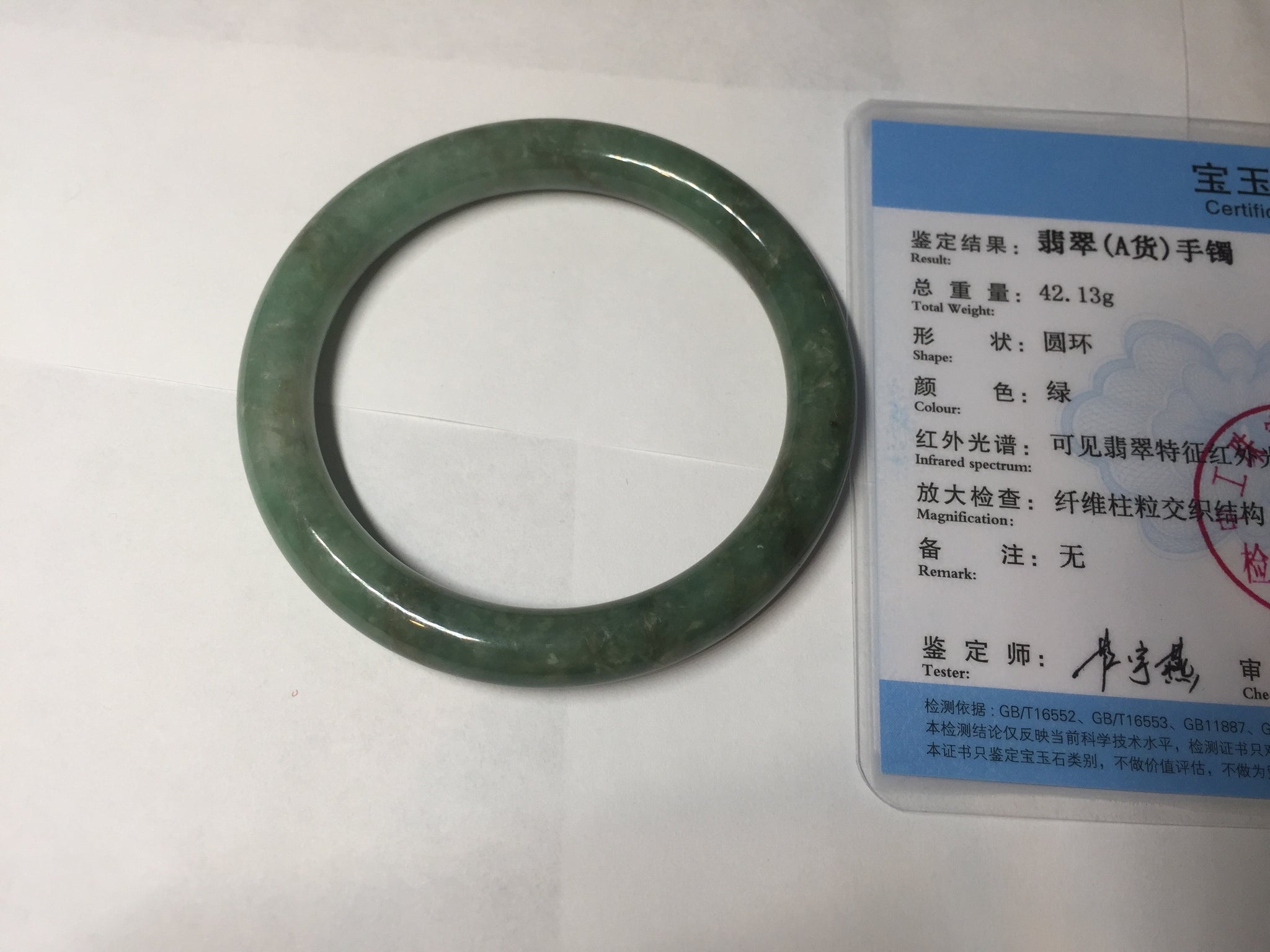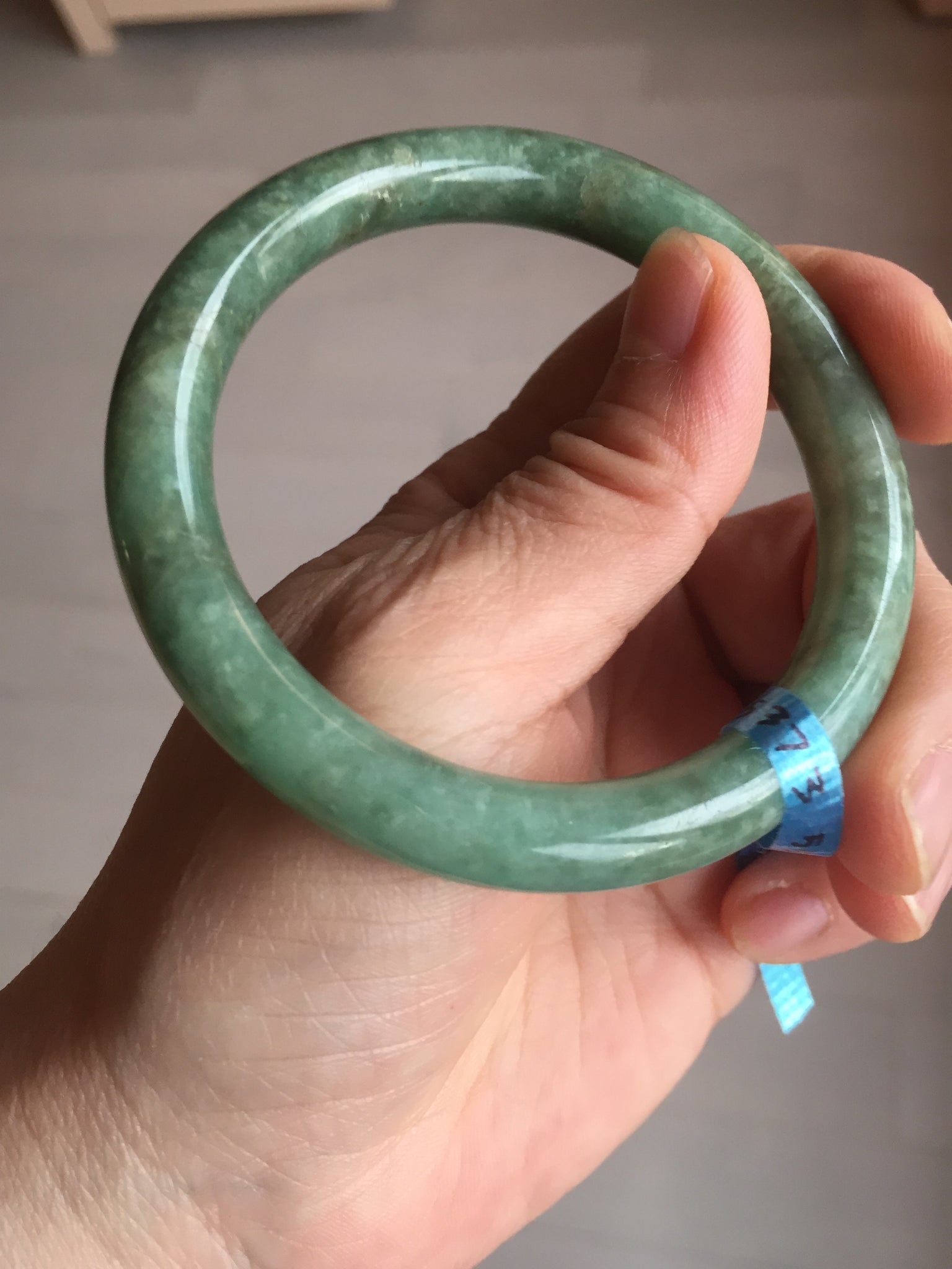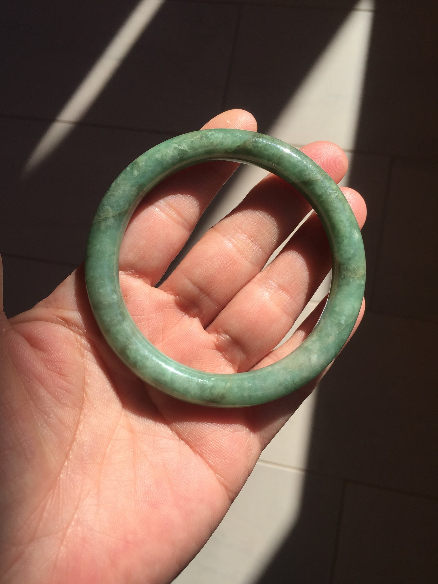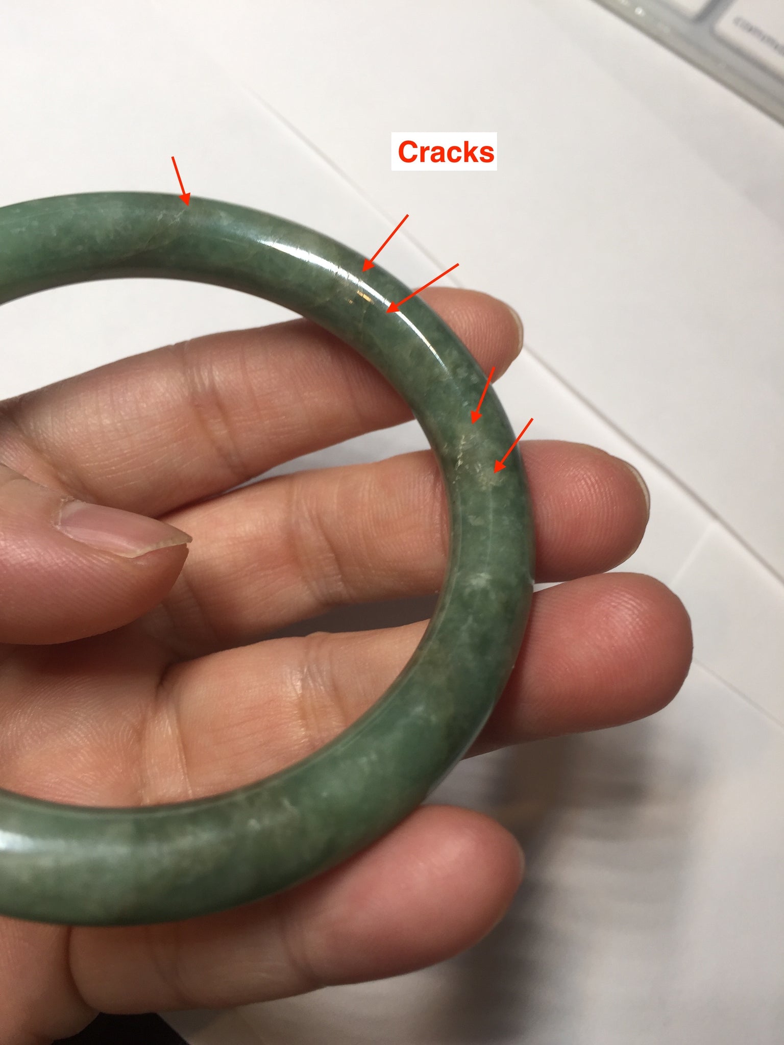 Some cracks(photos may not show all). The bangle is solid. Some hairlines. Some cotton lines and spots. Some brown areas. Some rough surfaces. Not transparent.