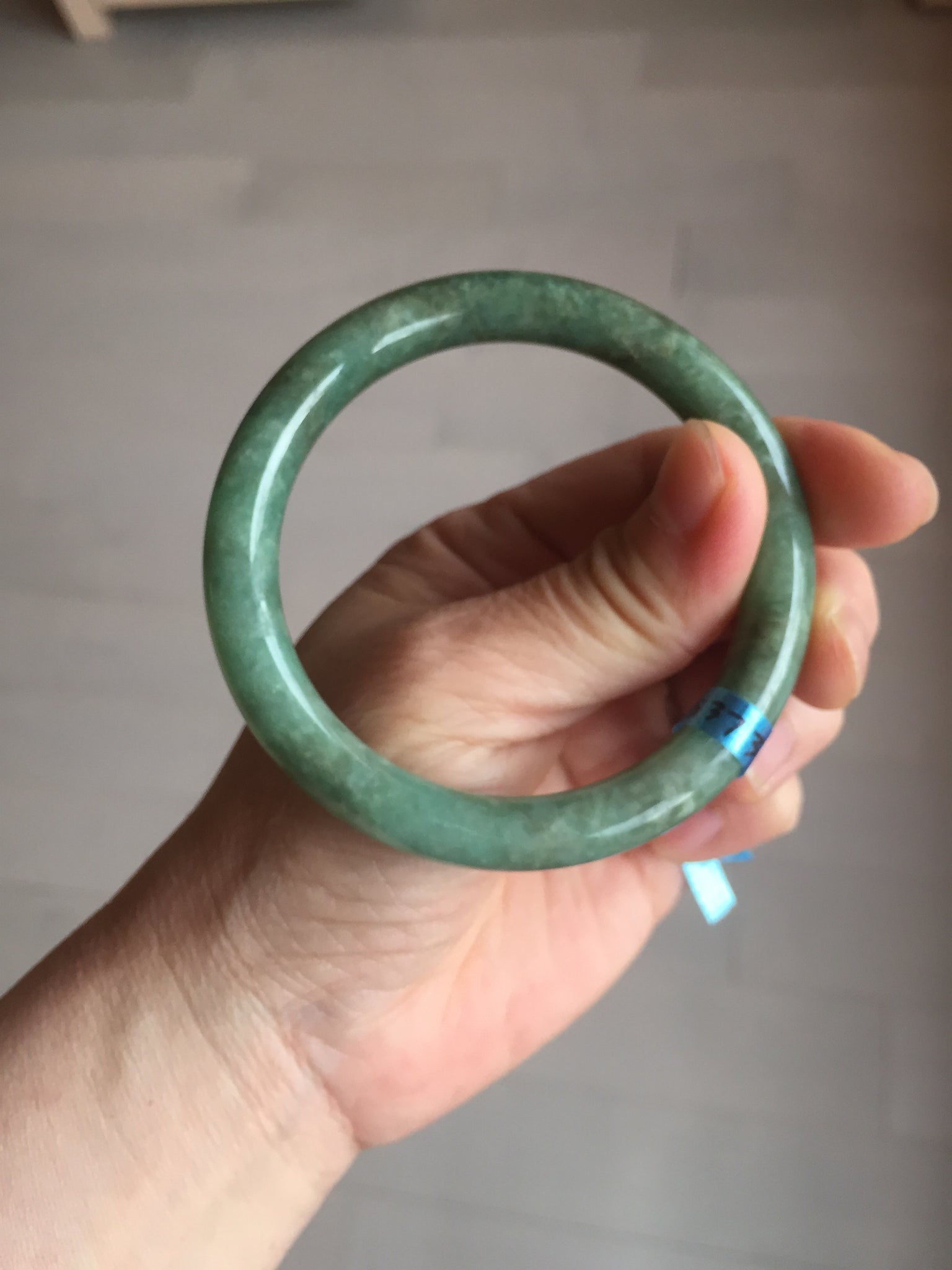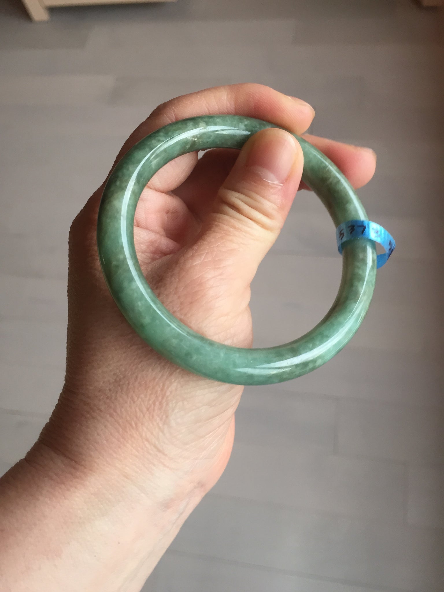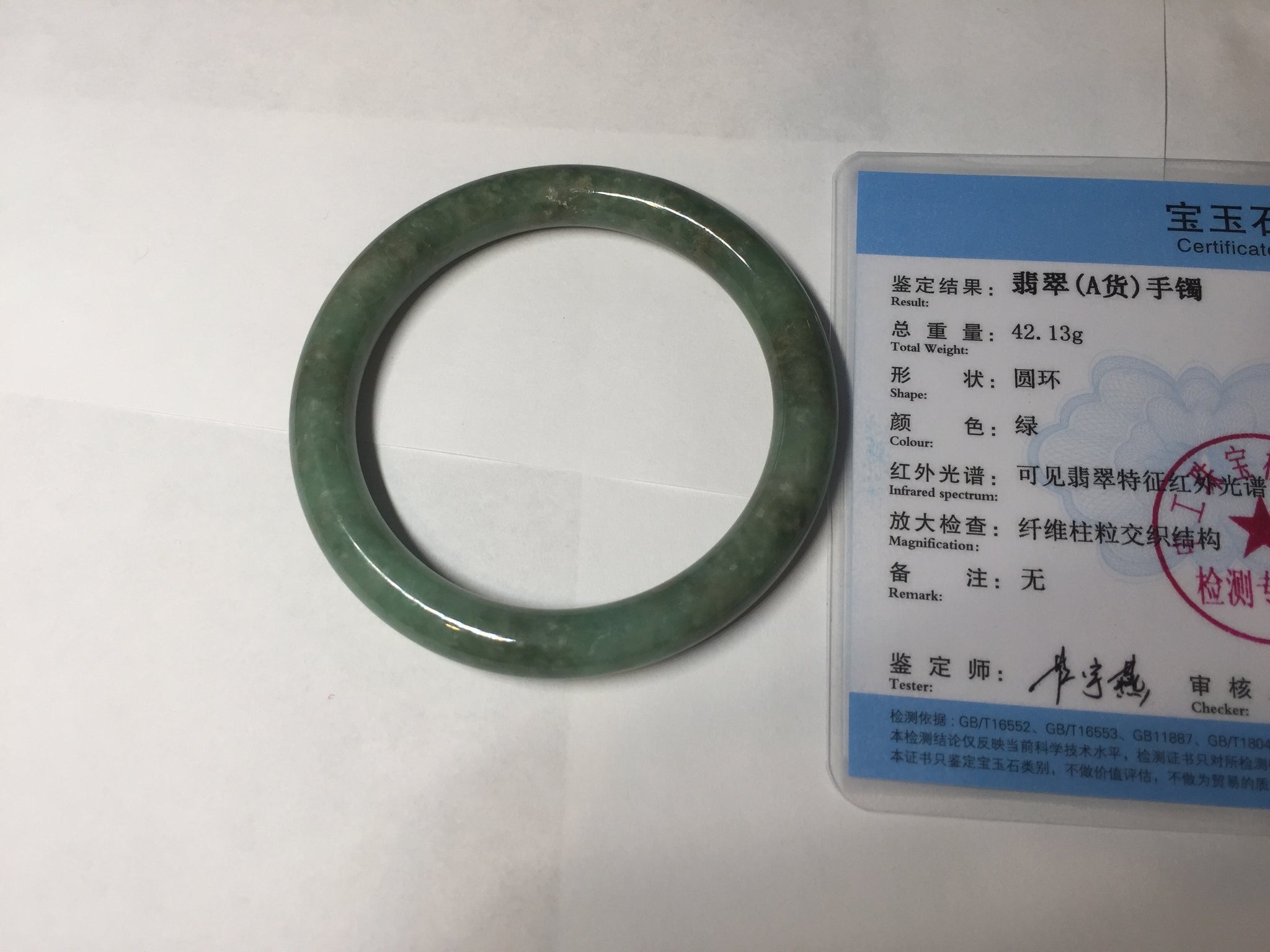 Some cracks(photos may not show all). The bangle is solid. Some hairlines. Some cotton lines and spots. Some brown areas. Some rough surfaces. Not transparent.