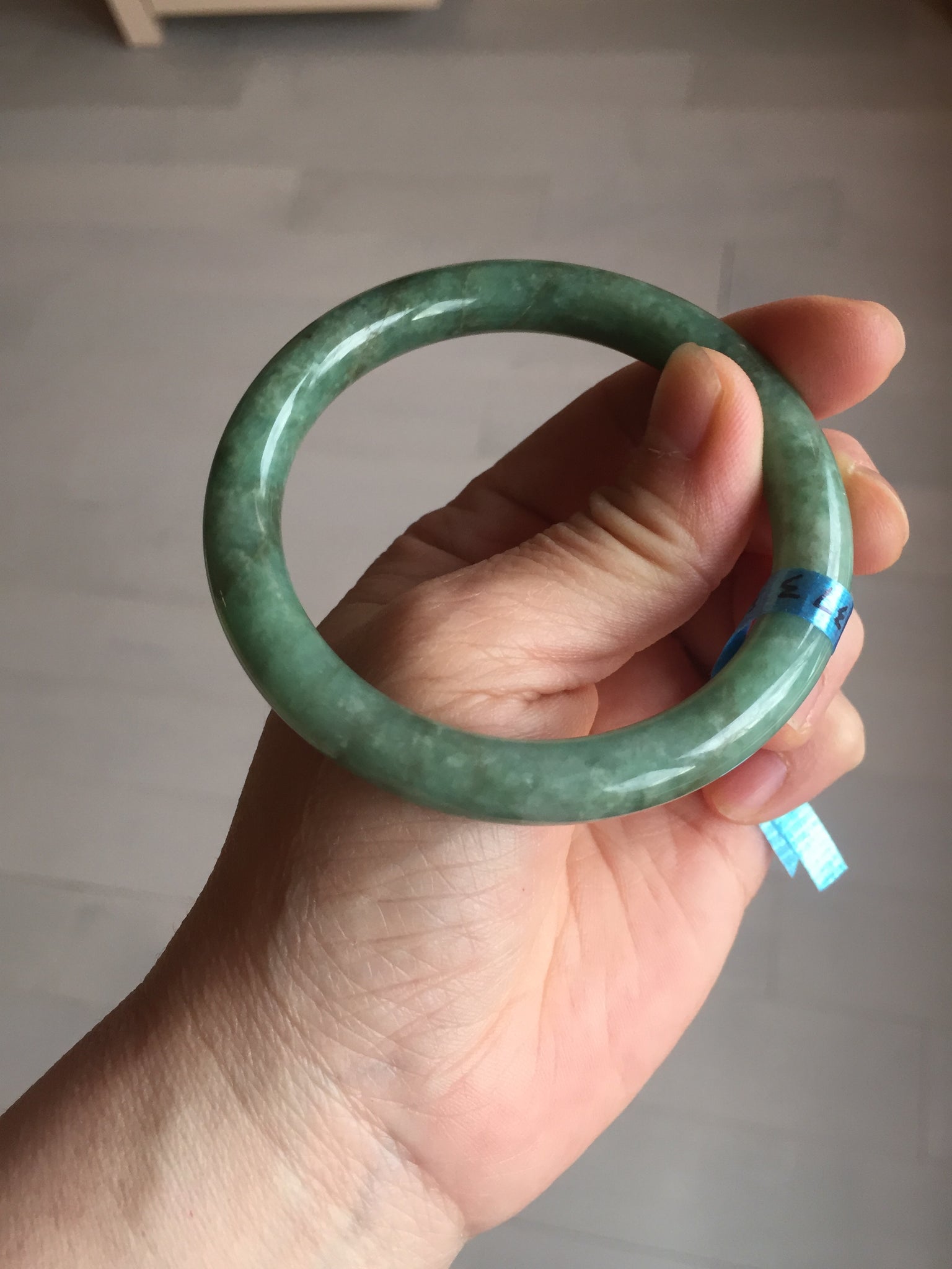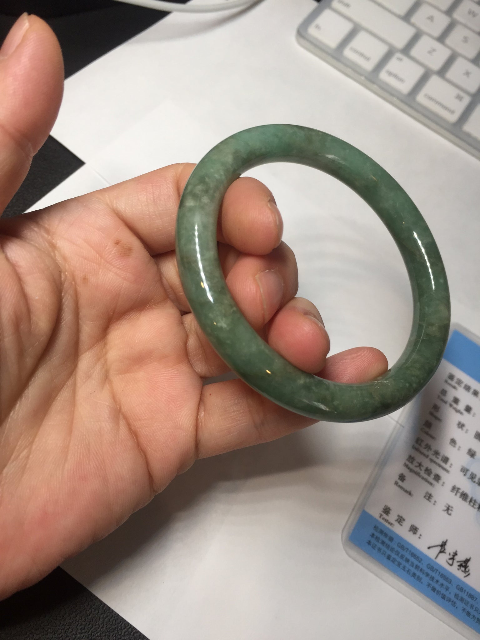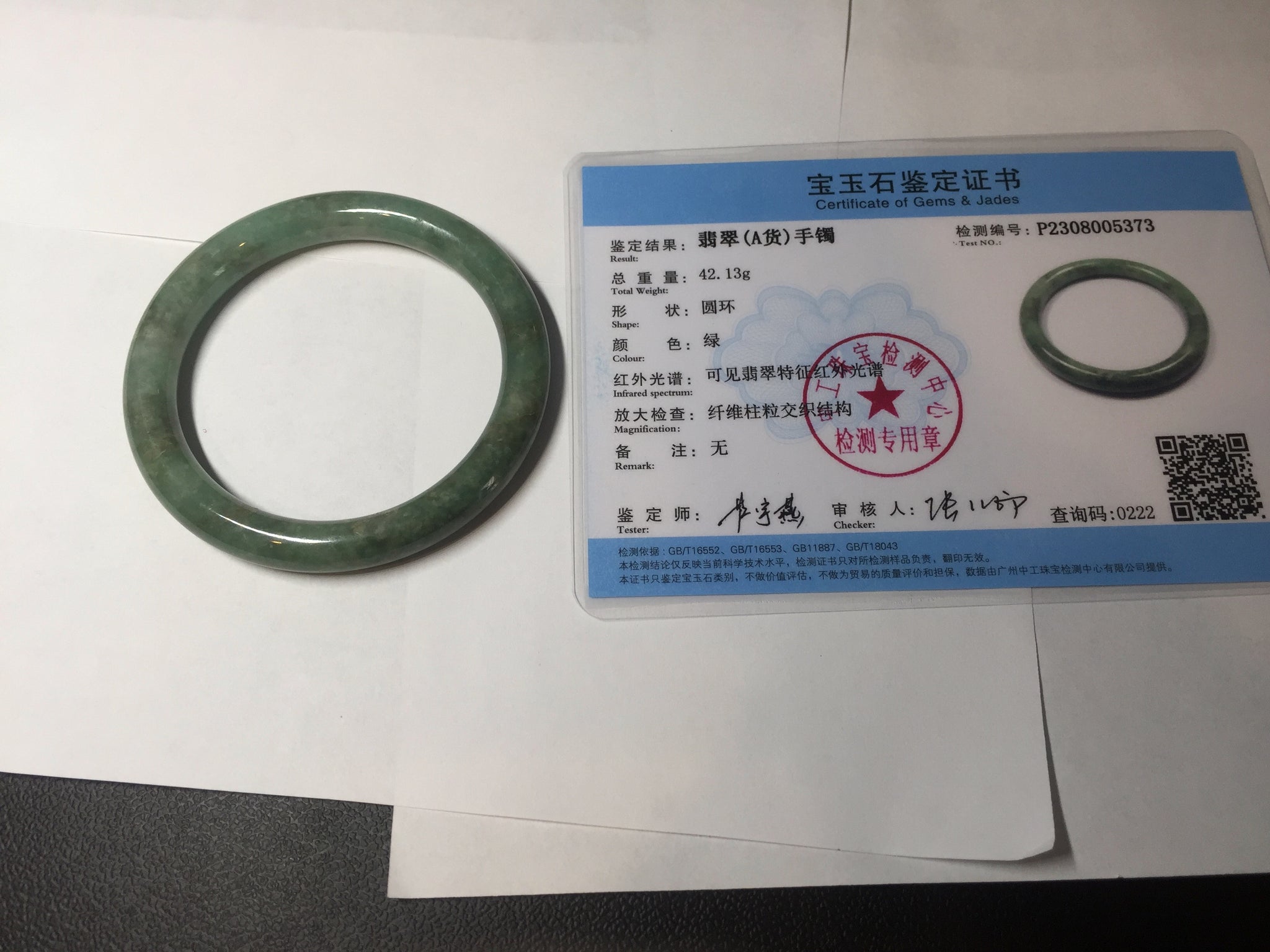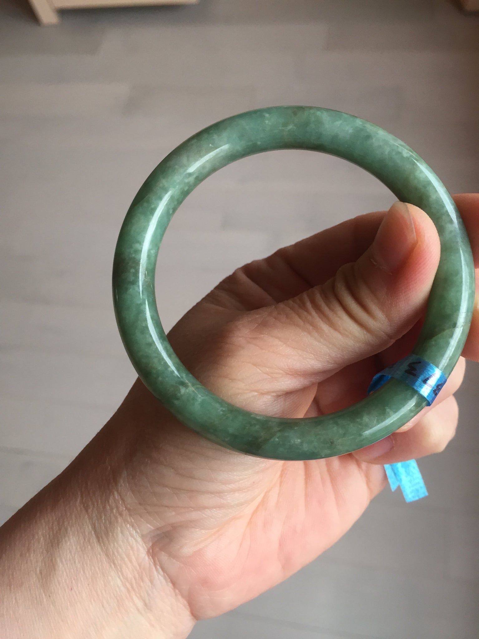 Some cracks(photos may not show all). The bangle is solid. Some hairlines. Some cotton lines and spots. Some brown areas. Some rough surfaces. Not transparent.