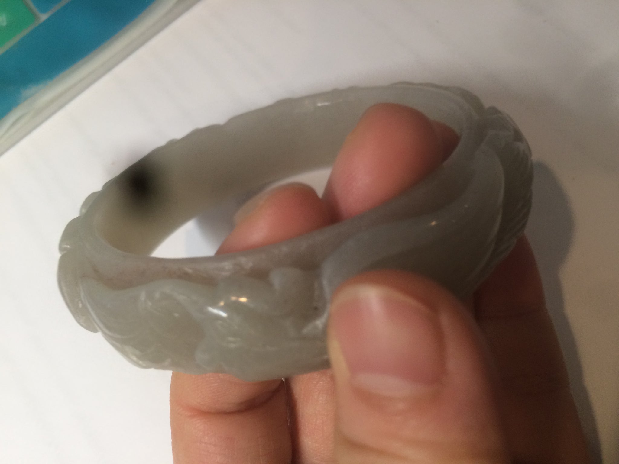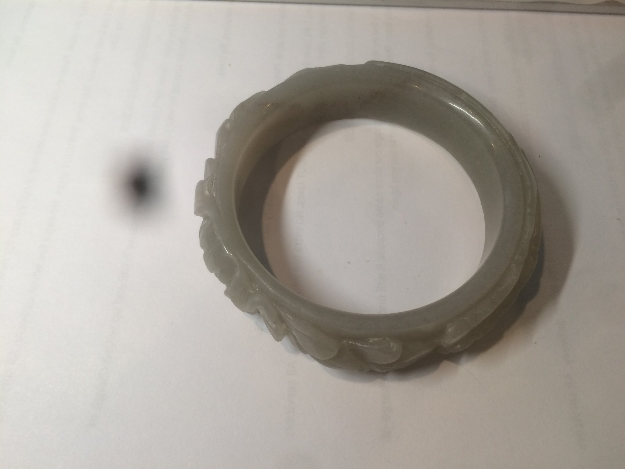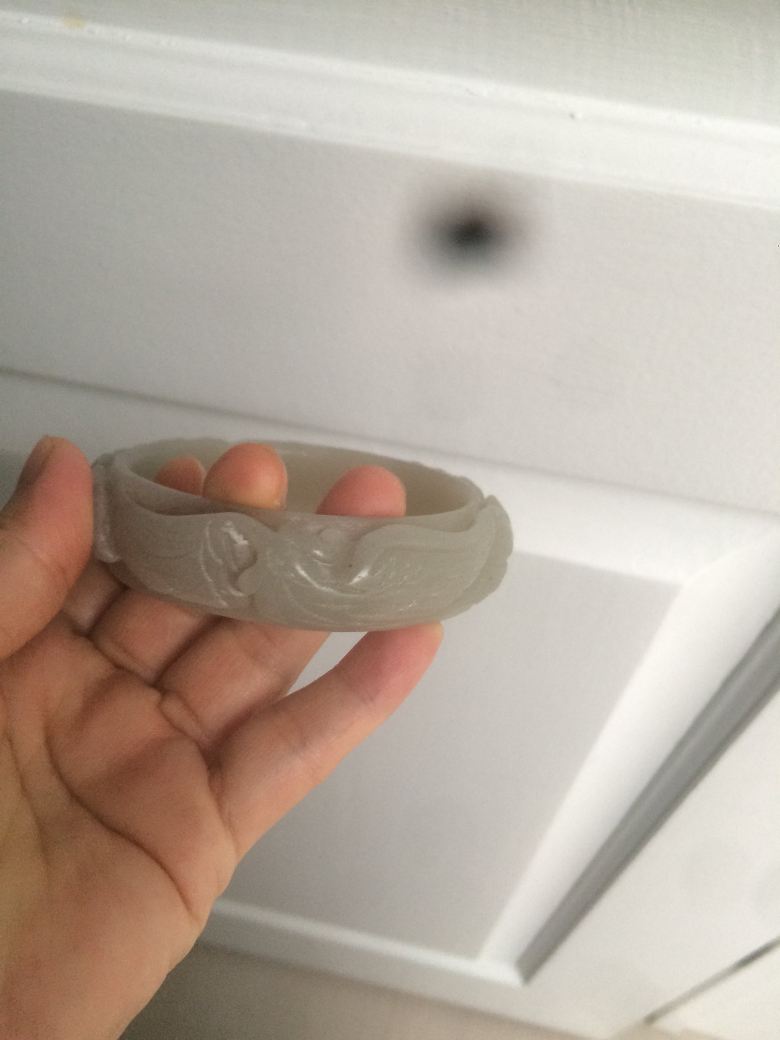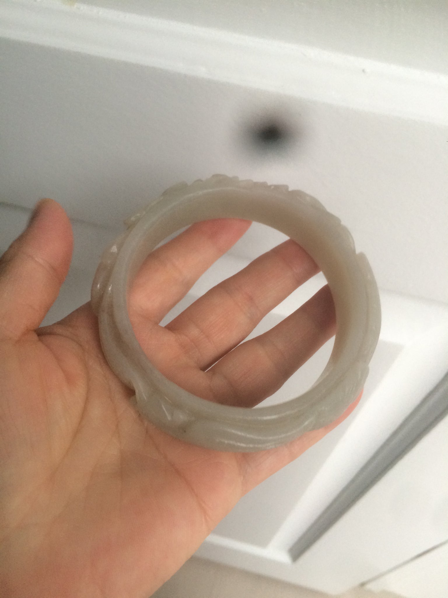 No crack. No hairline.  Not the finest carving work. Has some gary color. Coton spots.Some balck mineral spots.
