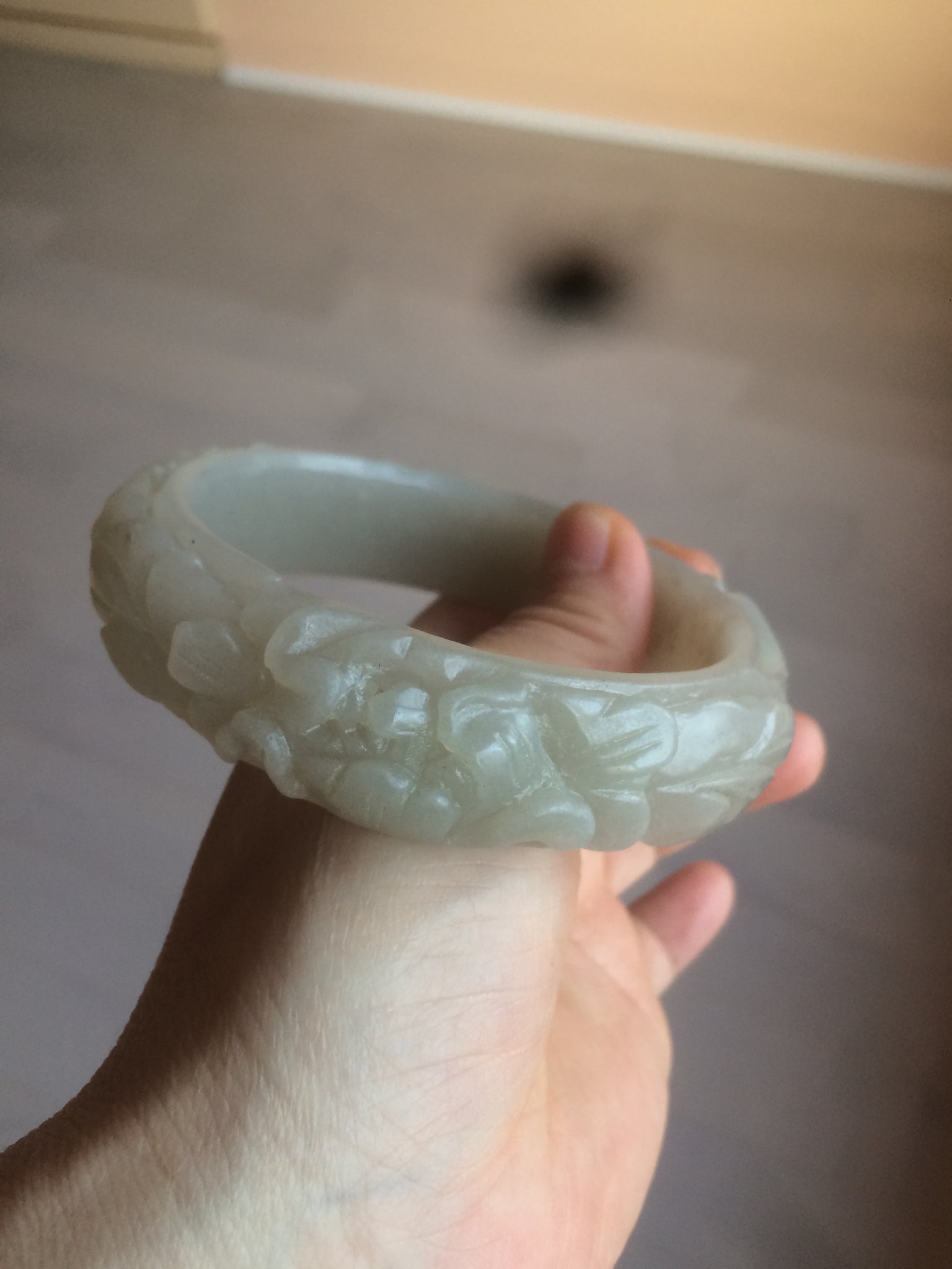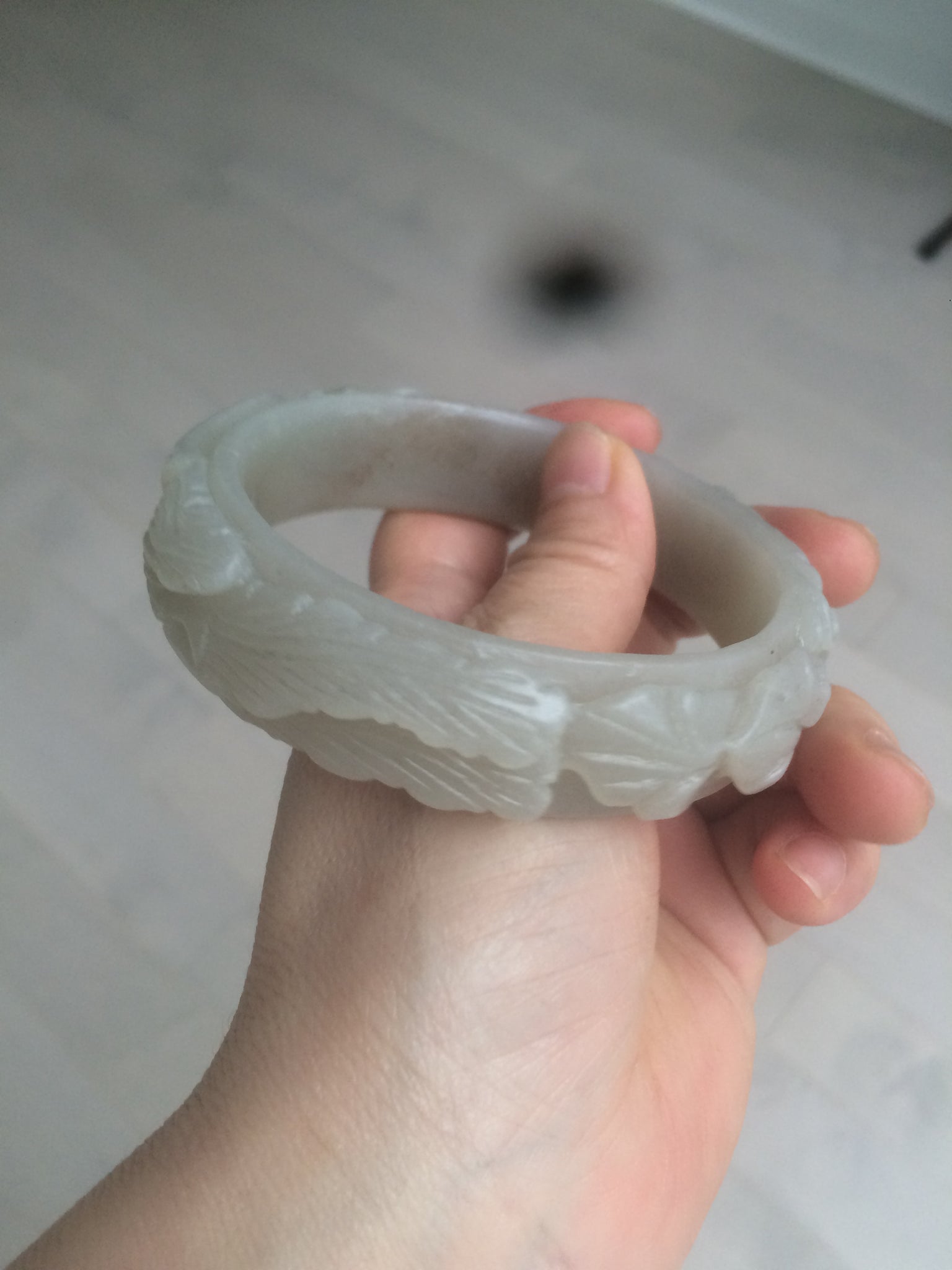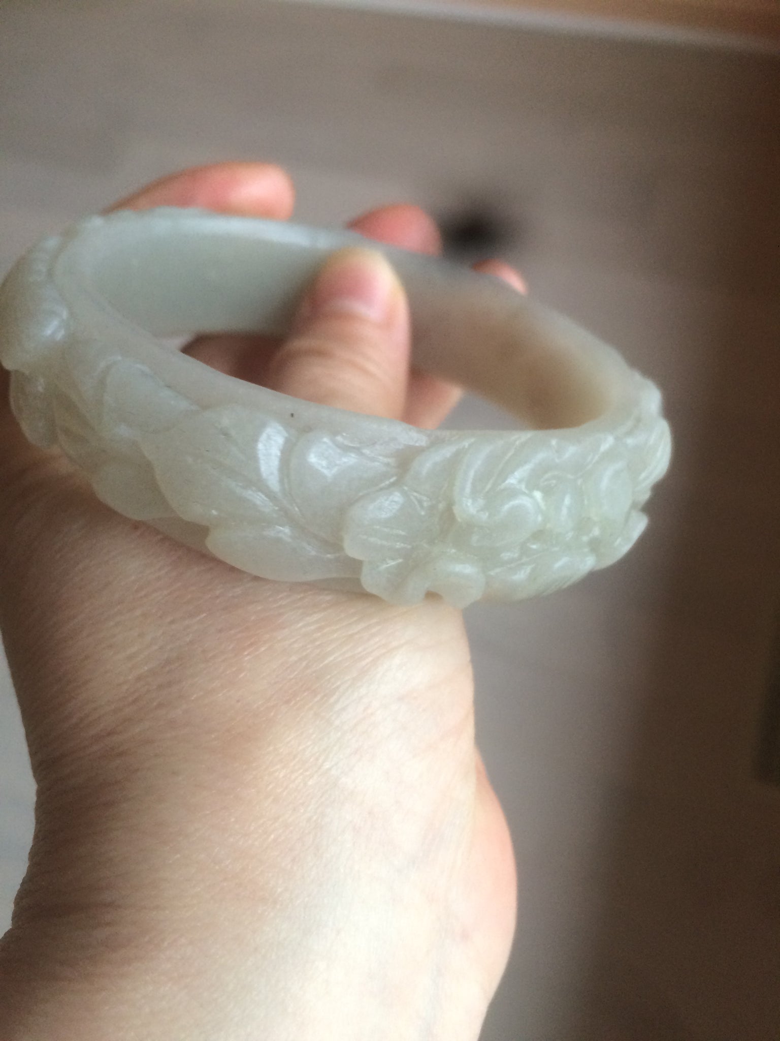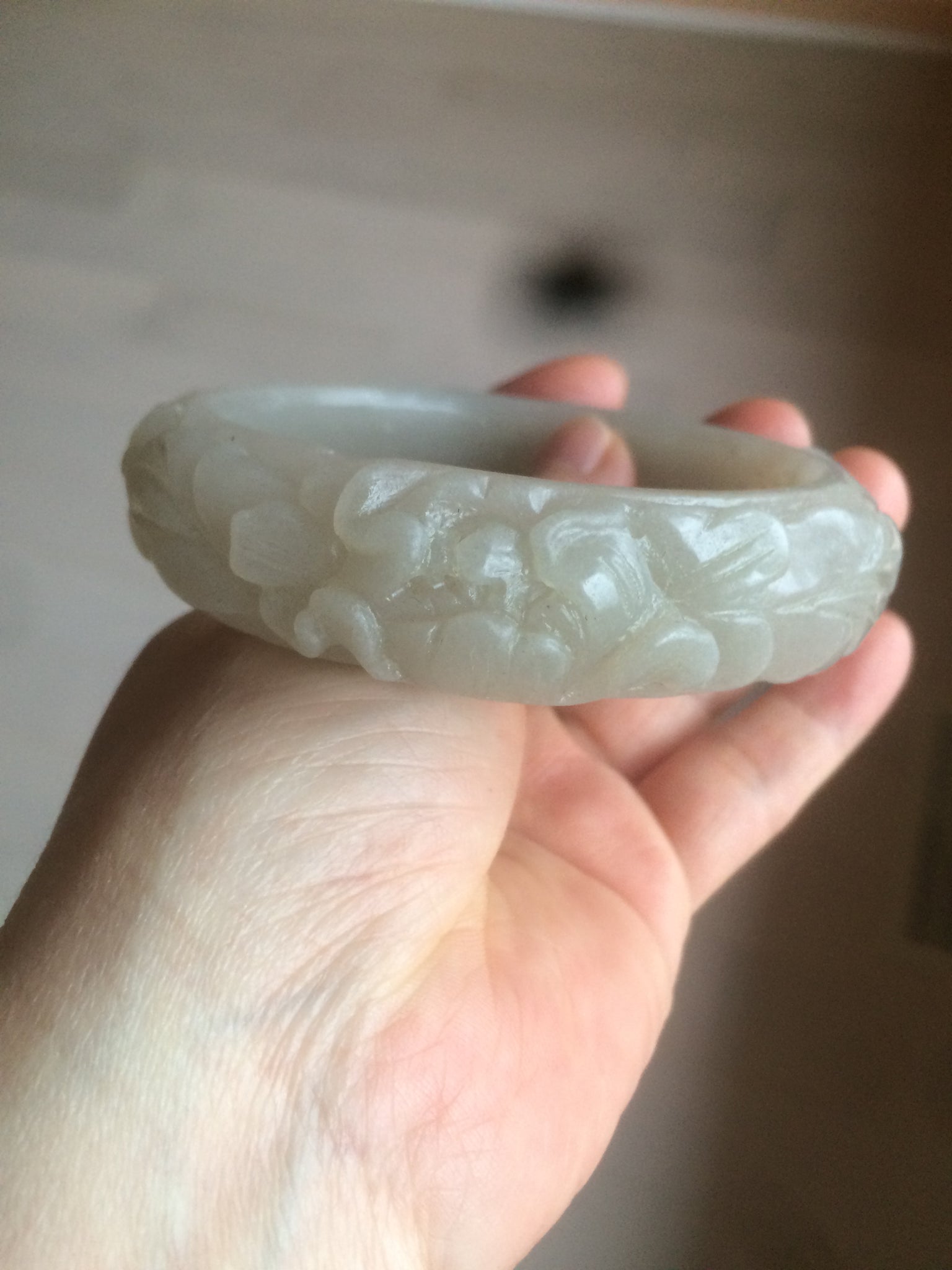 No crack. No hairline.  Not the finest carving work. Has some gary color. Coton spots.Some balck mineral spots.