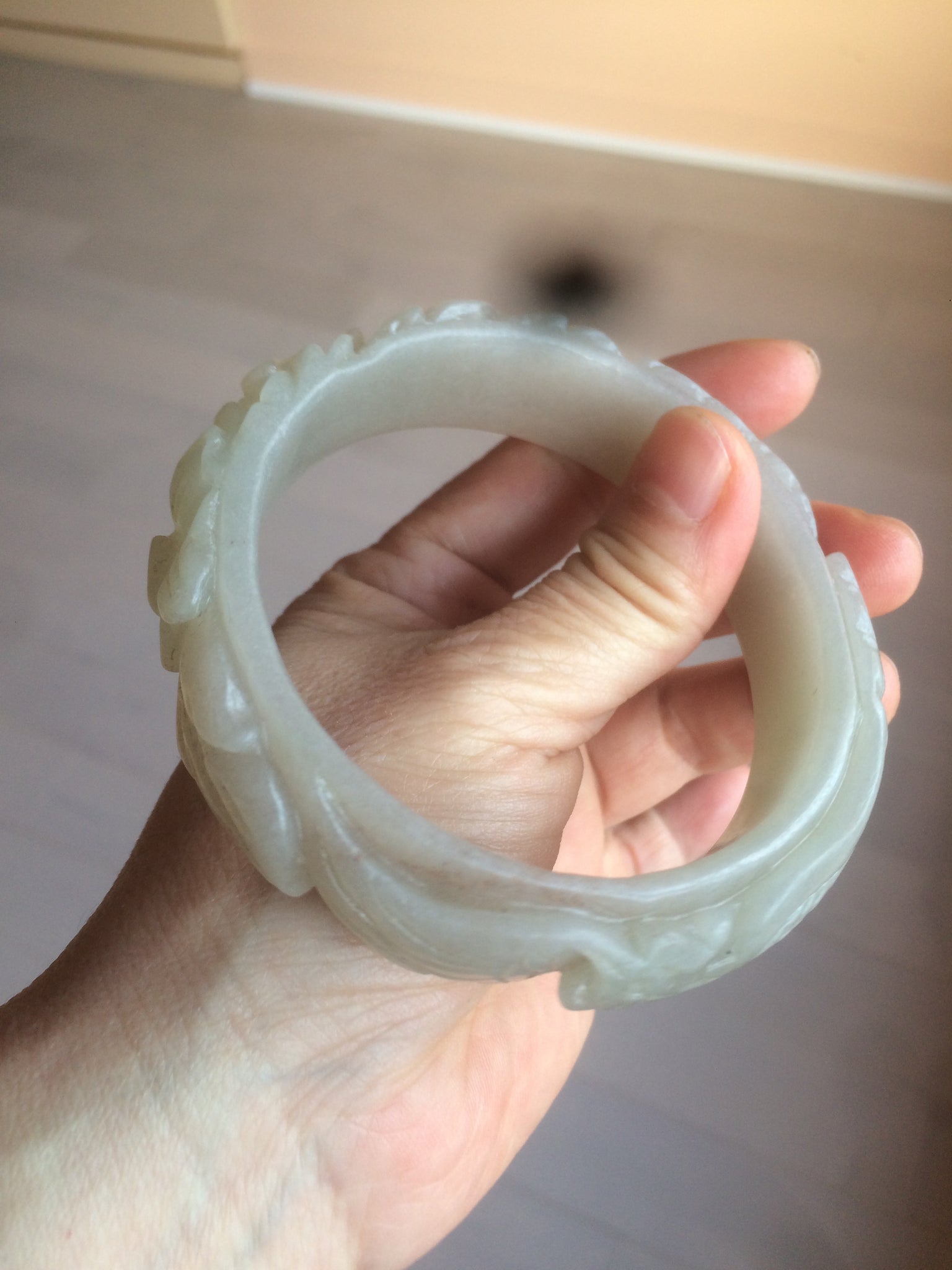 63.6mm 100% natural light pale pink/gray Quartzite (Shetaicui jade) Phoenix and Peony bangle XY8