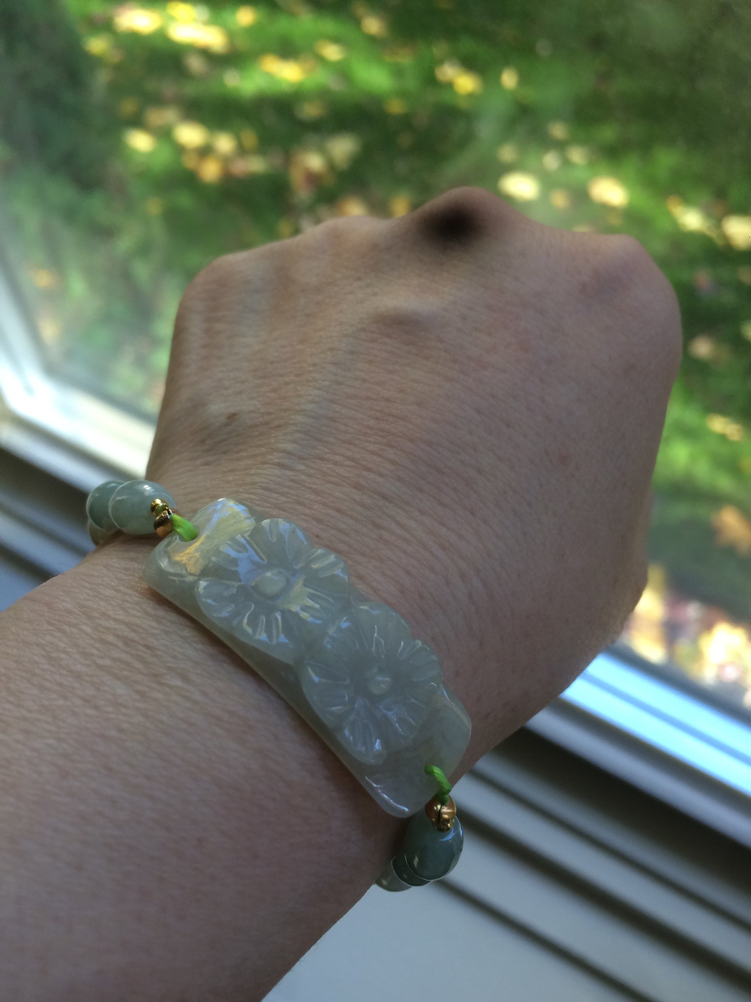 Type A 100% Natural light green/white carving flowers vintage style Jadeite Jade bracelet Z