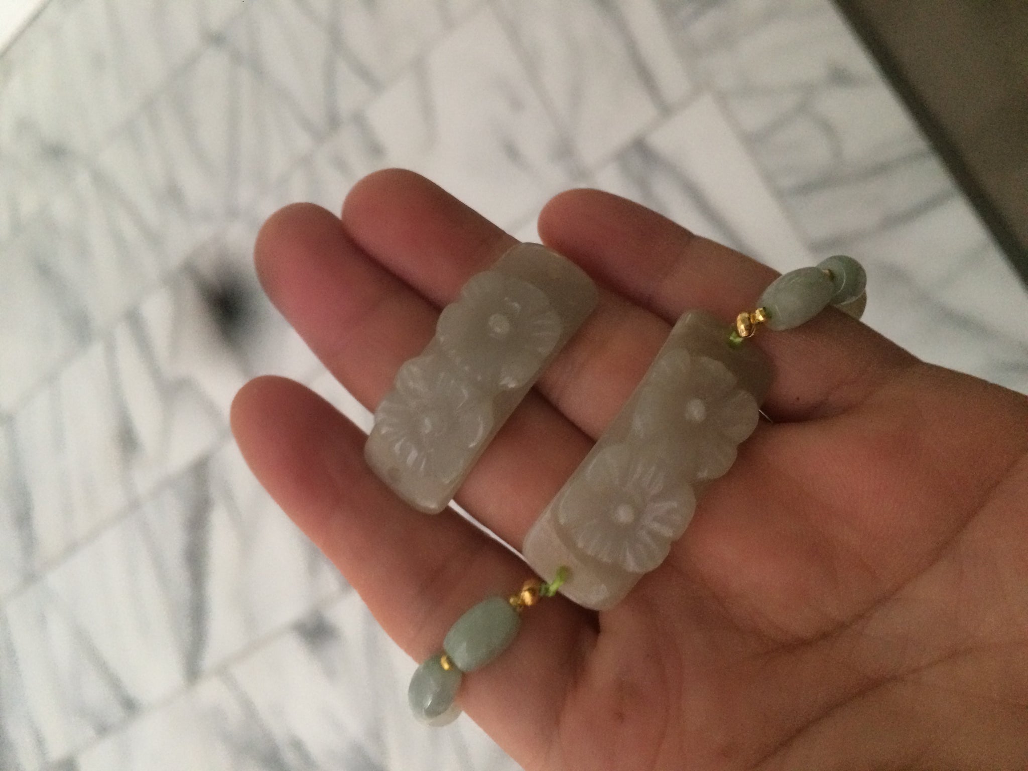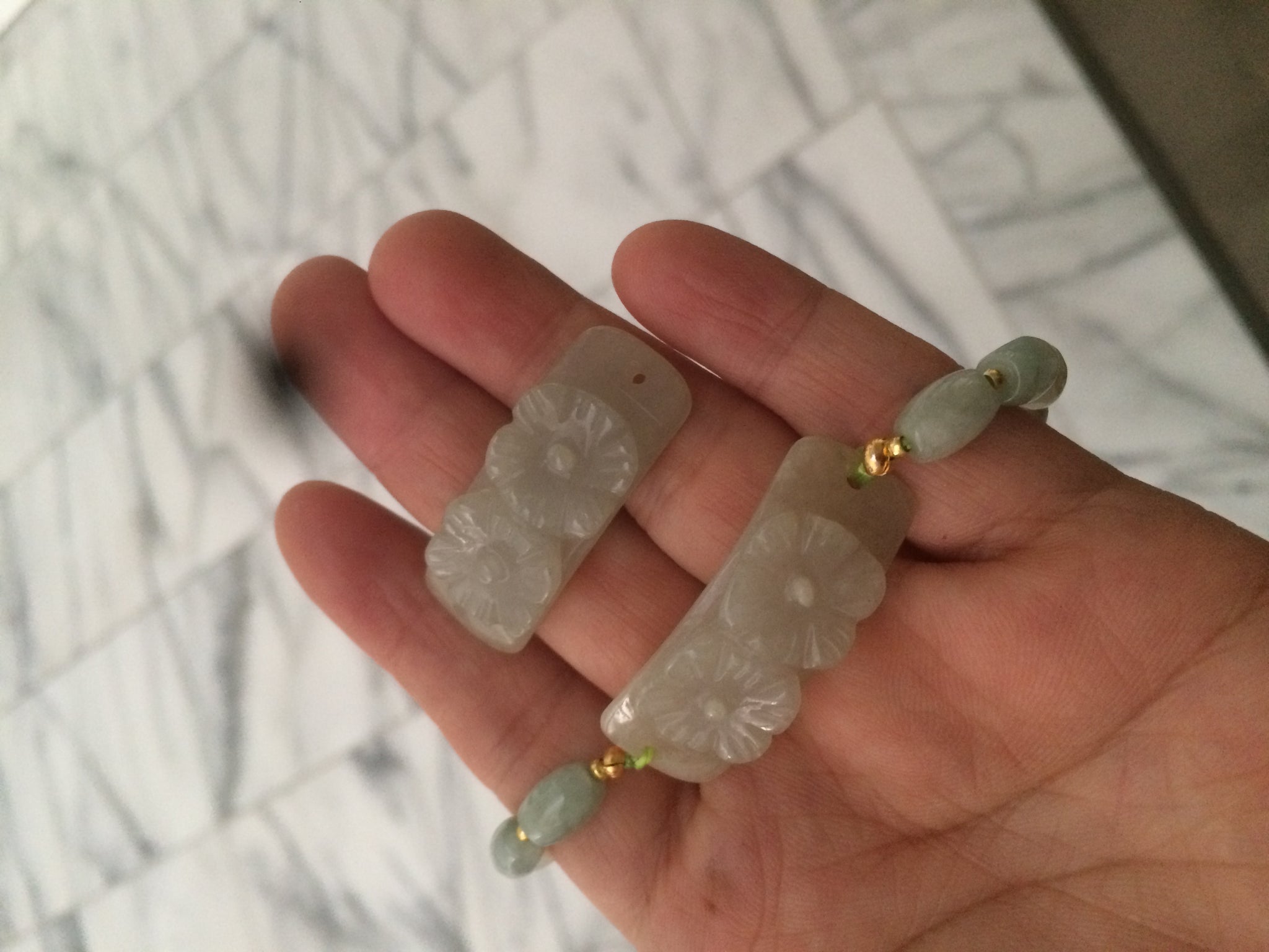 • Load image into Gallery viewer, Type A 100% Natural light green/white carving flowers vintage style Jadeite Jade bracelet Z