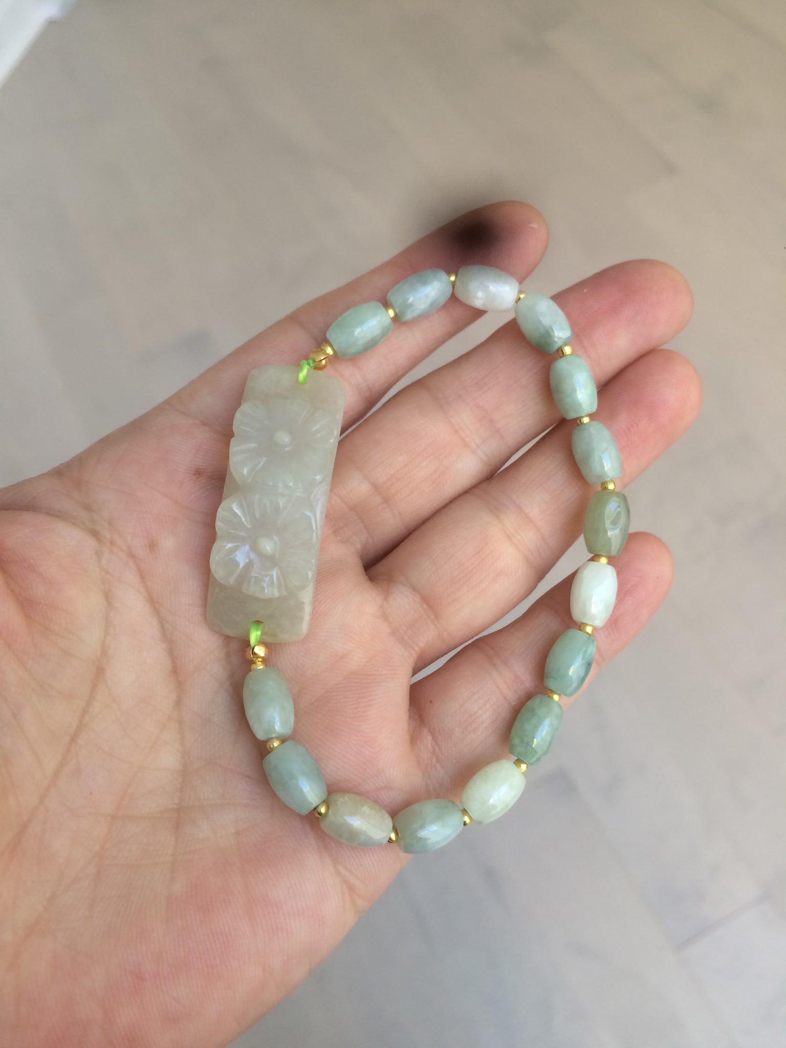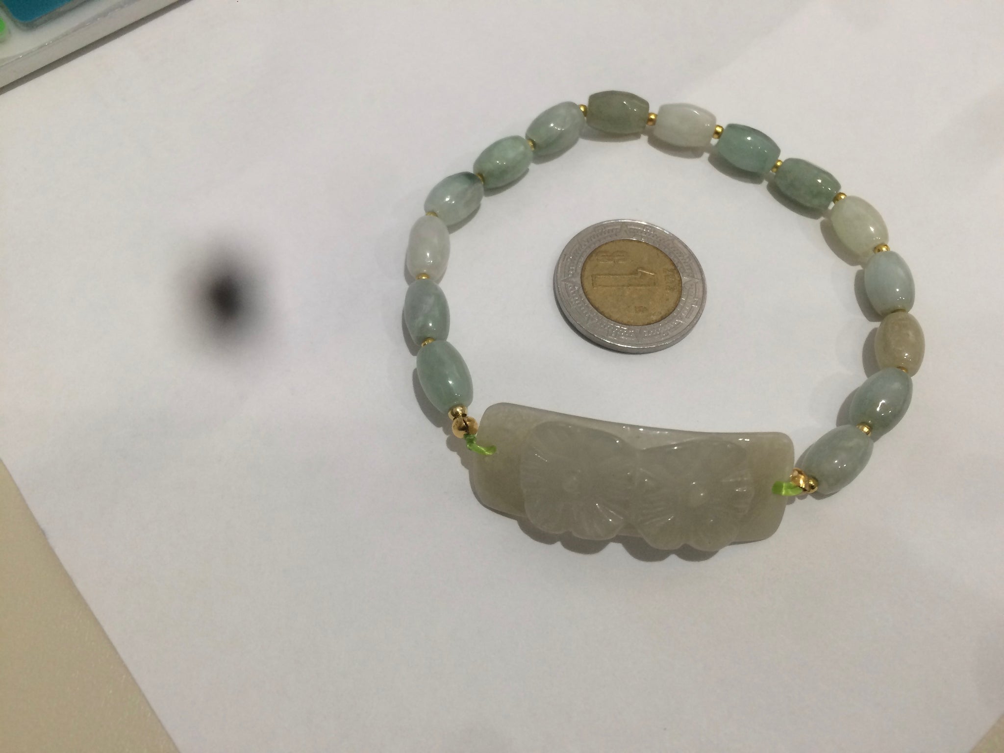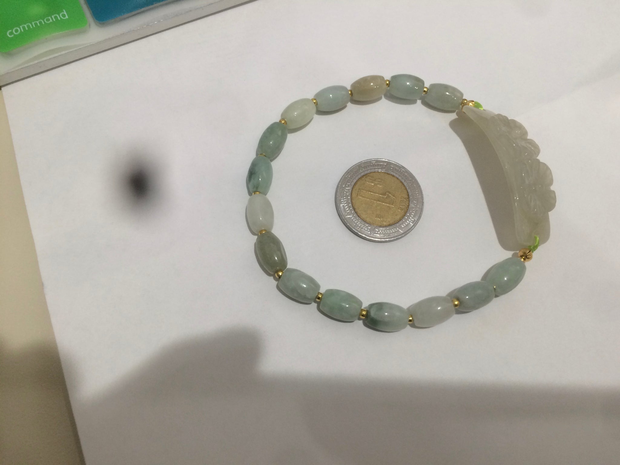 Beads: 8.7x5.6mm. One bead has crack. some beads may have hairline, color toor, cotton area. For a hand bigger than size  57mm.