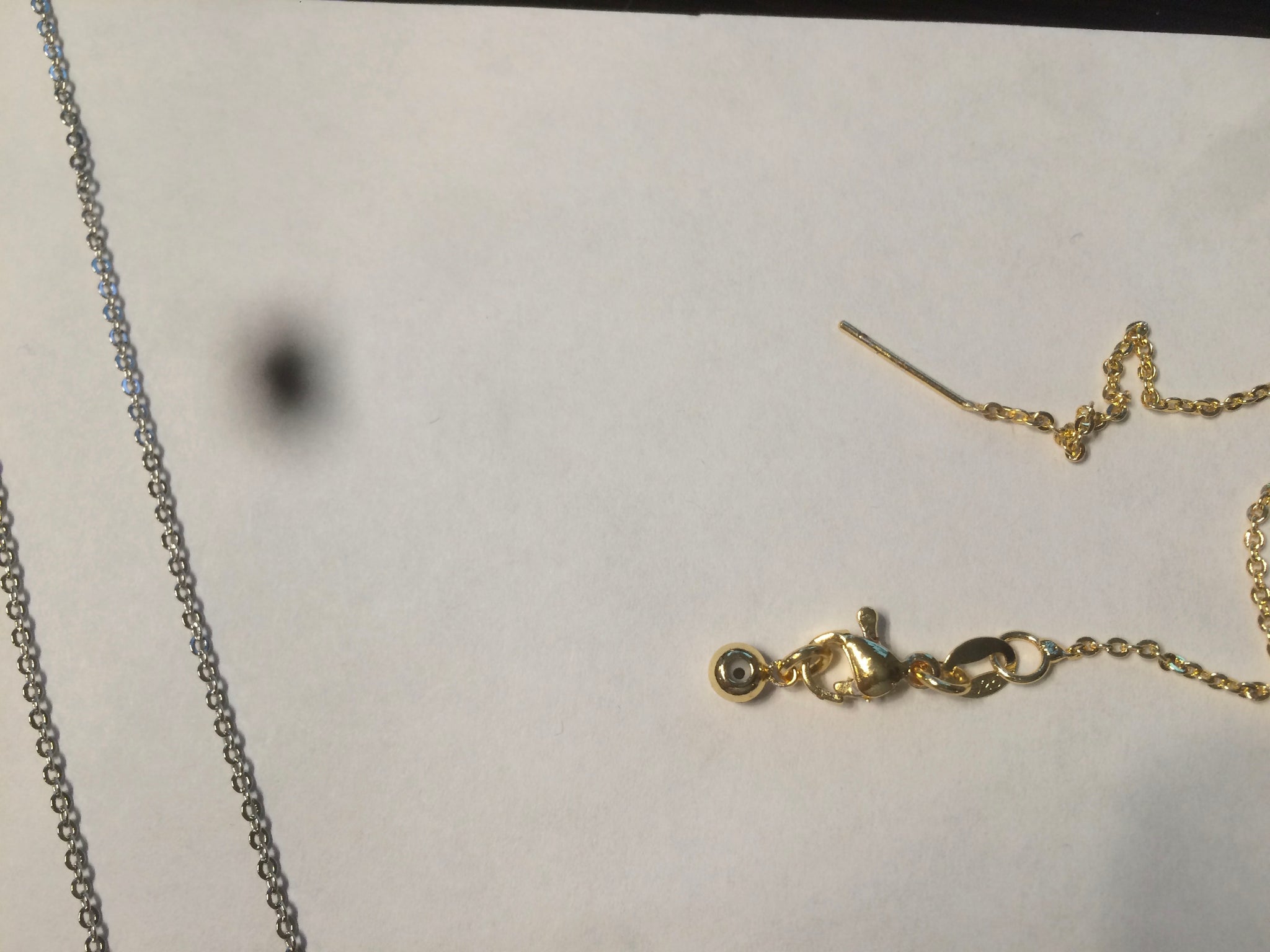 Chian: alloy. Adjustable needle end, so you can adjust the length and may add some other beads yourself if you like.