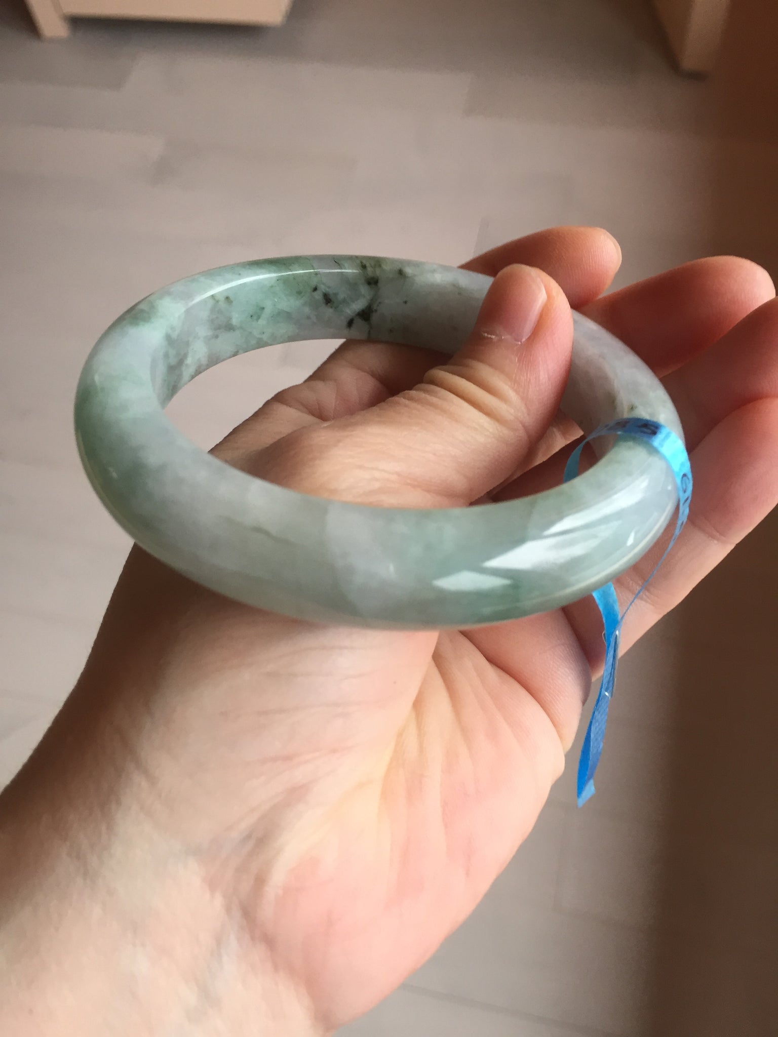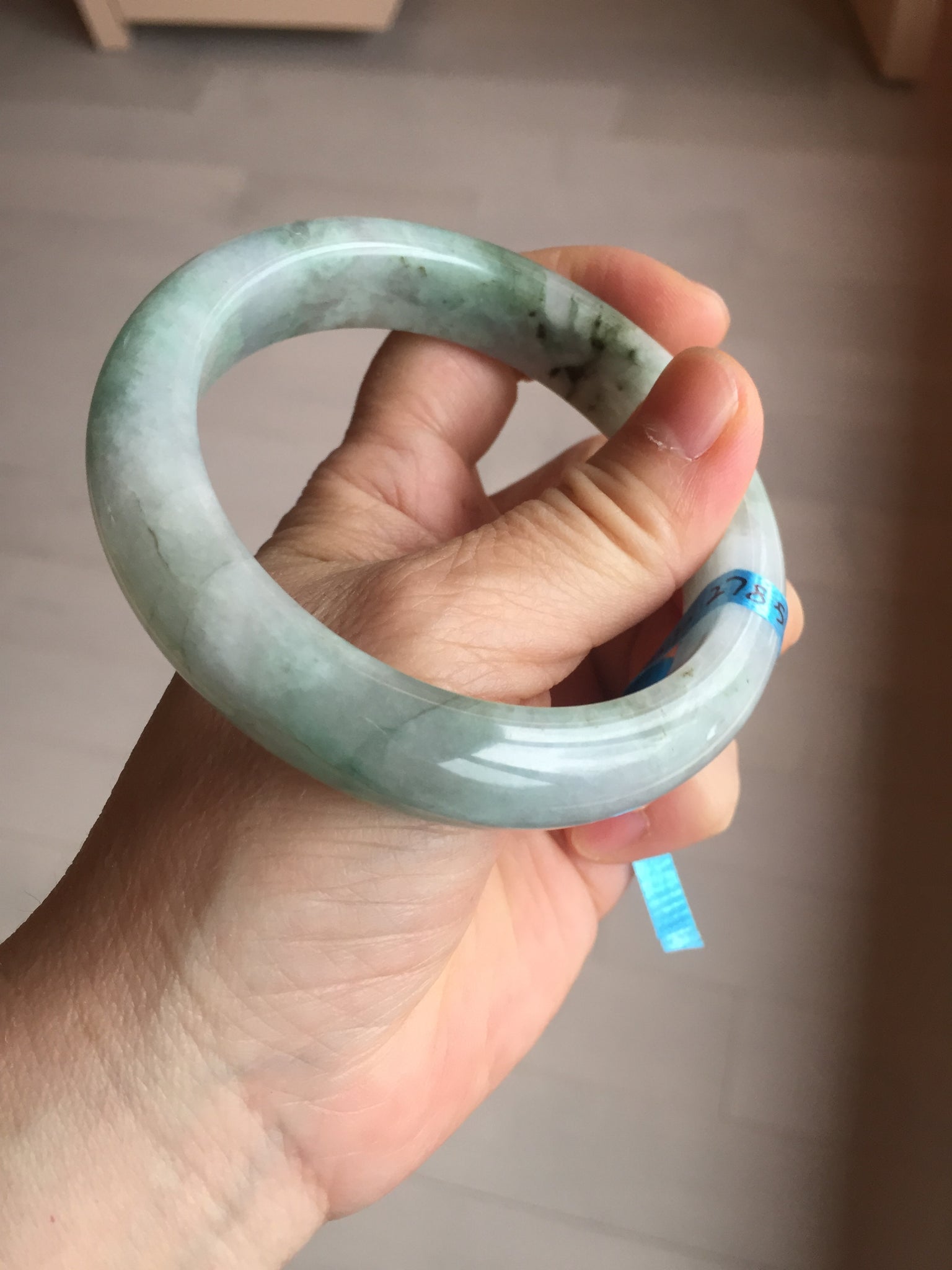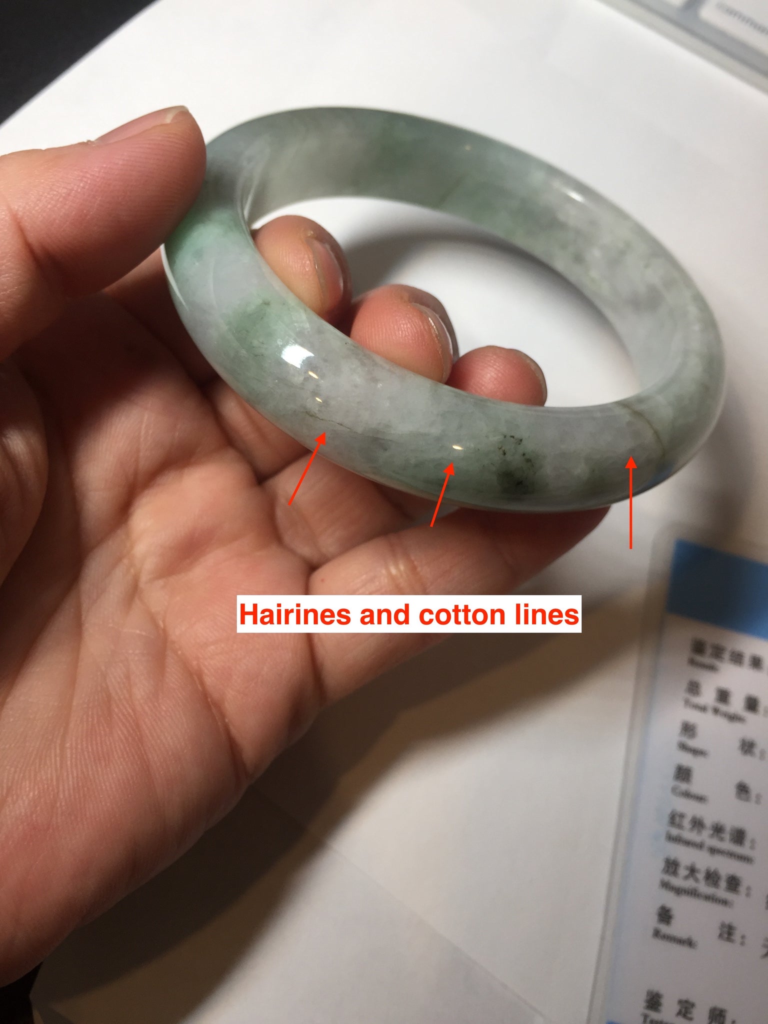 One around-the-bangle crack root crack with fissures, the bangle is still solid (guaranteed!). It makes a high-pitched sound when clicked. Some hairlines and color roots.  Some cotton lines, spots, and areas. Some black spots and areas.