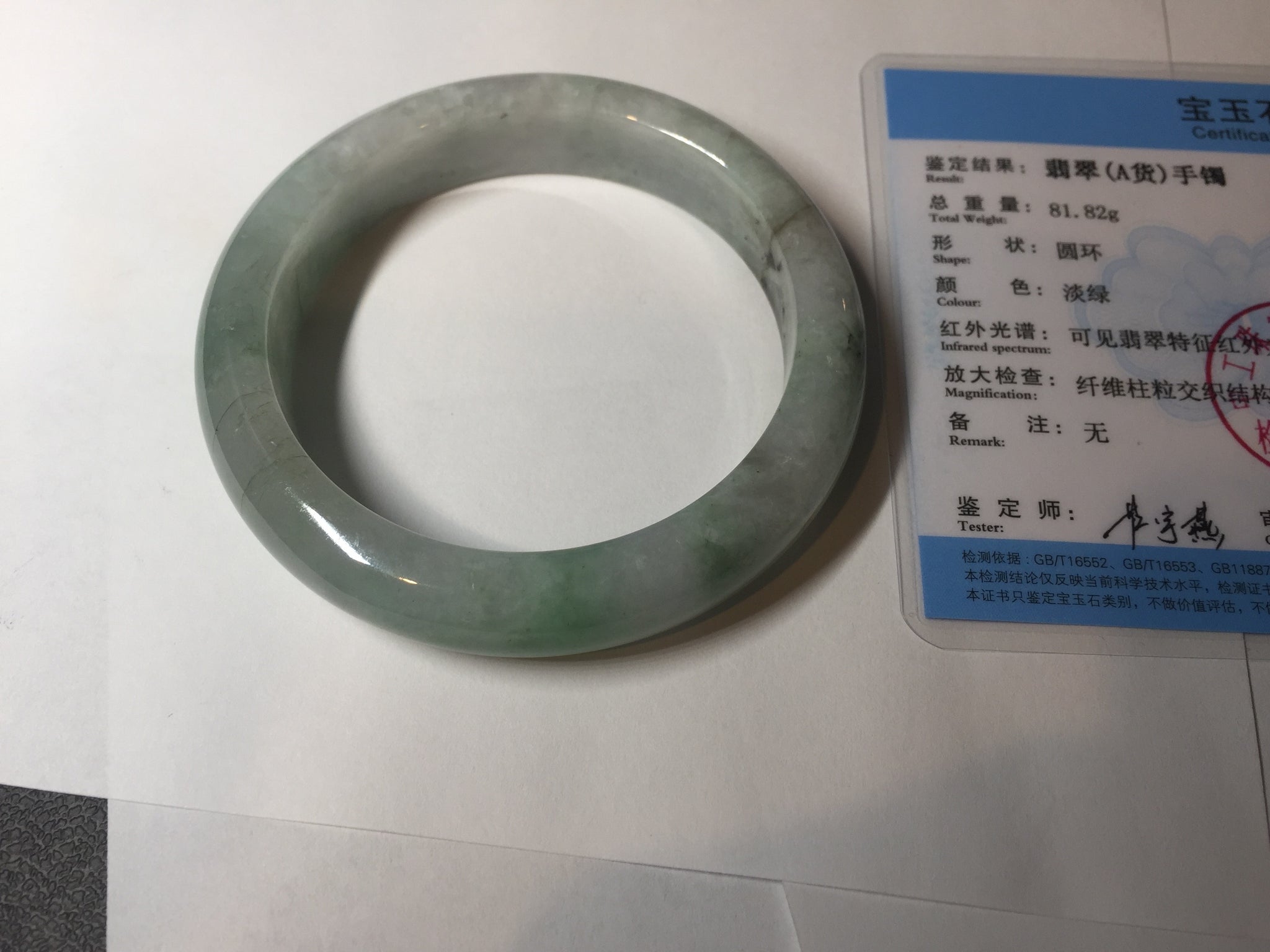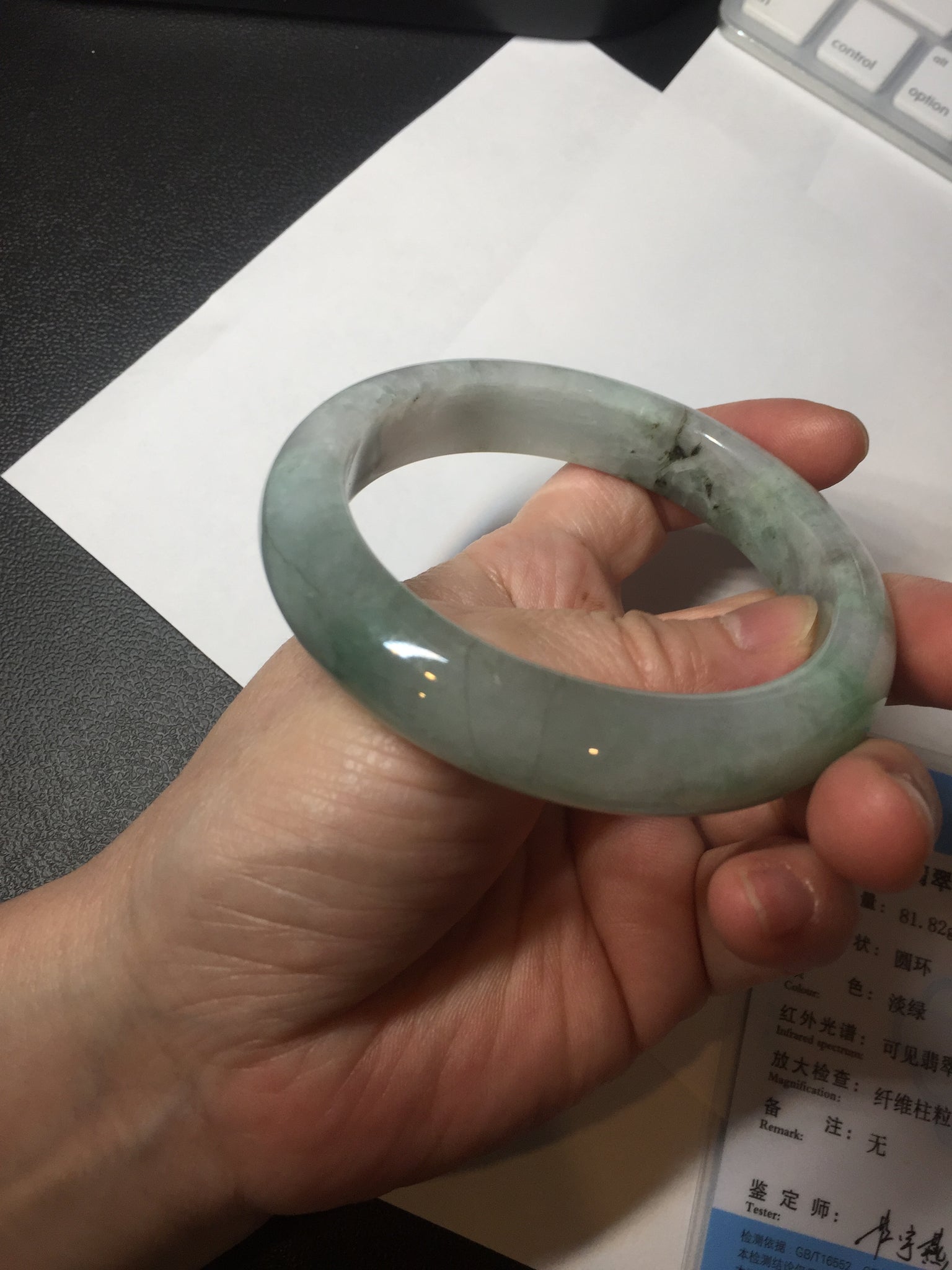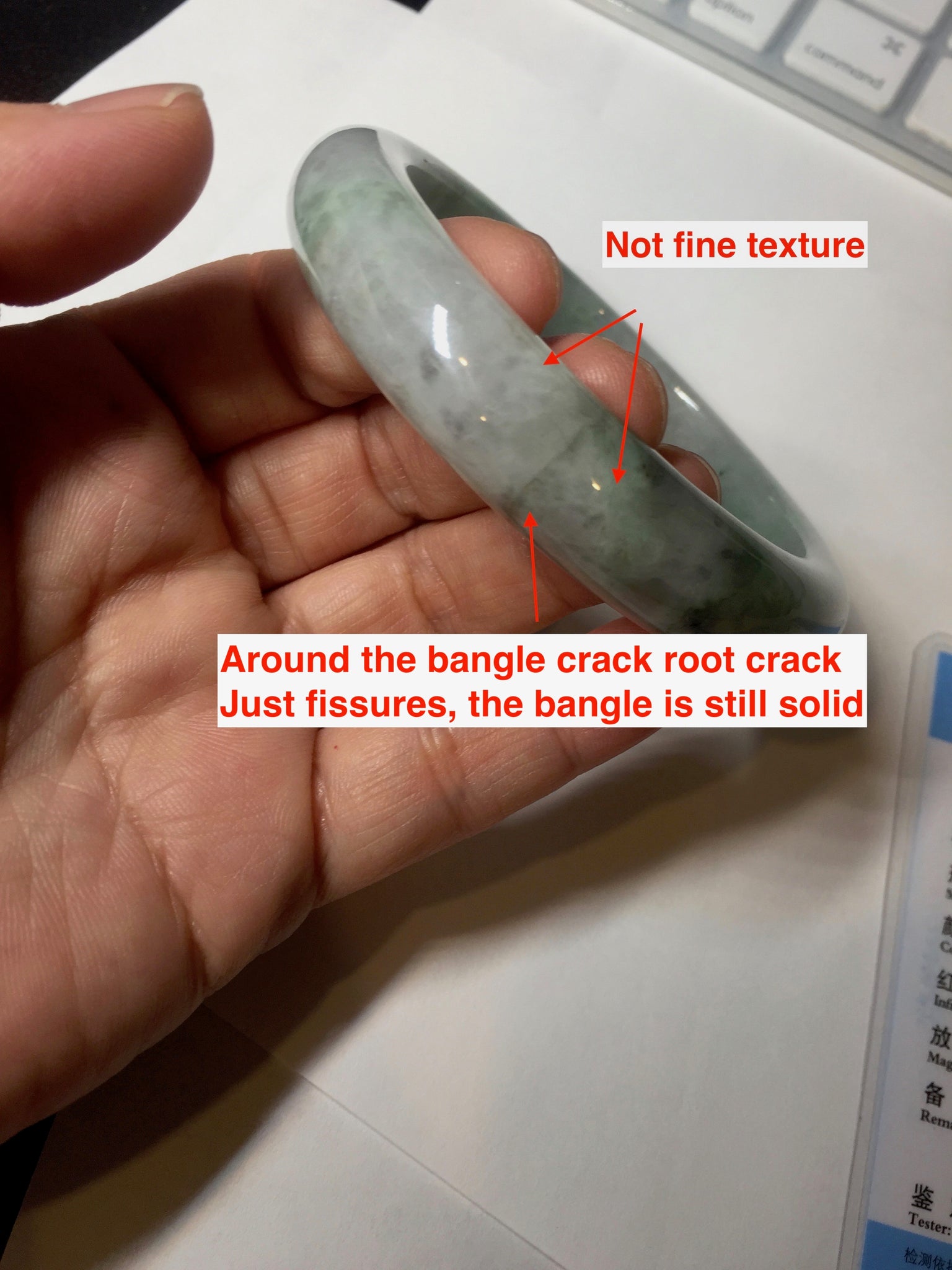 One around-the-bangle crack root crack with fissures, the bangle is still solid (guaranteed!). It makes a high-pitched sound when clicked. Some hairlines and color roots.  Some cotton lines, spots, and areas. Some black spots and areas.