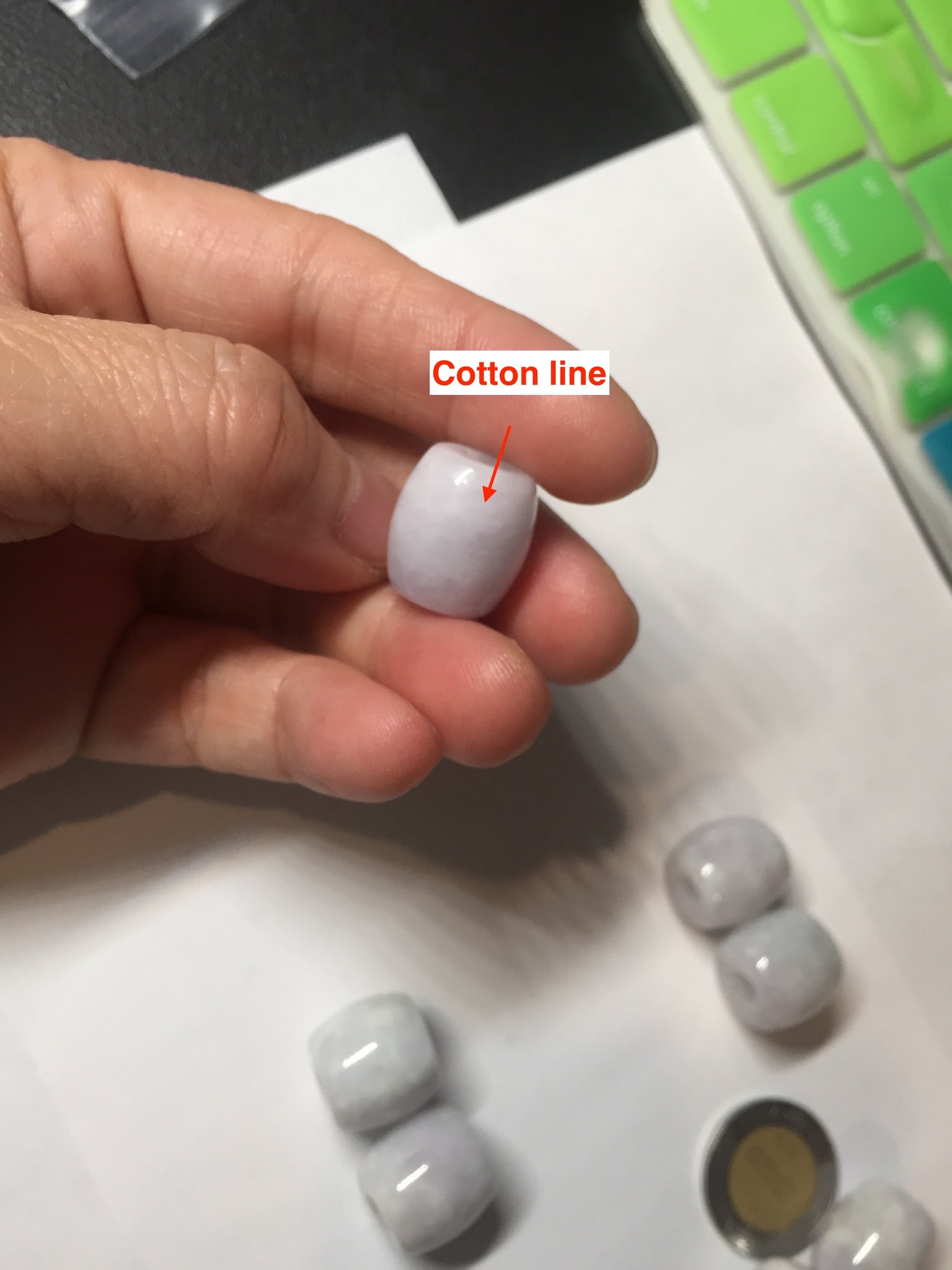 No crack. No hairlines. Has some cotton areas or cotton lines. The purple is very light, lighter than in the photos due to the purple color always being more camera-friendly.