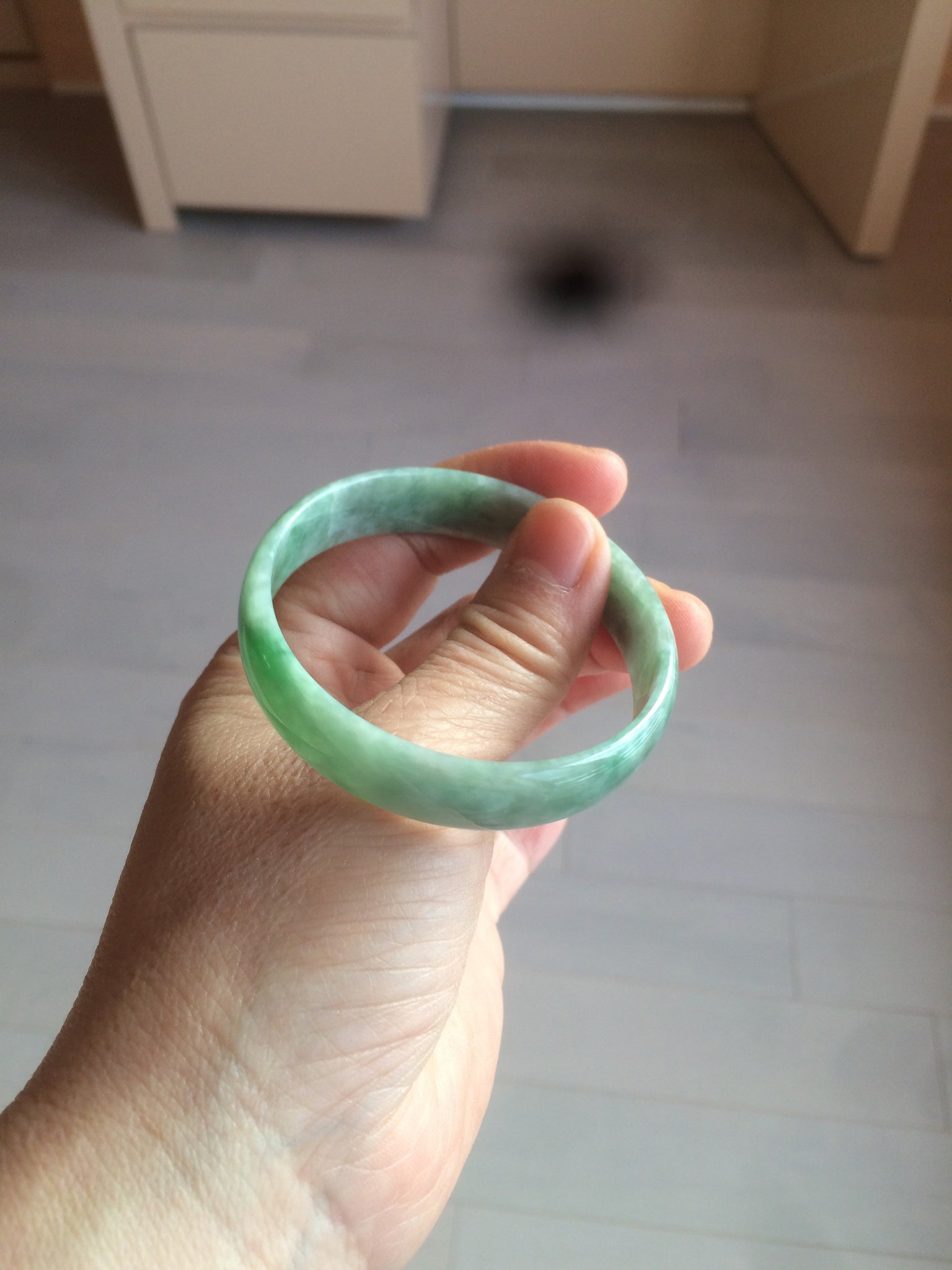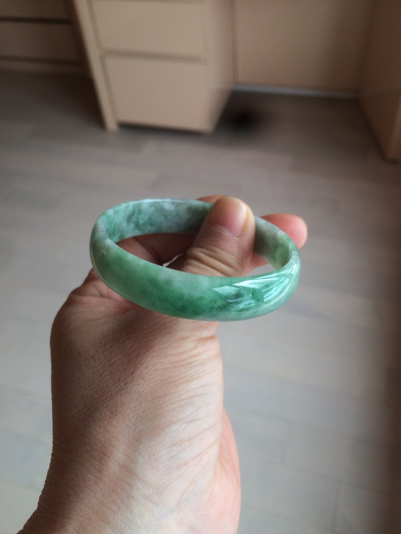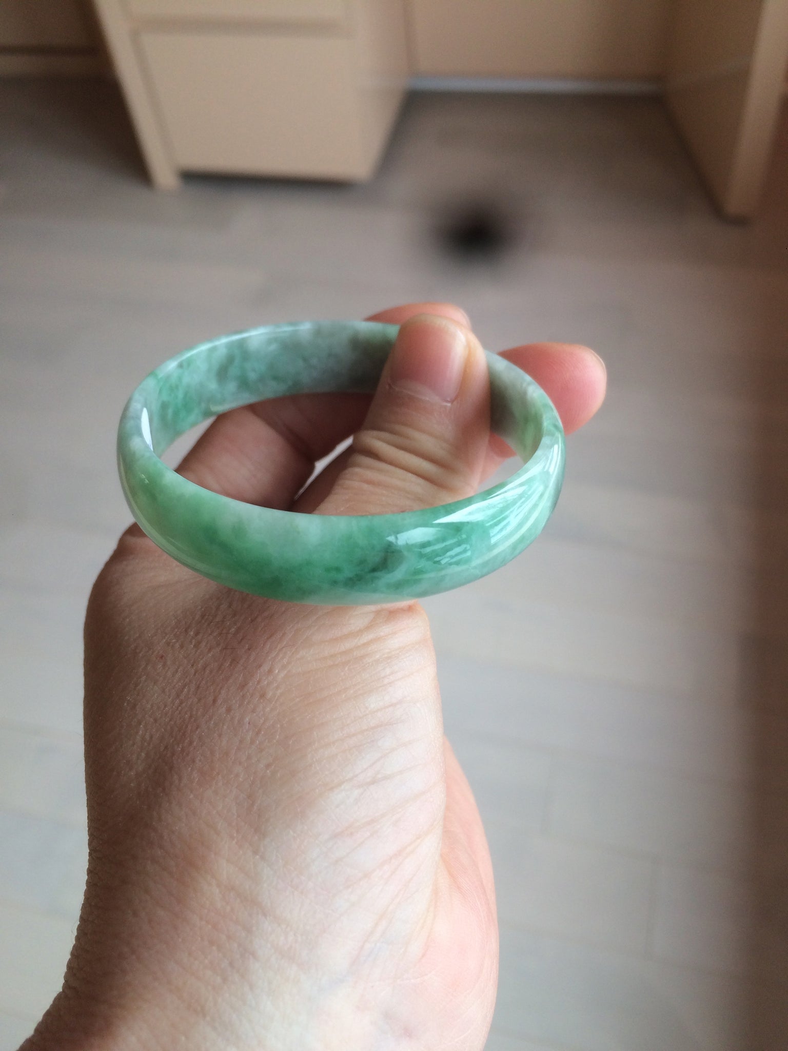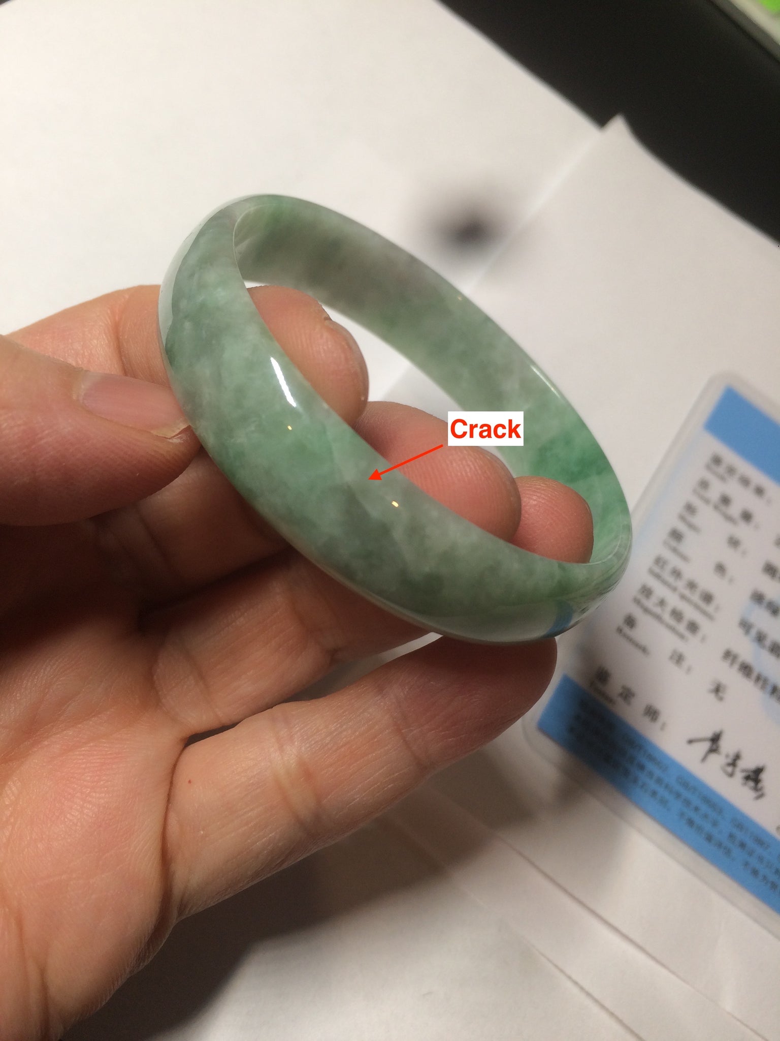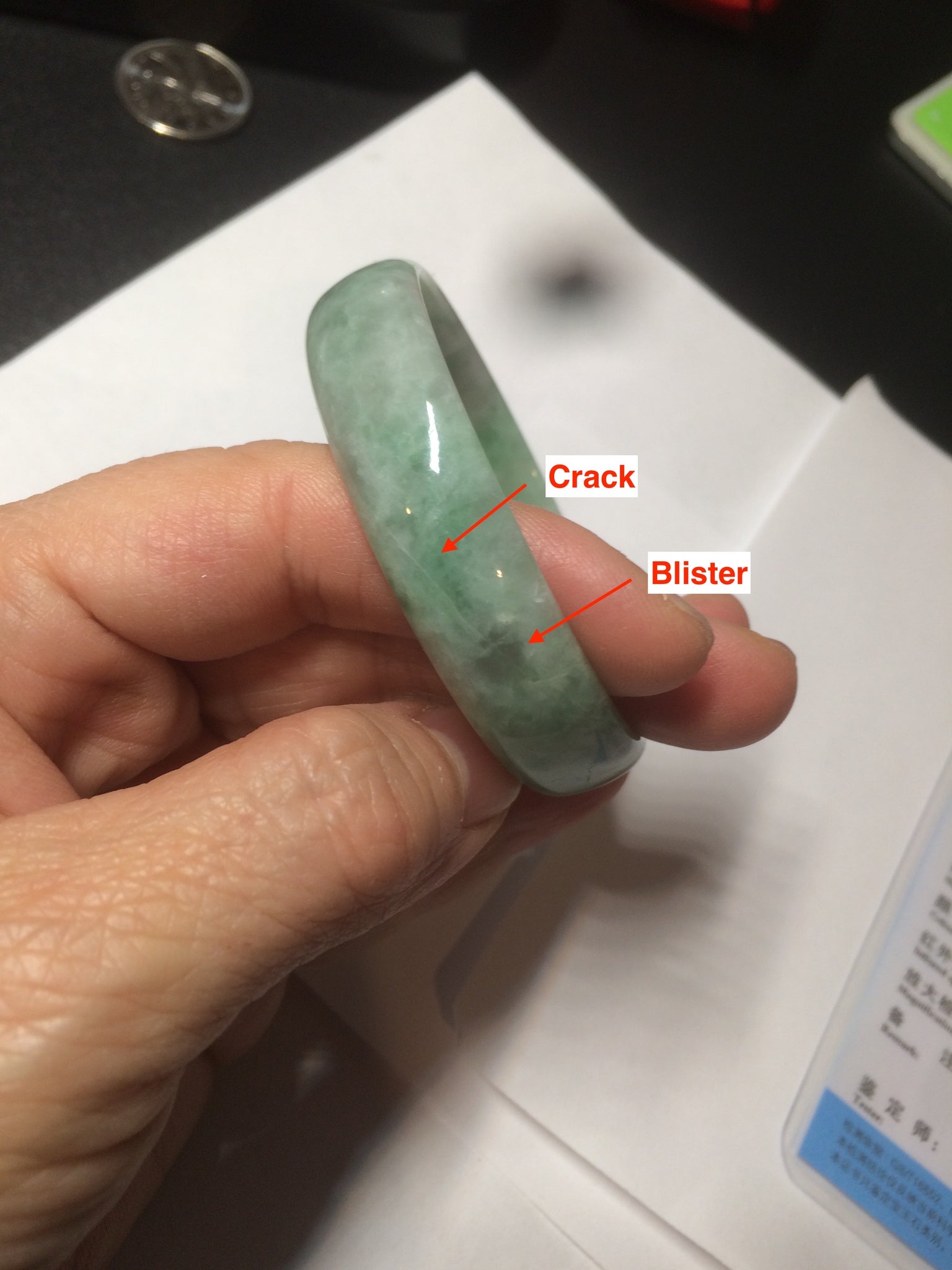 Some cracks (not all shown in the photos). The bangle is solid (guaranteed!). Some hairlines. Quite a lot of cotton spots and lines. The texture is not so fine. Cotton lines, spots, and areas. Blisters. It has a gray color.
