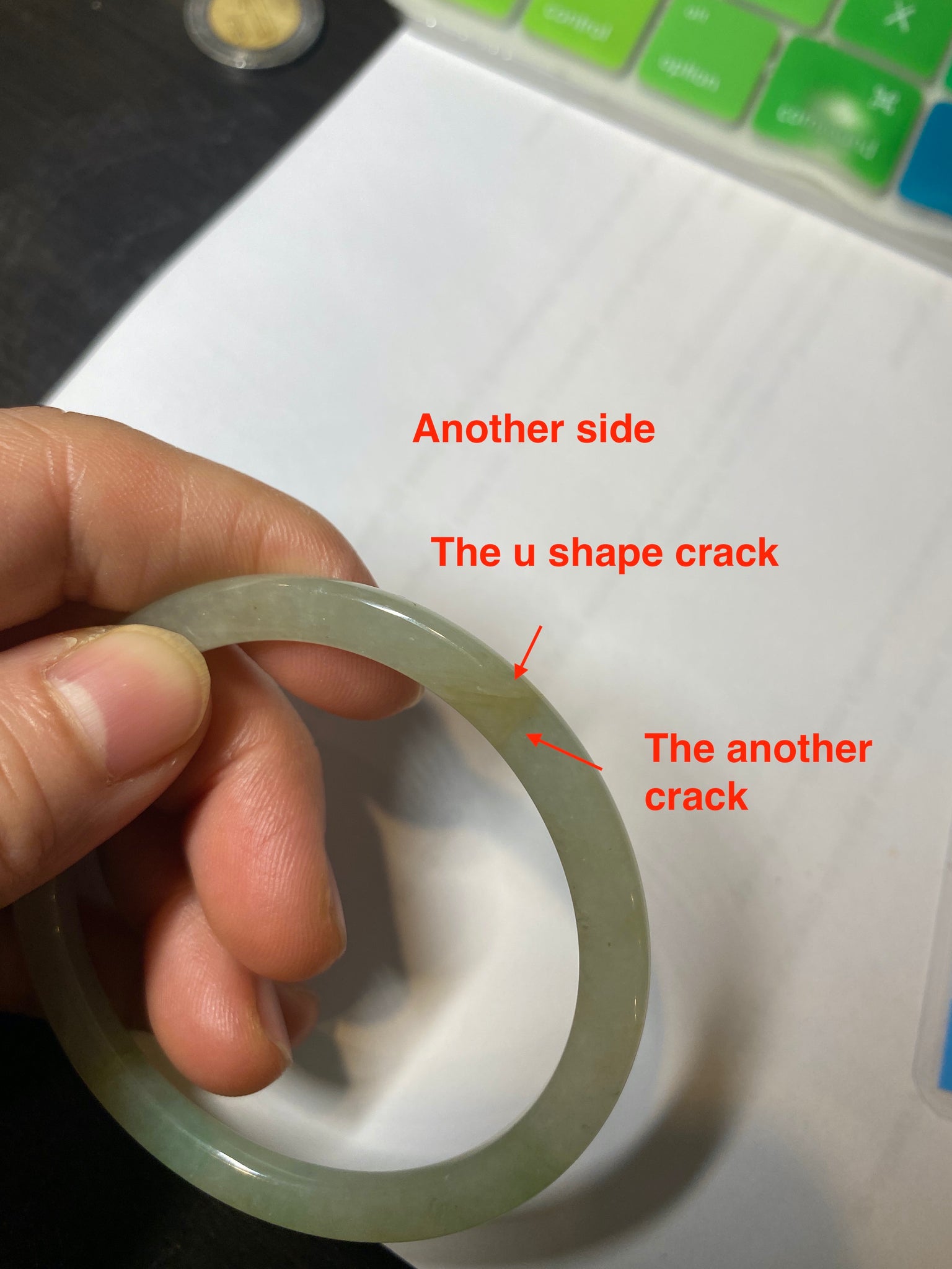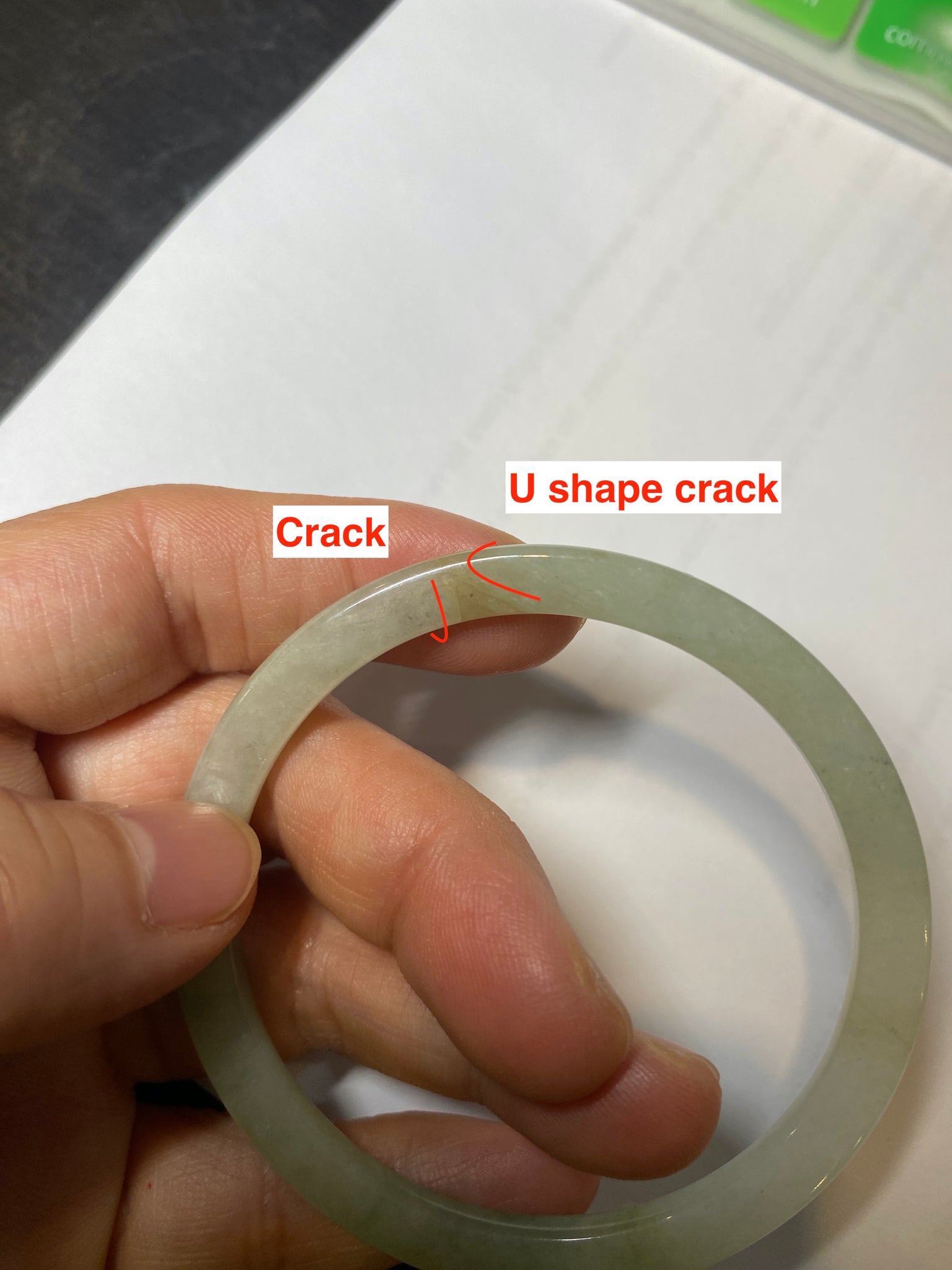 Two cracks. They are very close but not connected. They are not around the bangle crack nor cut through the bangle crack. The bangle is still firm and makes a high-pitched sound when clicked. No hairline. Some cotton lines.