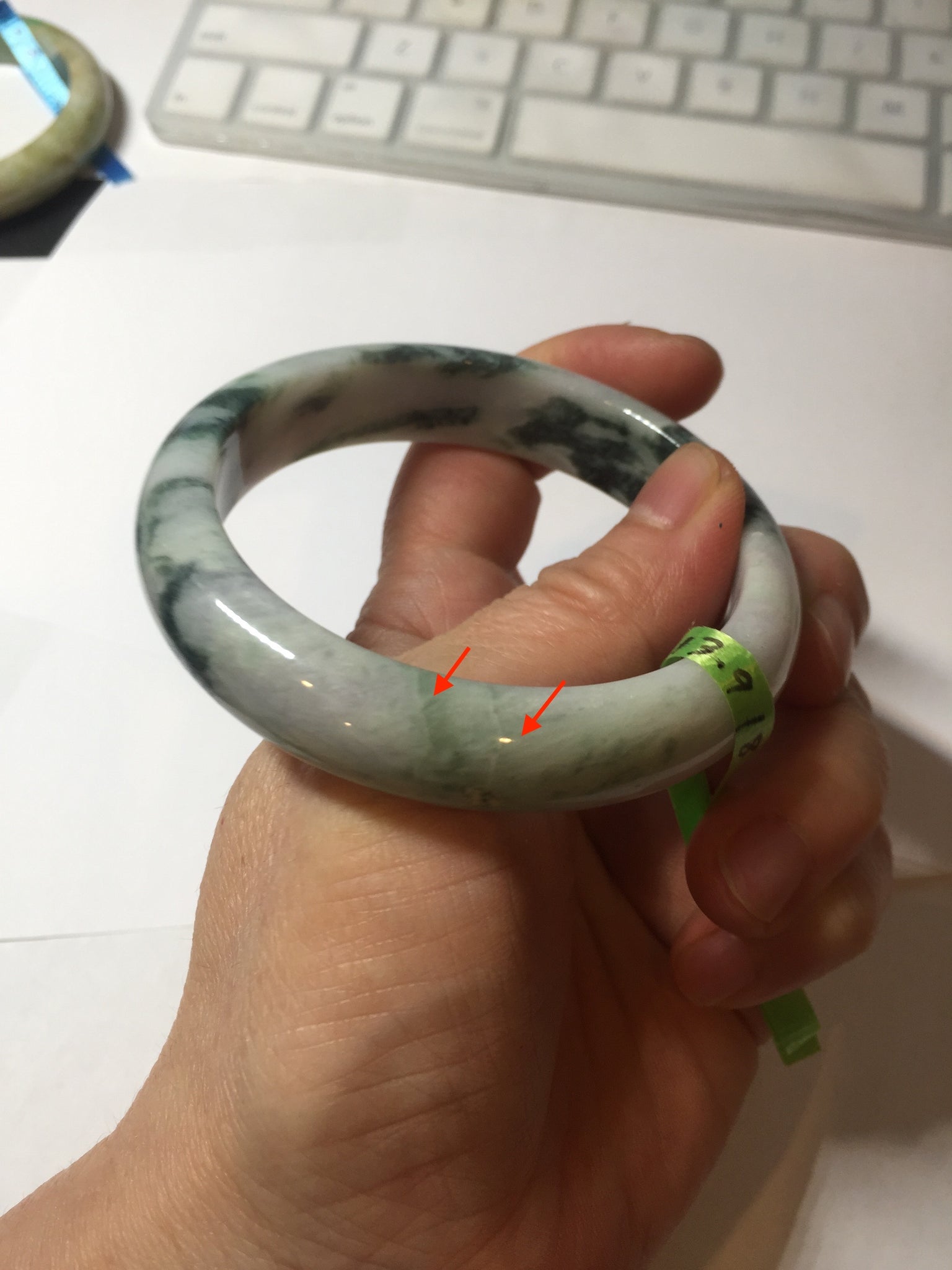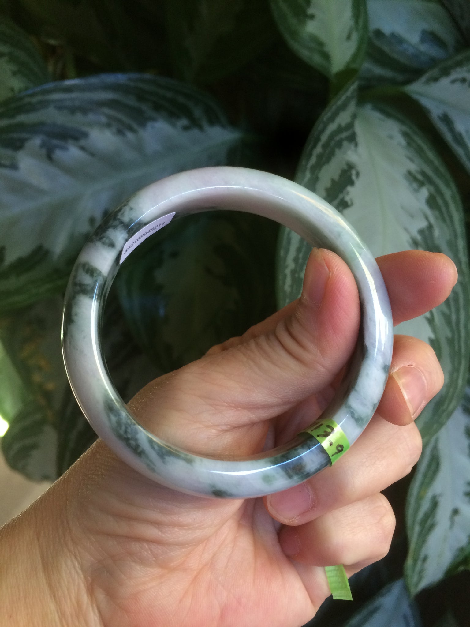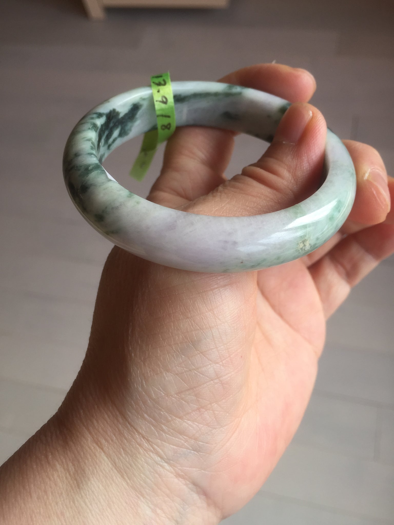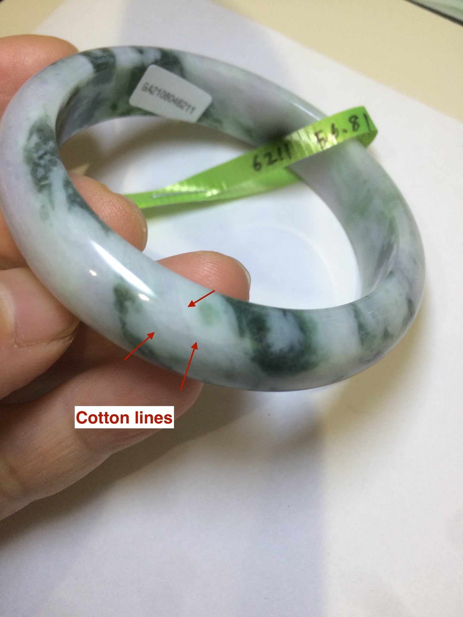 No crack. No hairline. Quite a lot of cotton lines, are called "white roots". It commonly appears when a jadeite jade has a purple color. No transparent. Not so waterly. The purple is really light. Lighter than photos since purple is always more camera-friendly.