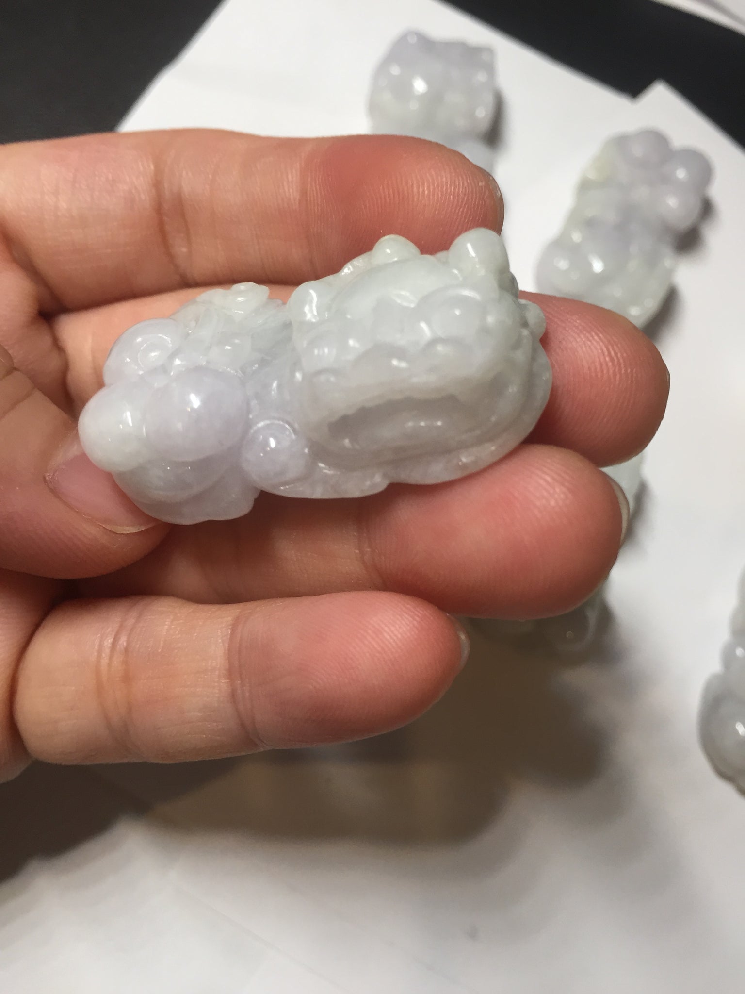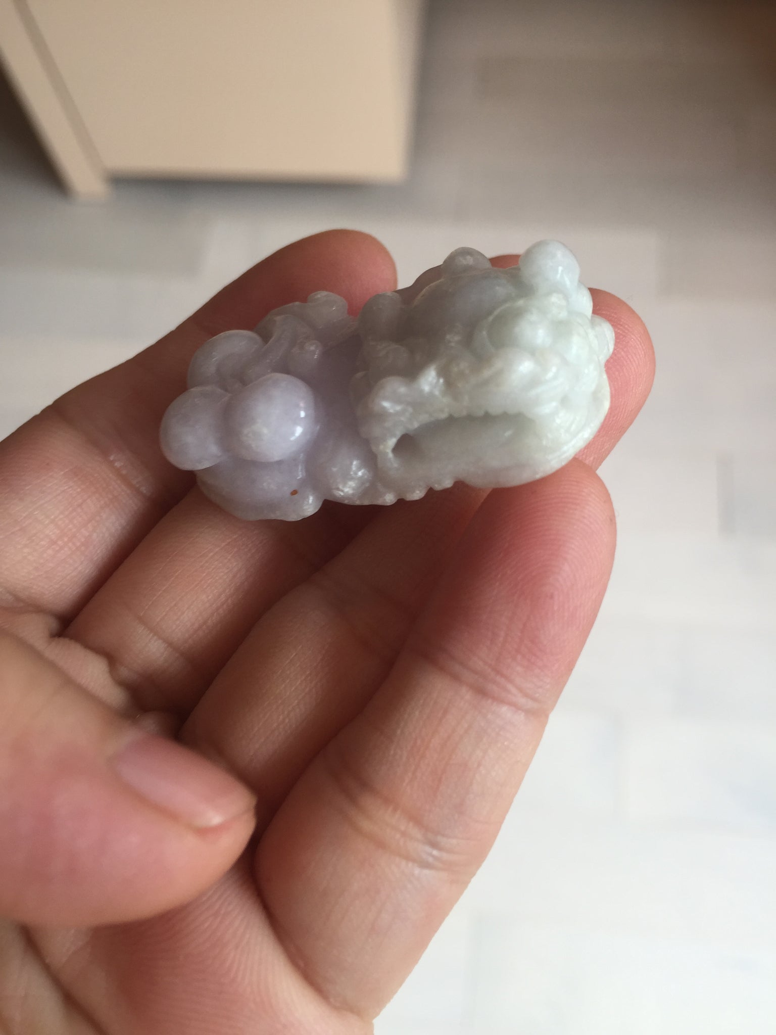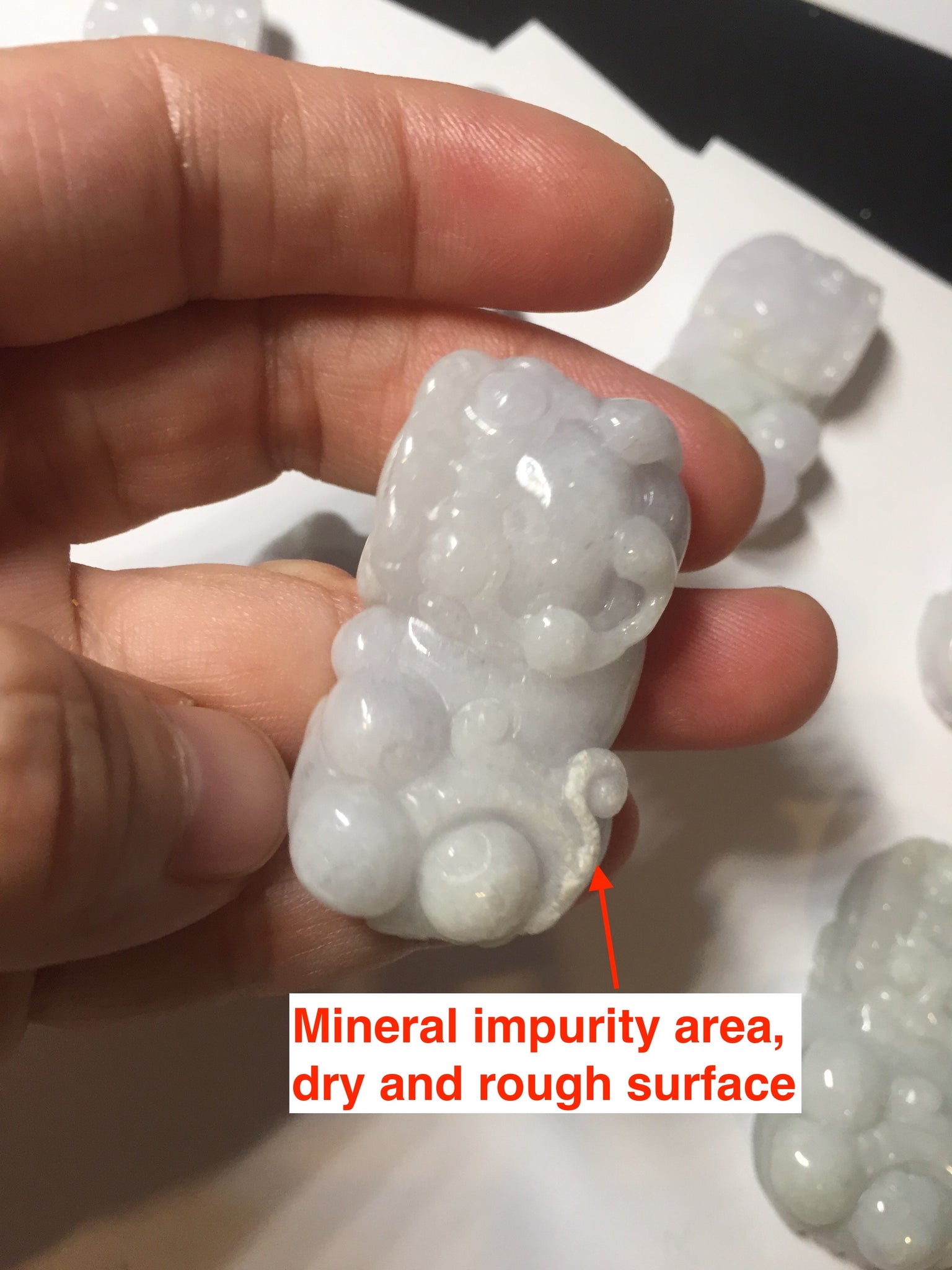 The carving is not so delicate. The PiXIu is kind of flat style. No crack. May have some mineral impurity areas, and dry and rough surfaces. Cotton spots, lines, and areas. The purple is lighter than in the photos due to the purple color always being more camera-friendly.