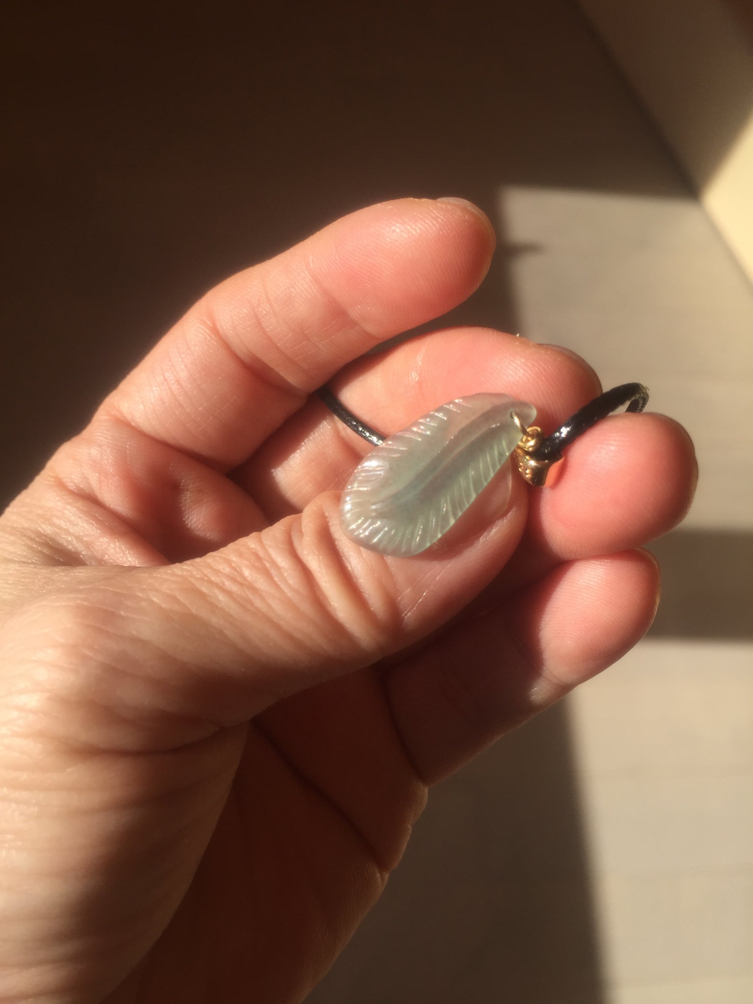 This natural Type A jadeite pendant is beautifully hand-carved into the shape of a delicate feather — a symbol of freedom, hope, lightness, and spiritual protection.