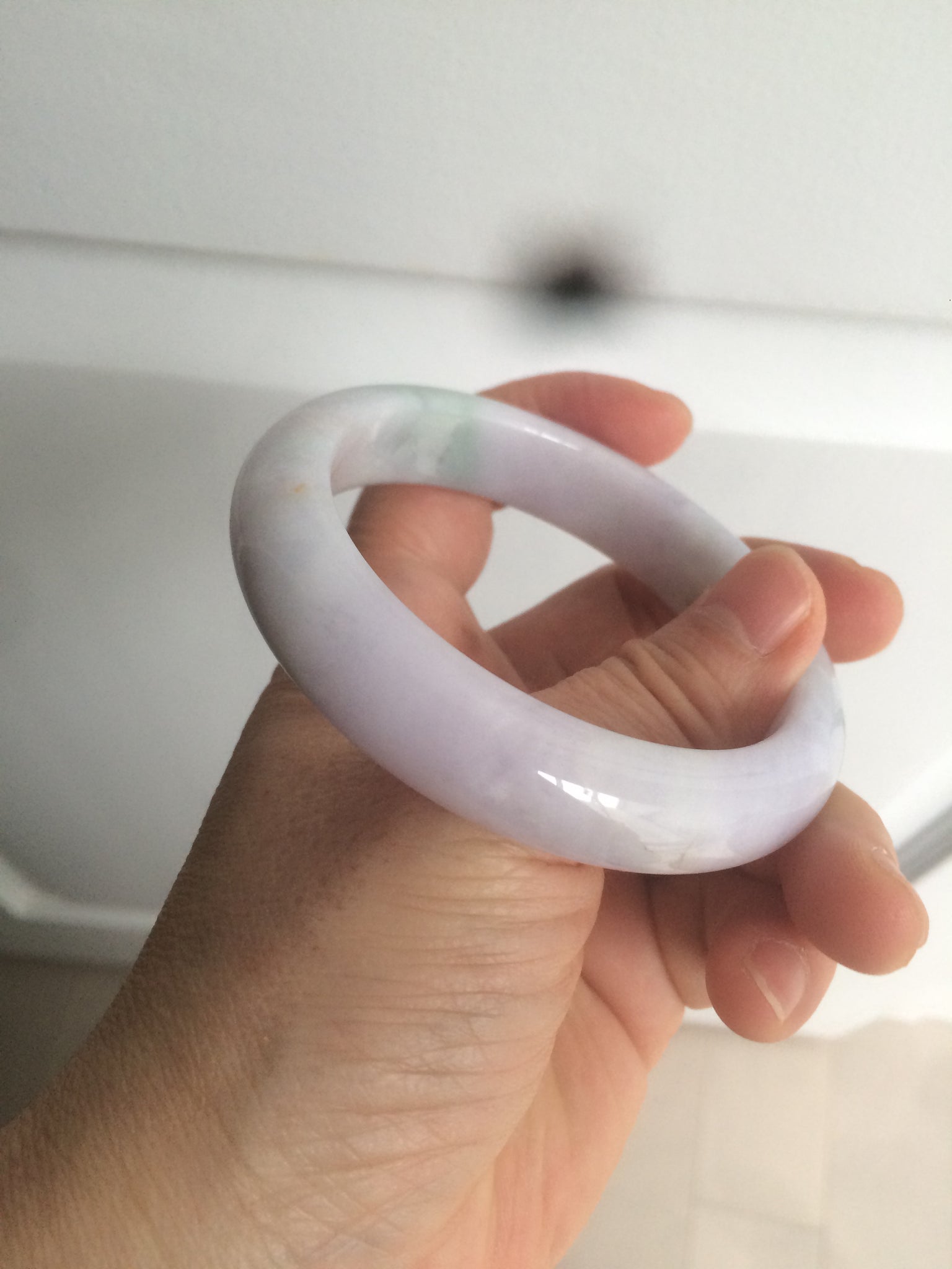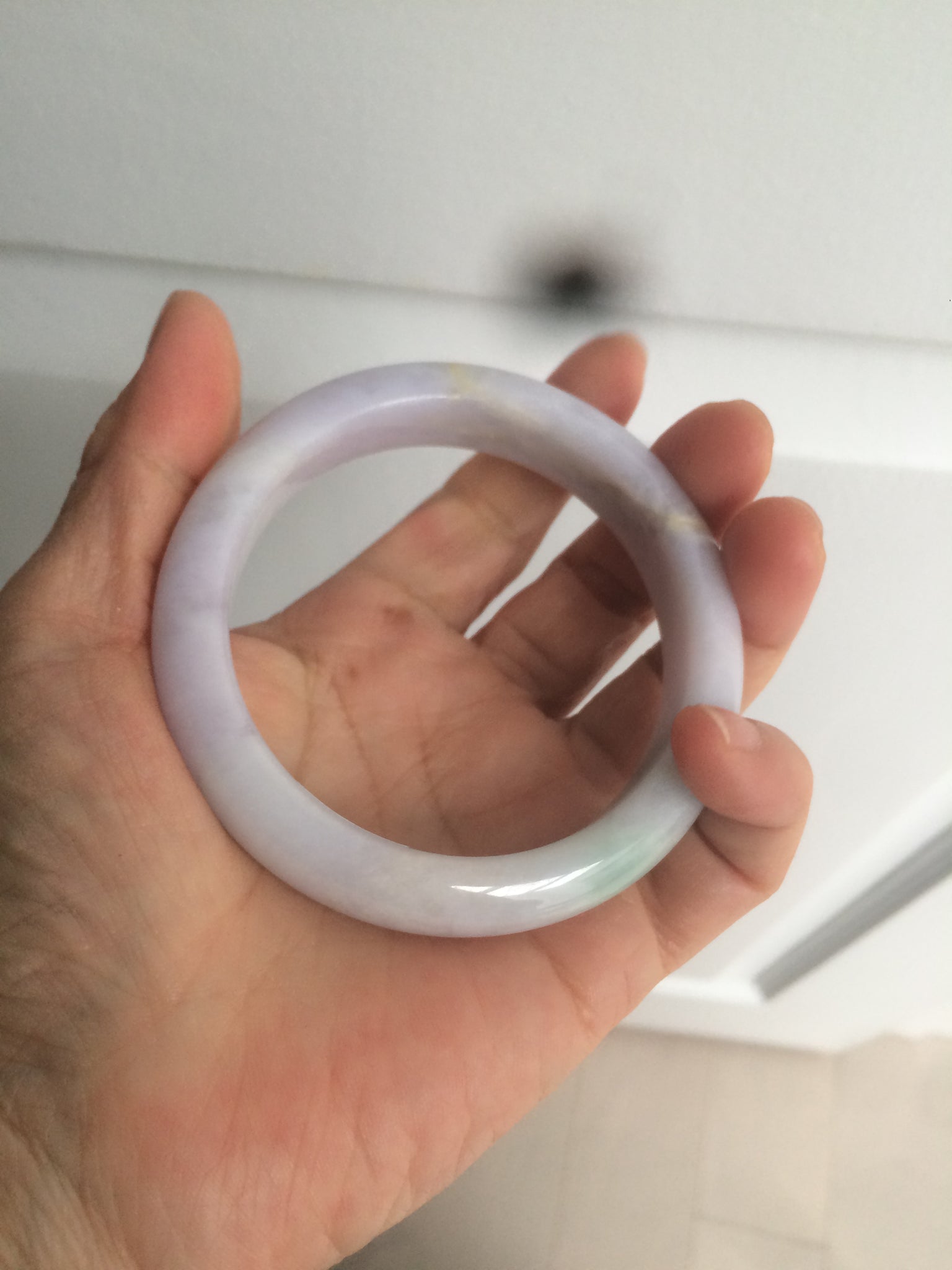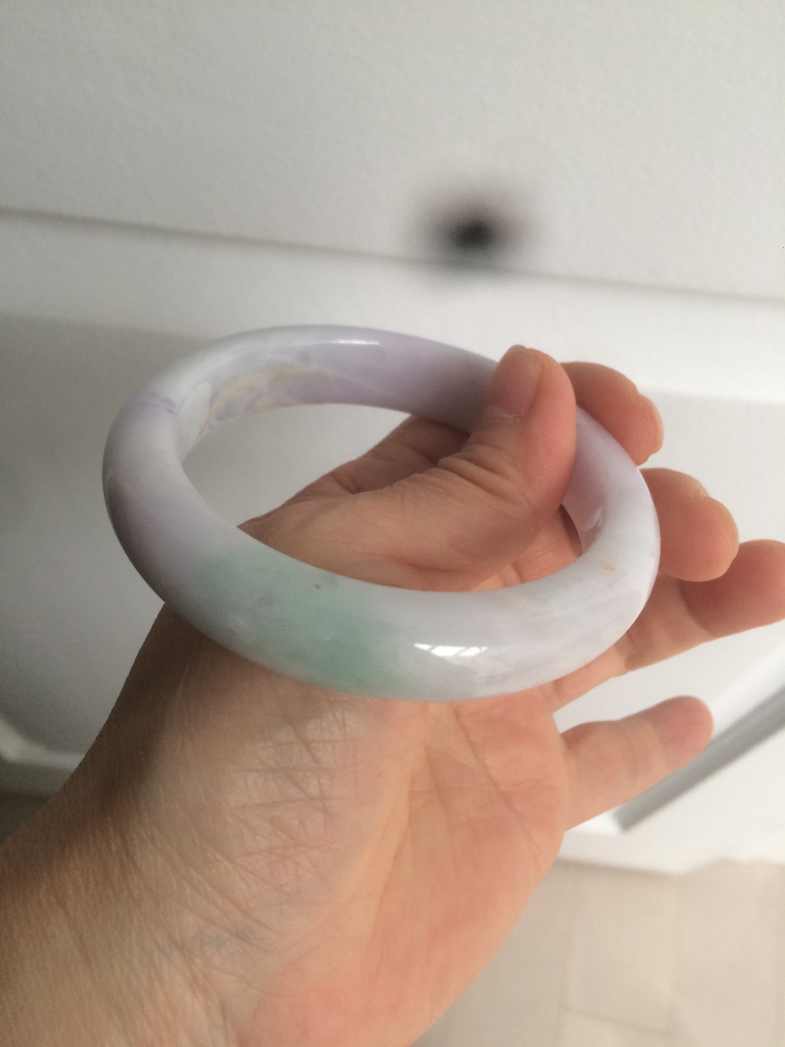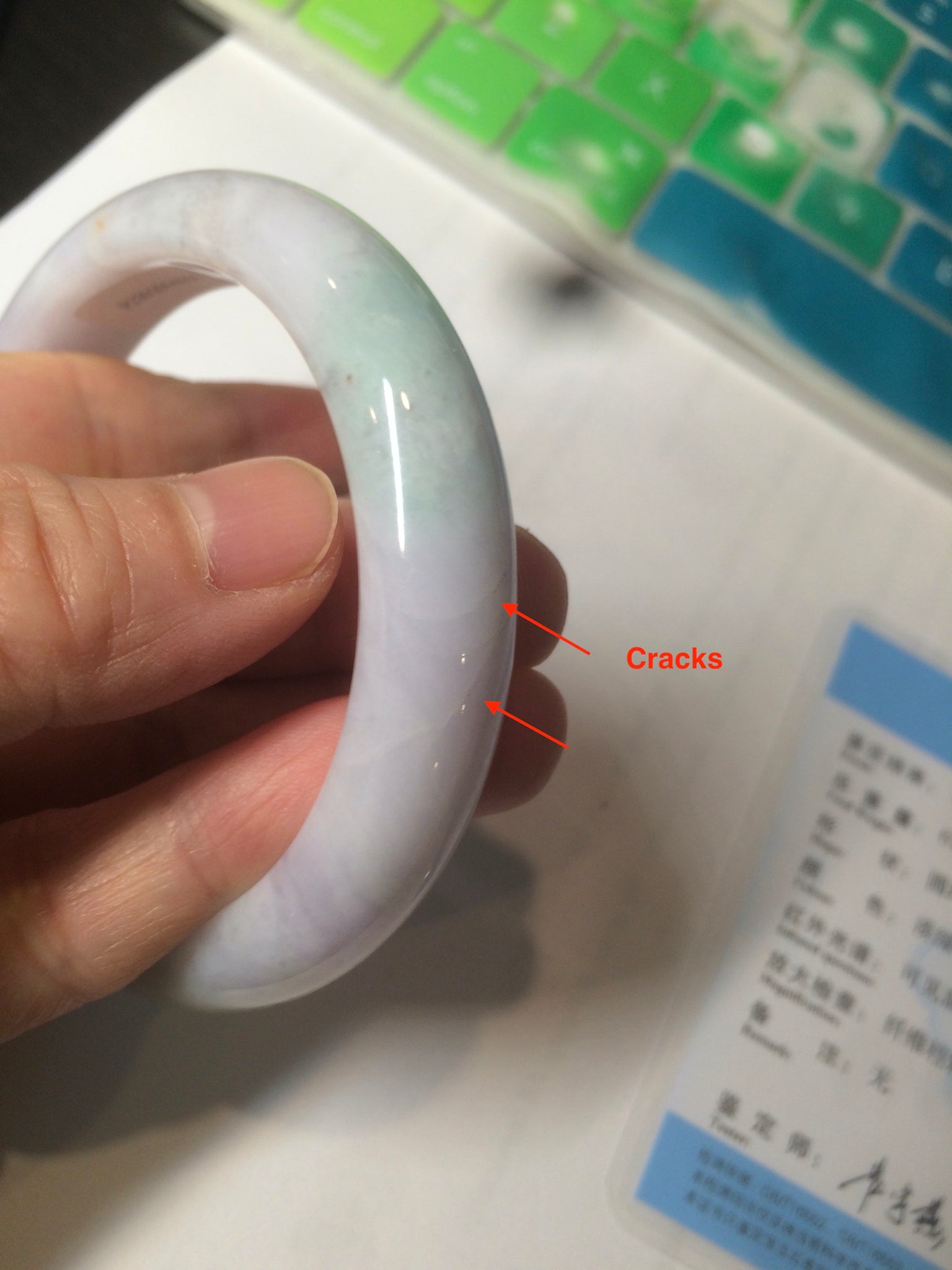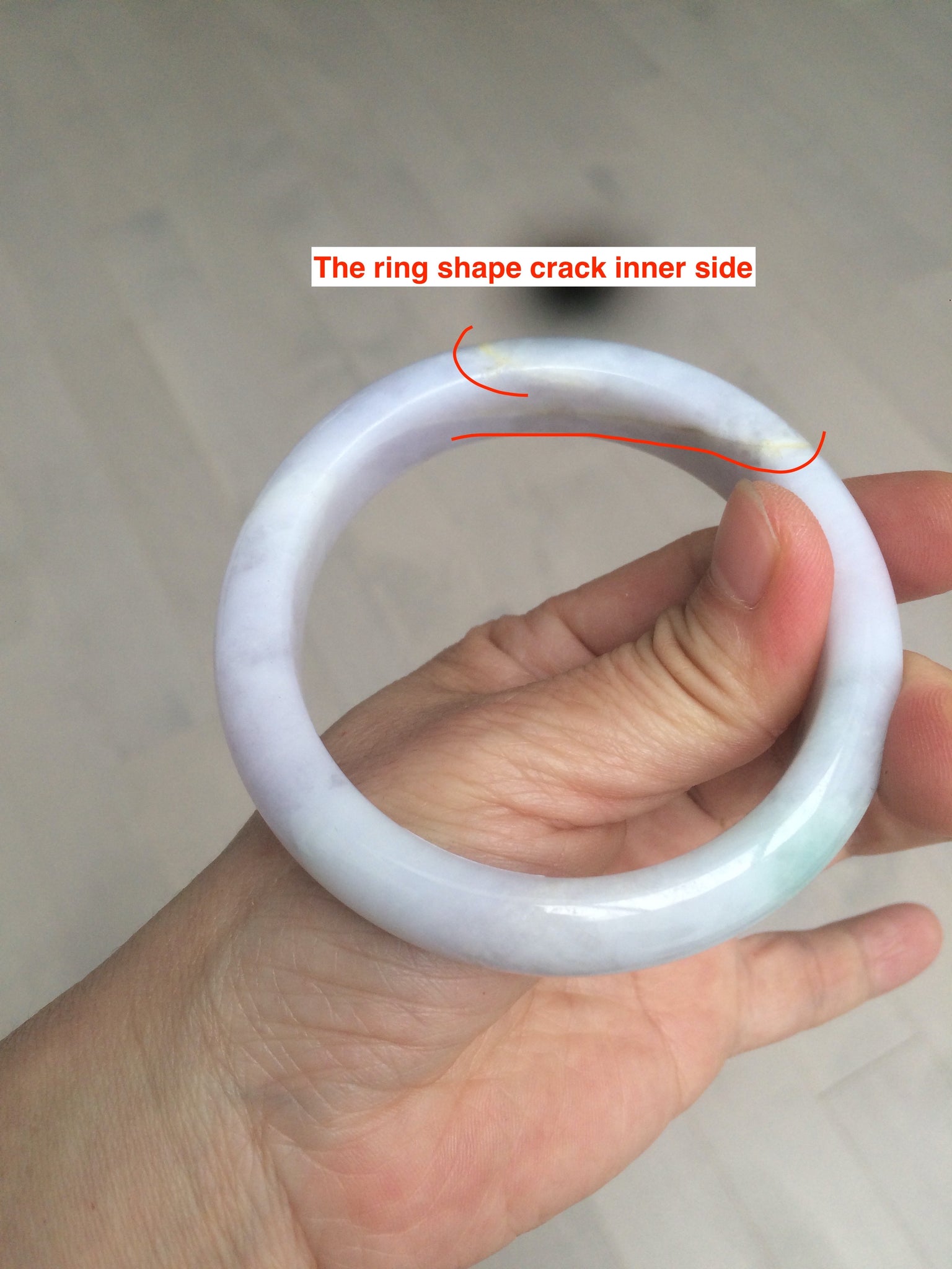 Some cracks and hairlines(photos may not show all). One of the cracks is ring shape with wax. The bangle is still form. Cotton areas and cotton spots. The purple is lighter than in the photos due to purple is always camera-friendly.