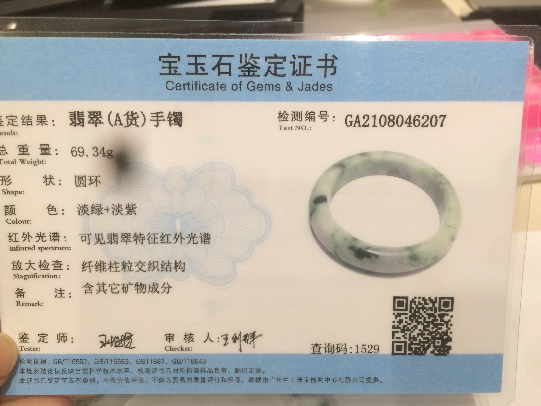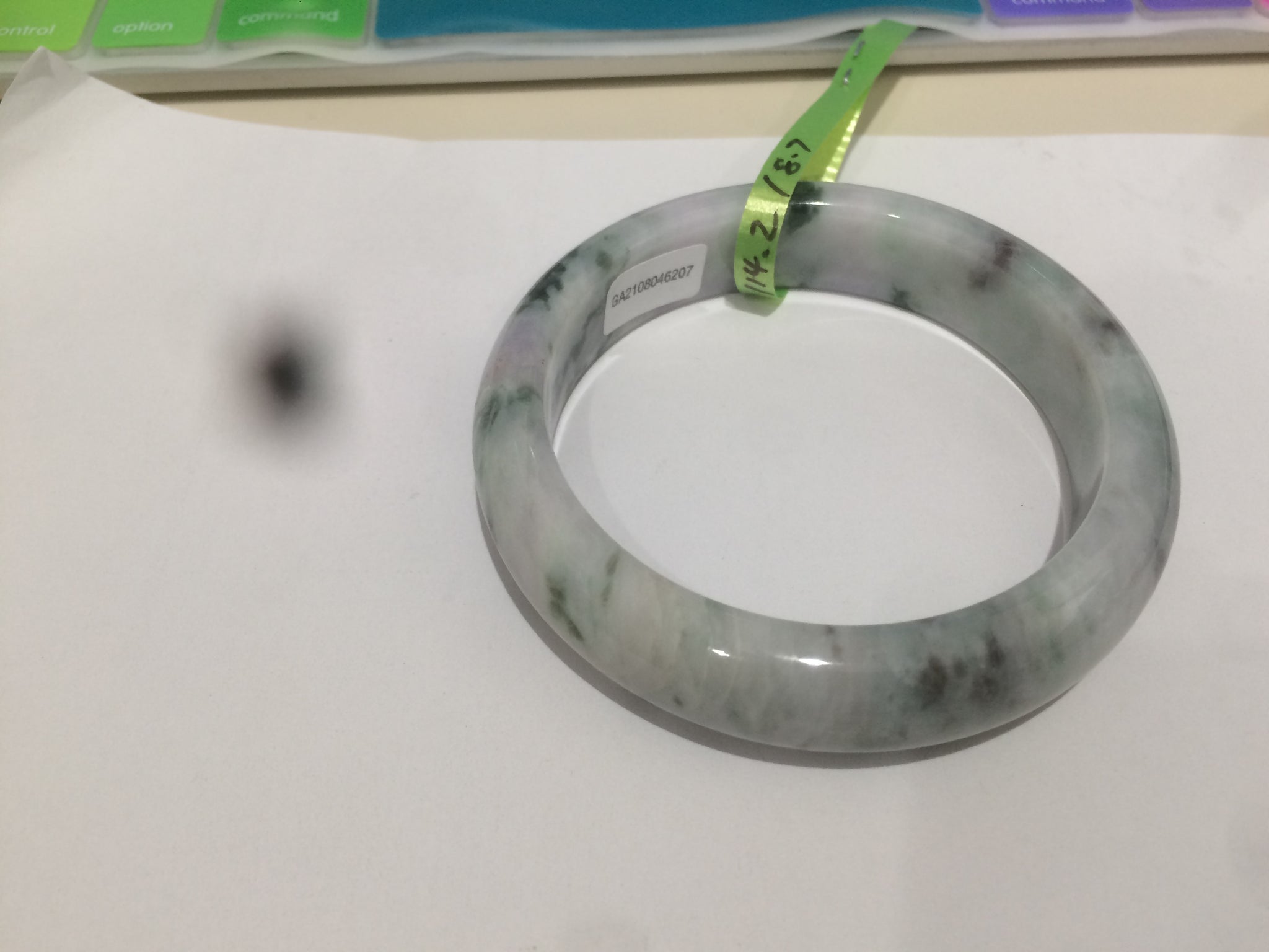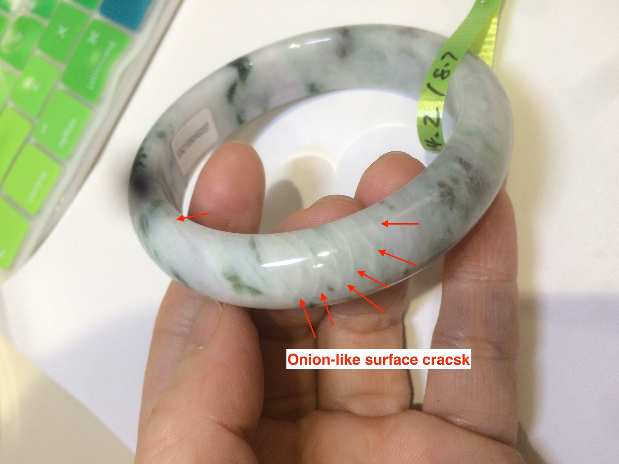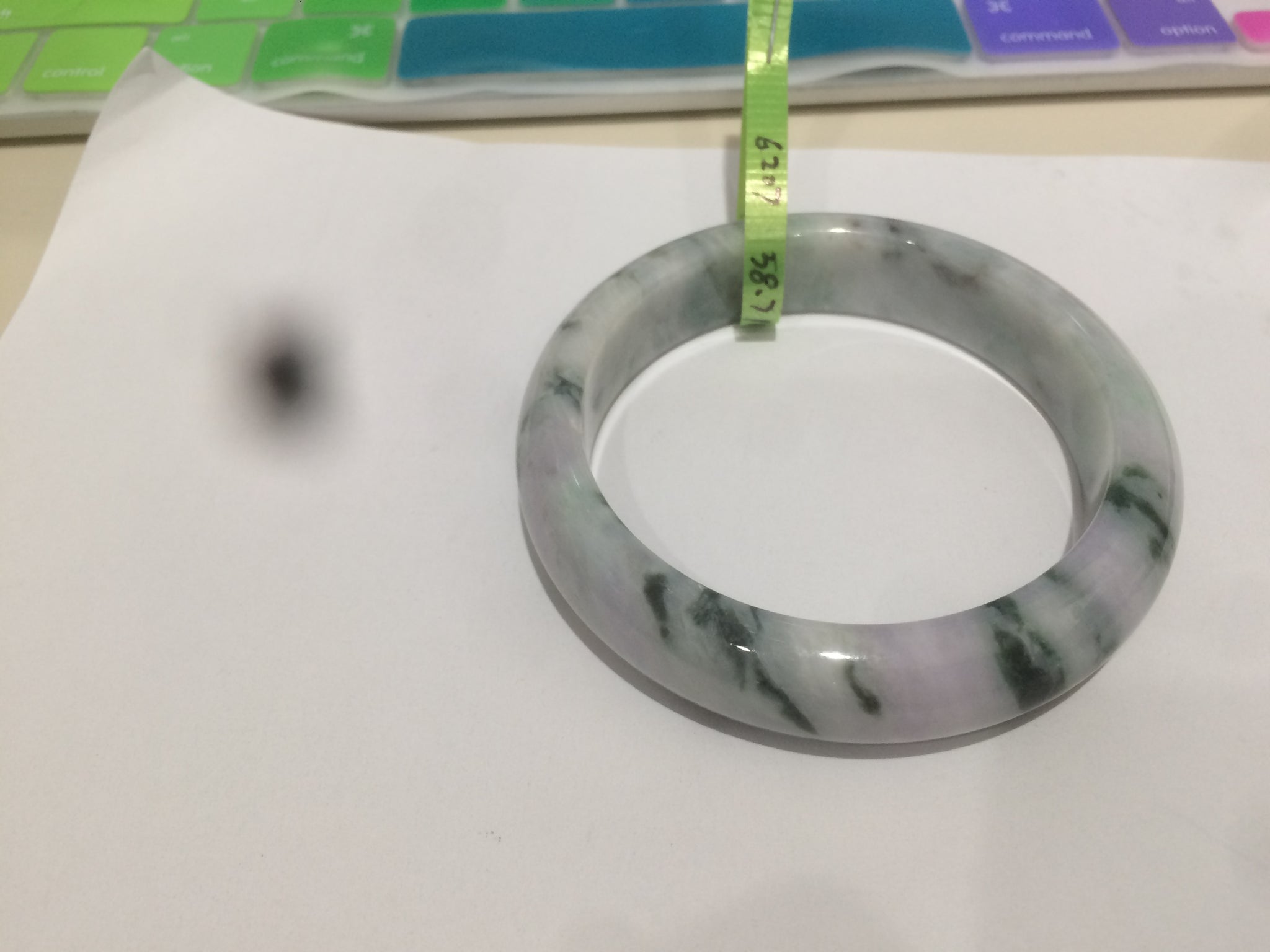 Quite a lot of surface cracks, hairlines, and cotton lines(photos may not show all due to the space limit). But All won't influence the firmness. The bangle is still firm. Some black/dark purple spots or areas. Not transparent. Medium watery. The purple is lighter than the photos due to the purple always camera-friendly.